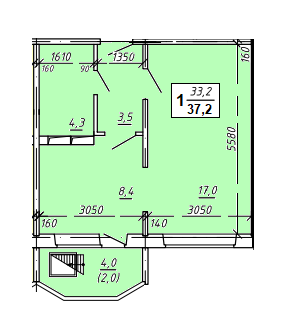 1-комн. квартира общей площадью 37,4м2, жилая 33,2м2( балкон по 4м2).