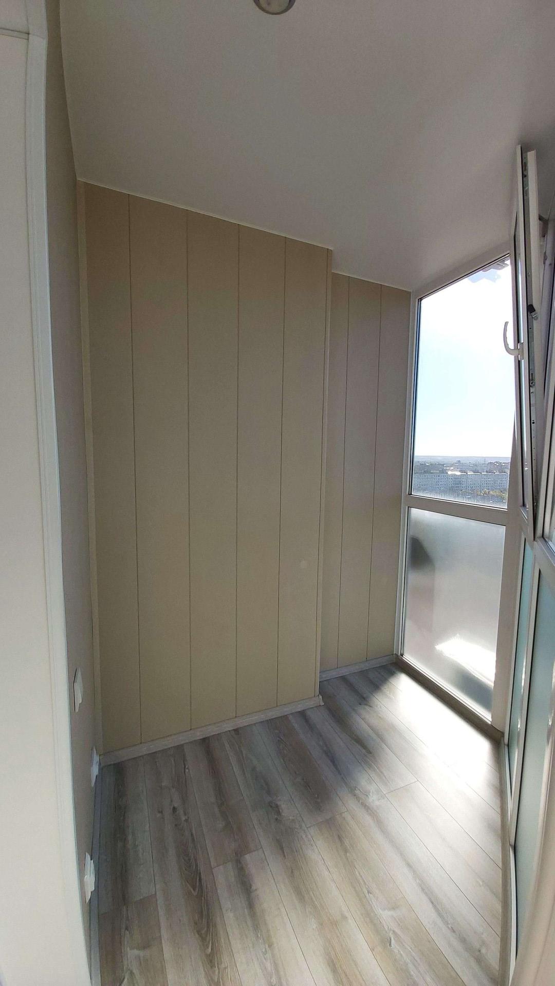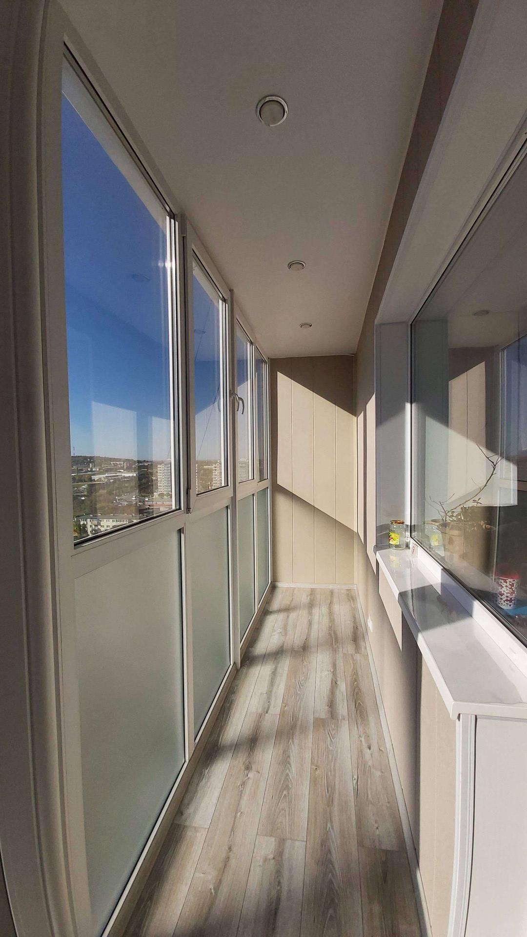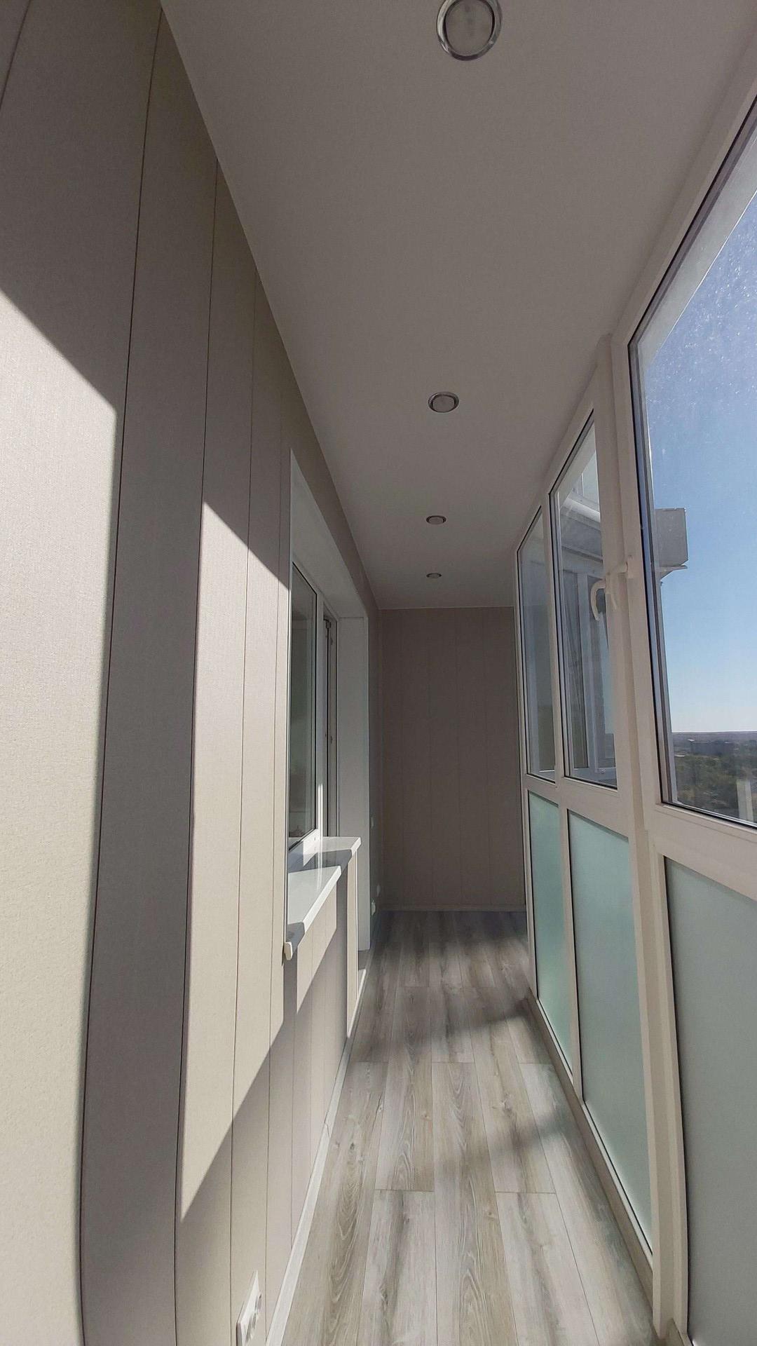 Балкон хорошо утеплён, полы с подогревом, витражное остекление, софиты.