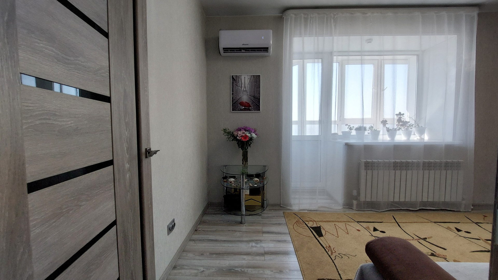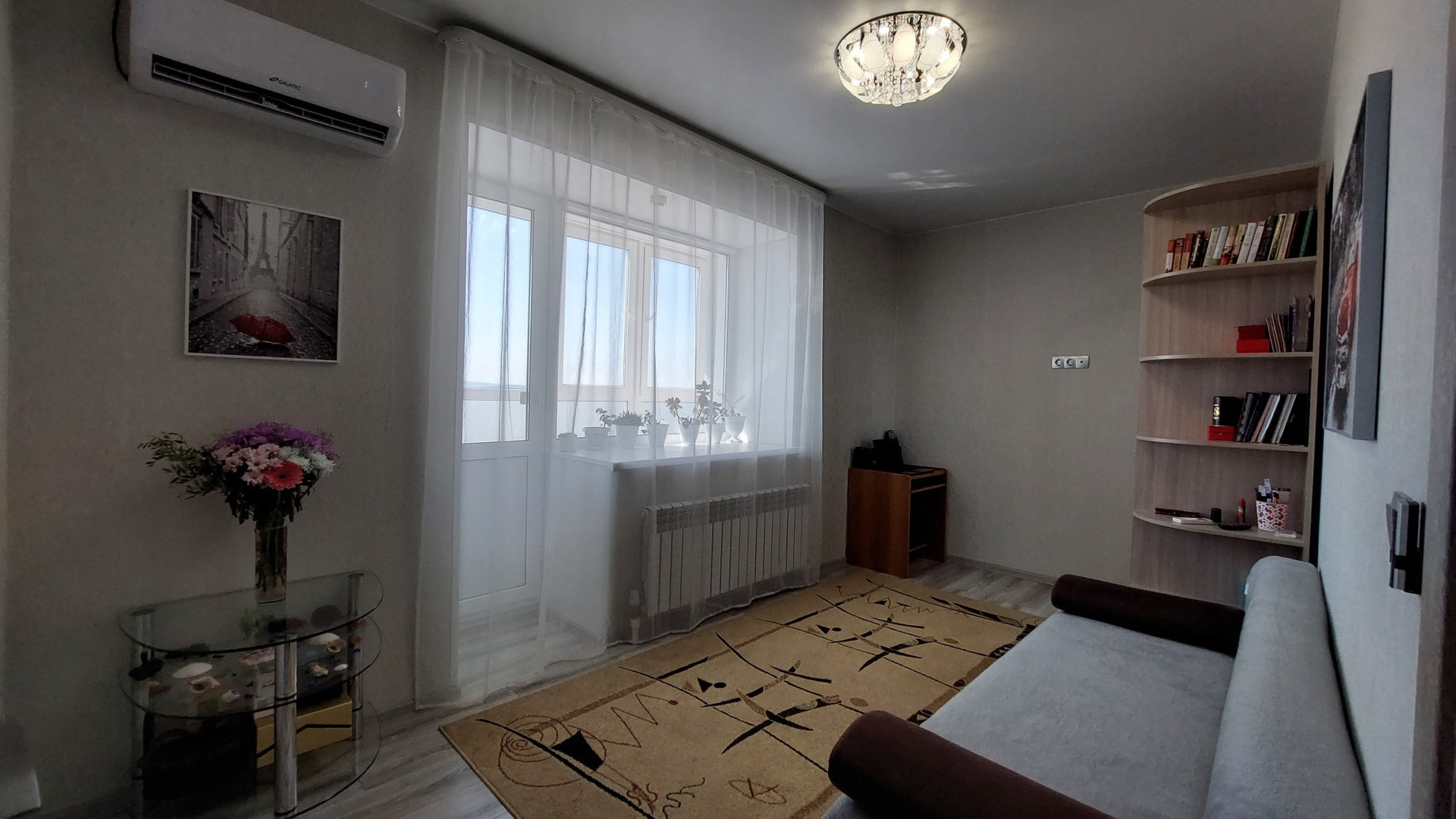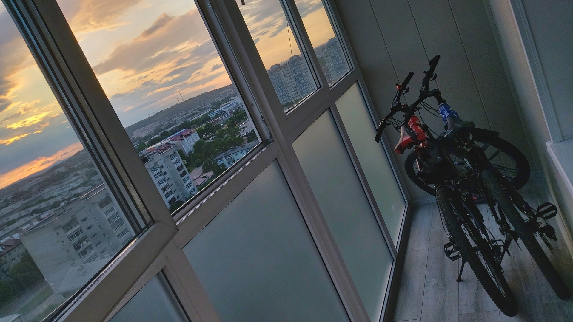 Балкон хорошо утеплён, полы с подогревом, витражное остекление, софиты.