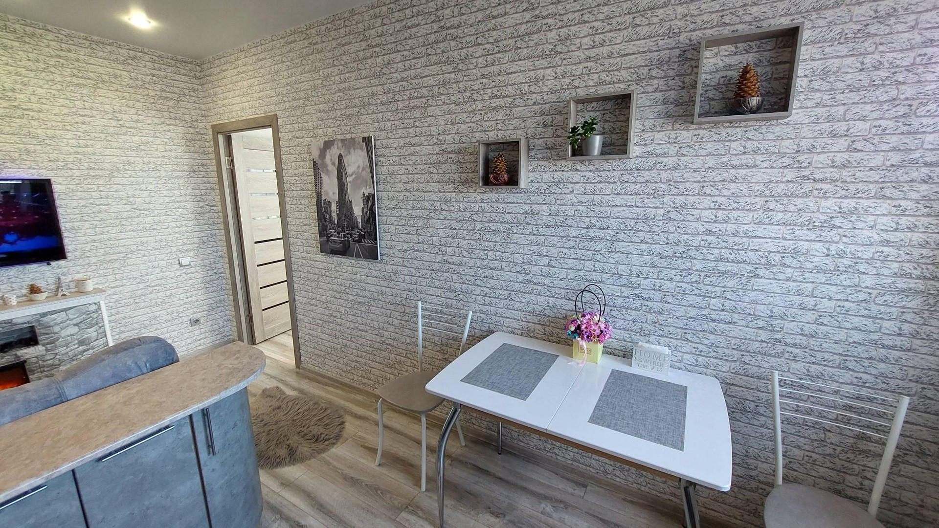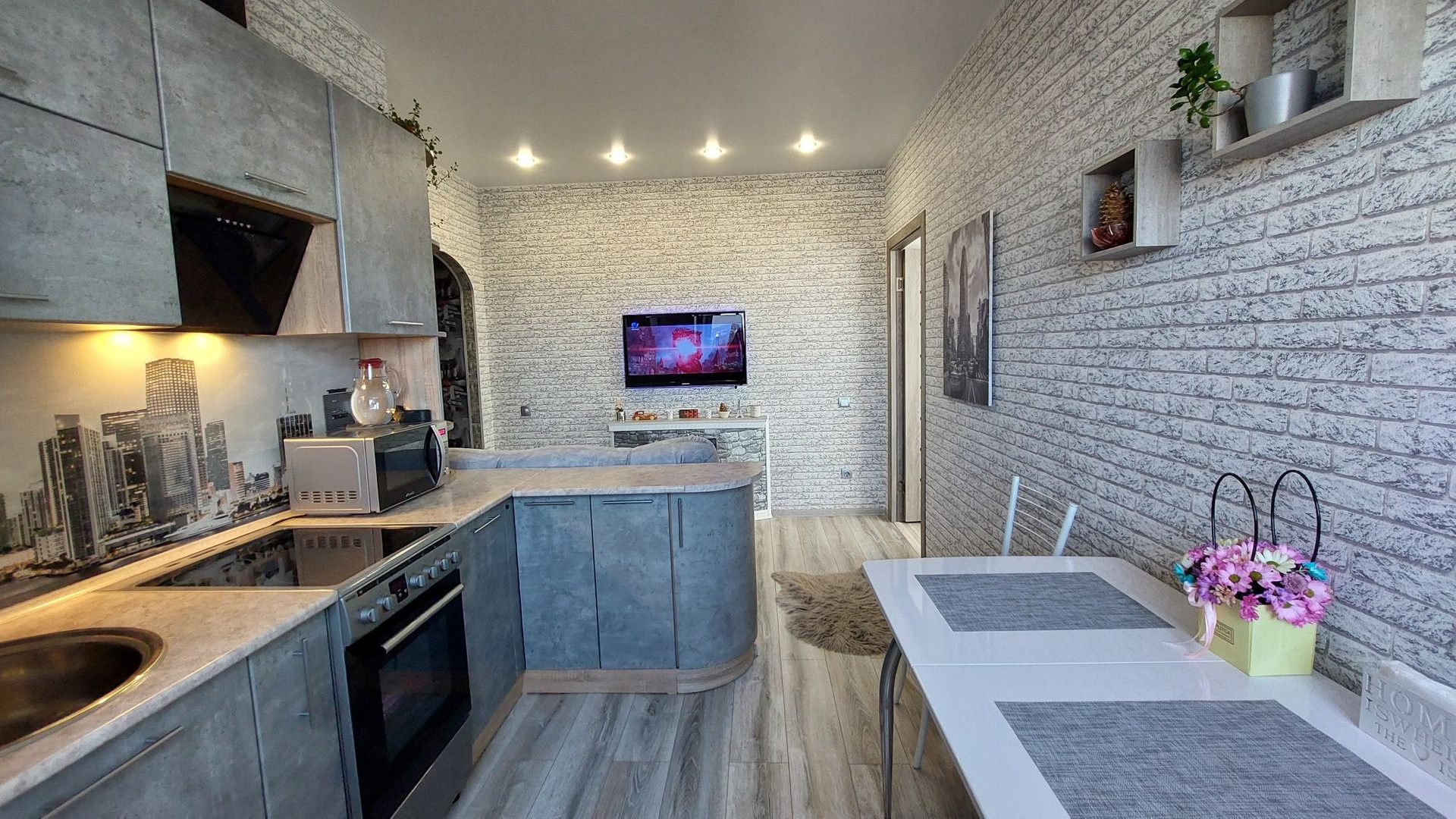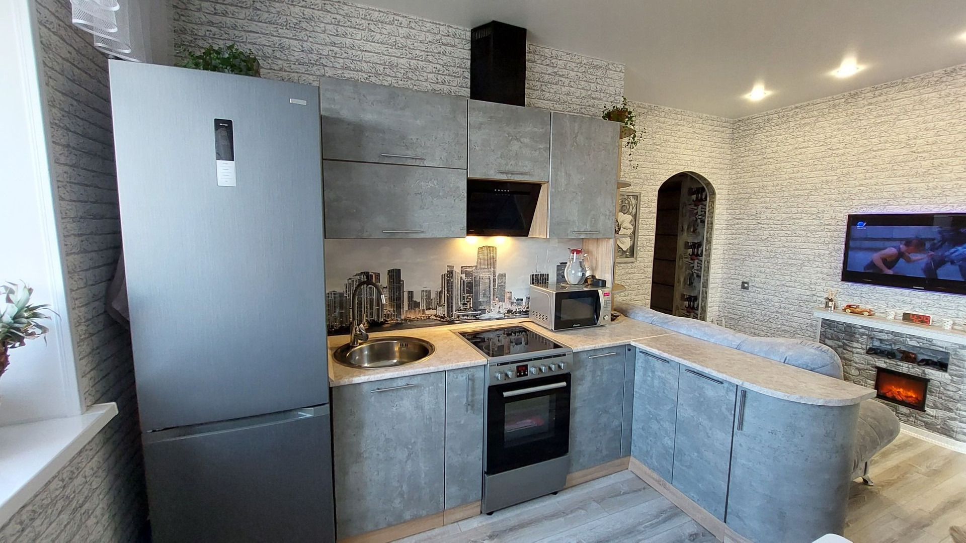 Кухня с гостинной совмещены.
