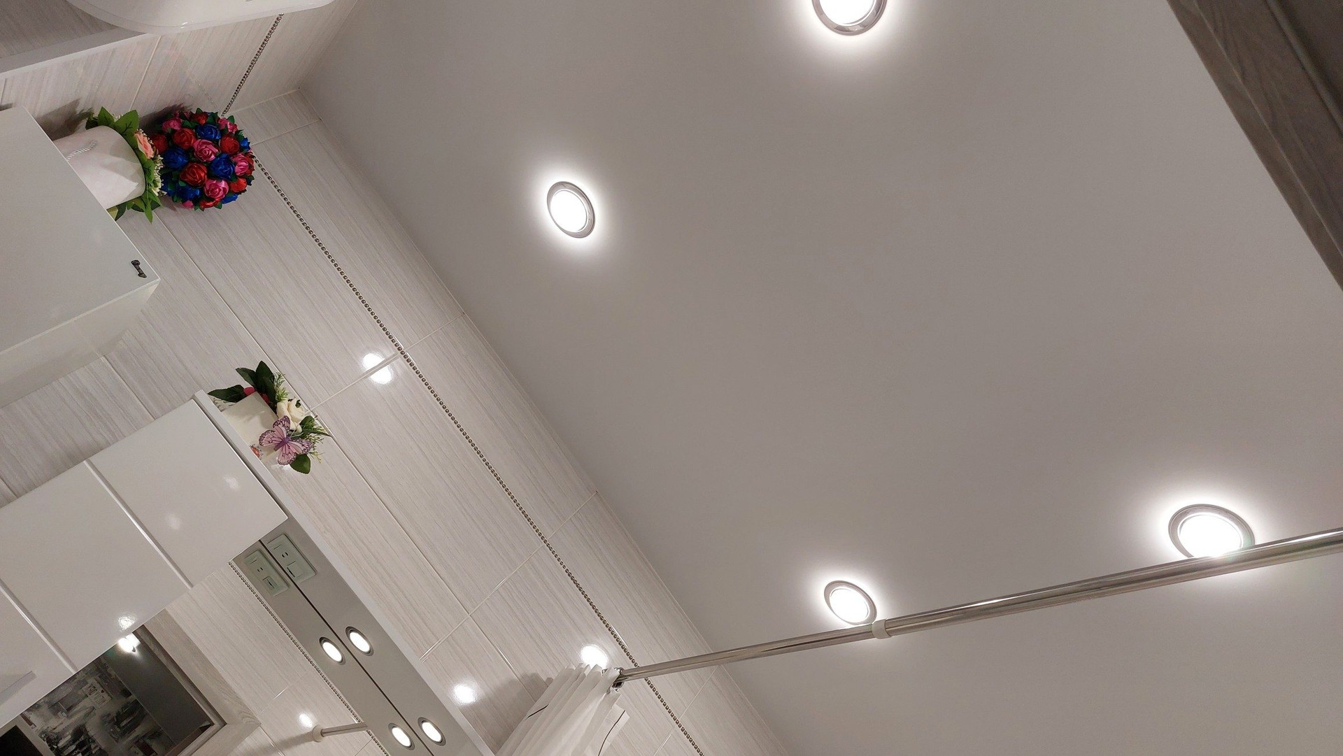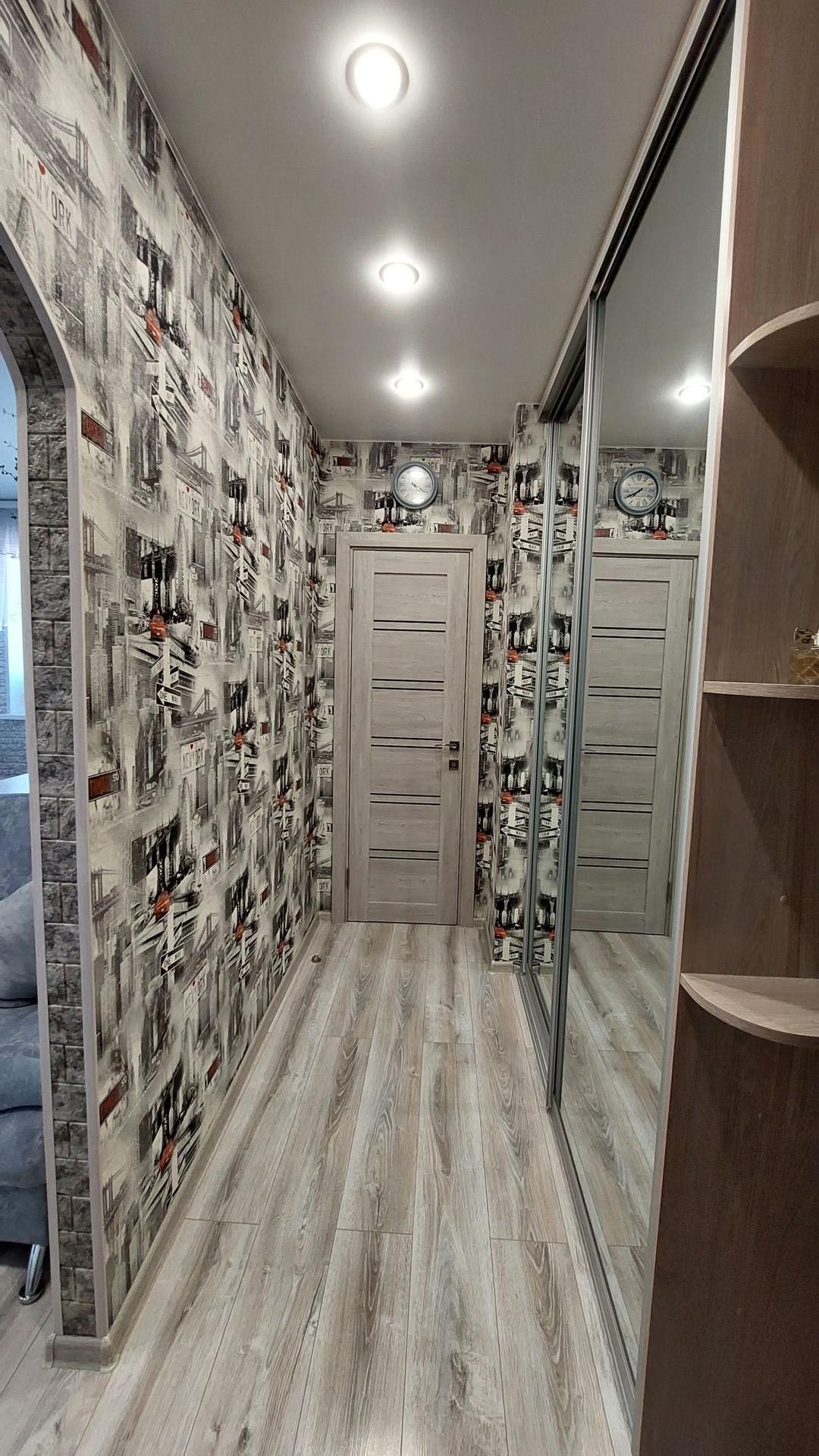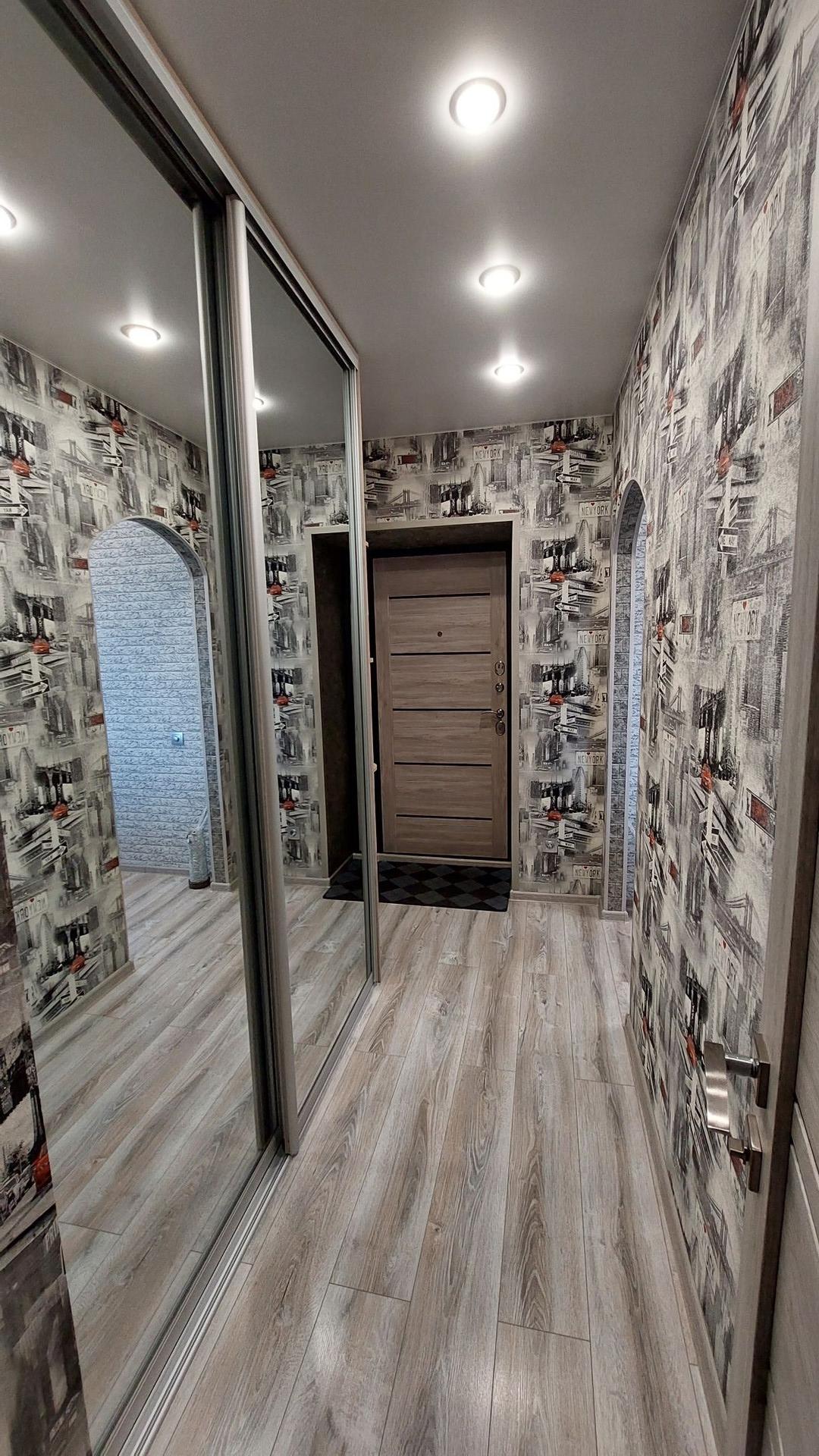 В прихожей большой встроенный шкаф-купе, софиты.