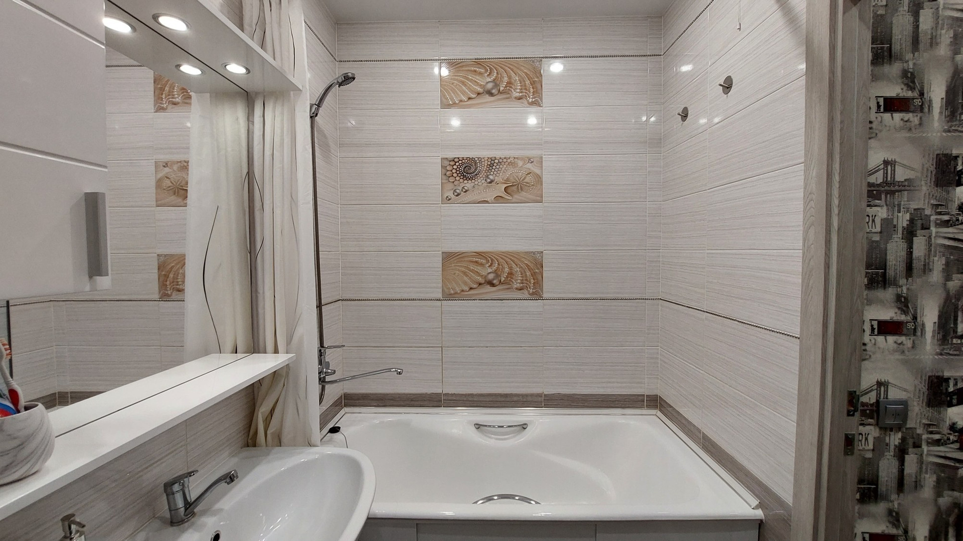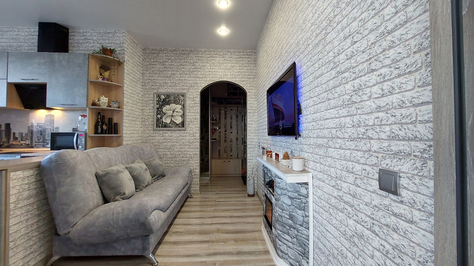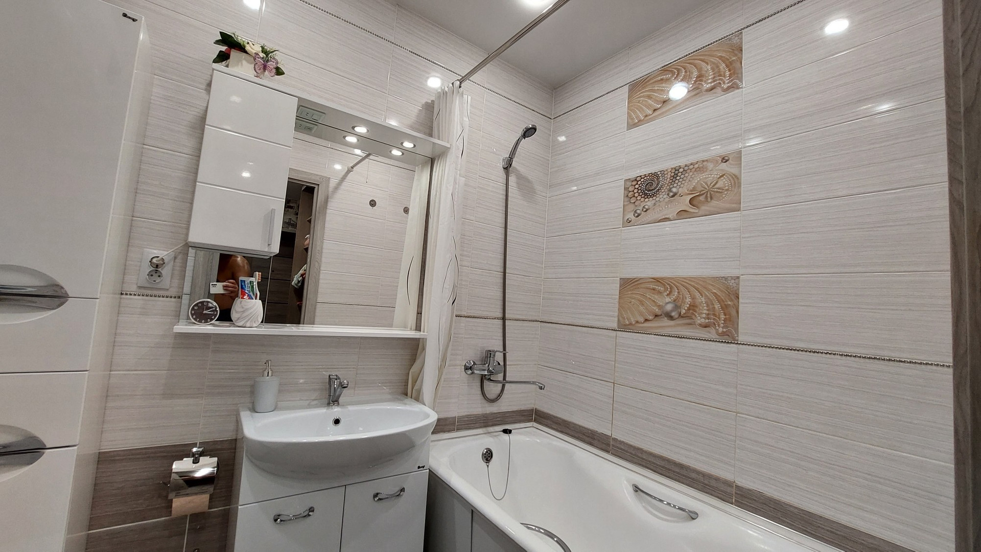 В прихожей большой встроенный шкаф-купе, софиты.