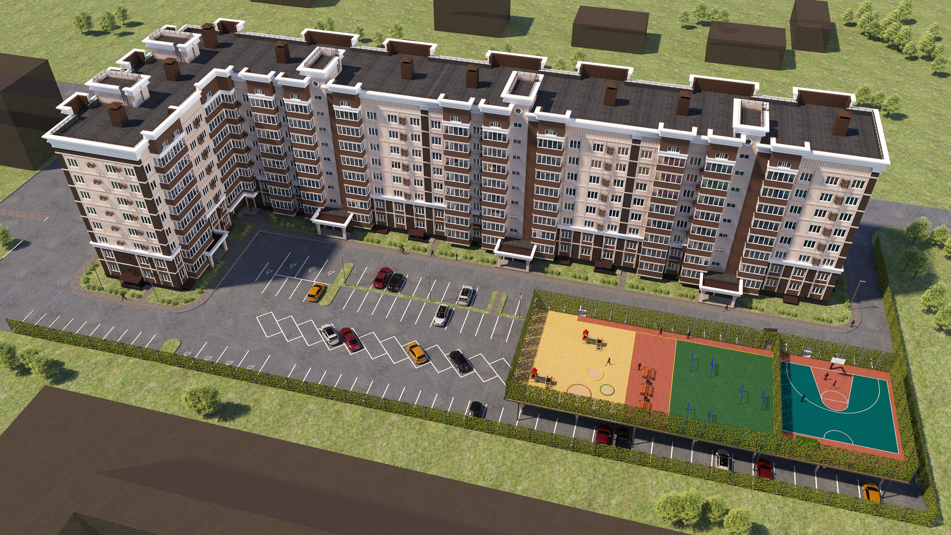 - надземное устройство с детской площадкой (площадь 300 кв.м.), спортивной площадкой, состоящей из трех секции для занятия различными видами спорта и отдыха (площадь 238 кв.м.), зоной отдыха (площадь 85 кв.м.) и хозяйственной зоной (площадь 226 кв.м.).