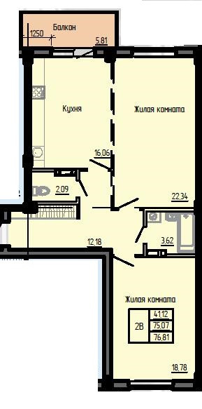 2 - комнатная квартира площадью: 64,85 кв.м., 65,59 к.в.м., 70,43 кв.м., 70,44 кв.м., 71,98 кв.м, 75,93 кв.м., 75,95 кв.м., 76,81 кв.м., 77,00 кв.м., 81,79 кв.м.