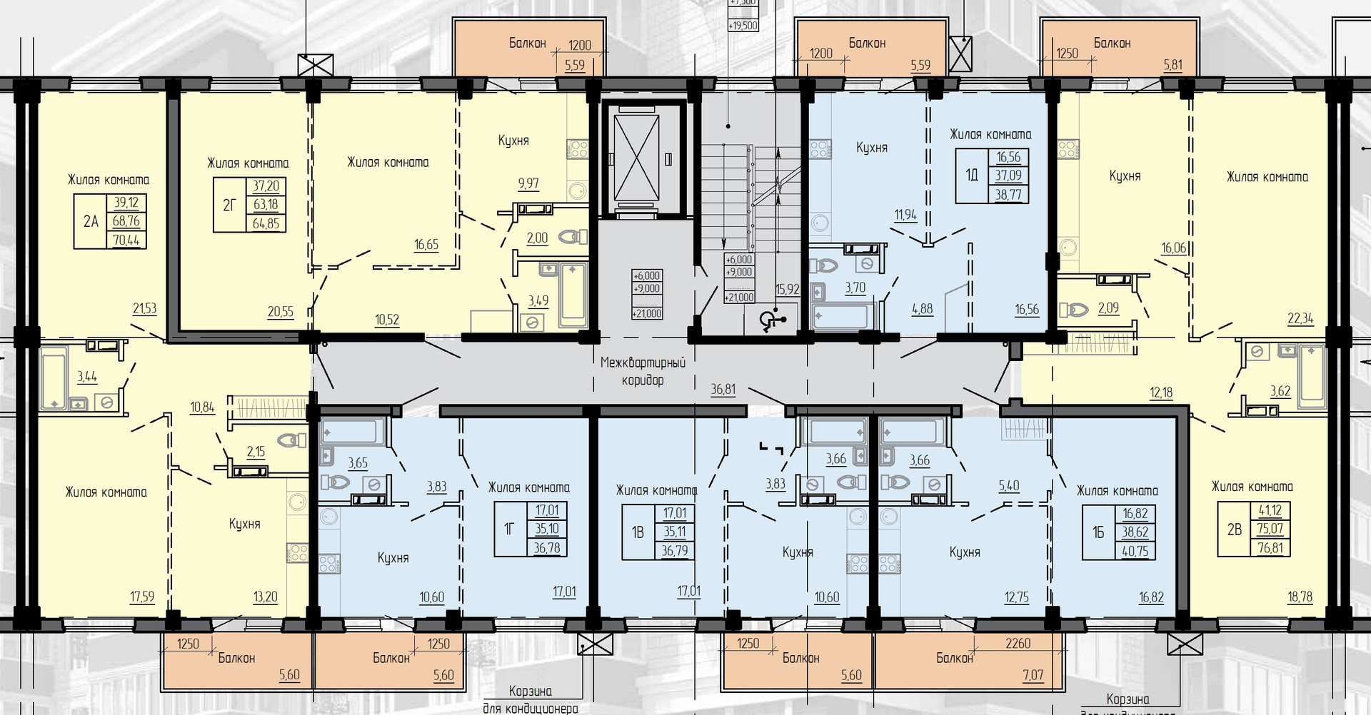 1 - комнатные квартиры площадью: 36,78 кв.м.,36,79 кв.м., 38,77 кв.м., 40,75 кв.м., 43,16 кв.м., 50,96 кв.м., 55,25 кв.м.,