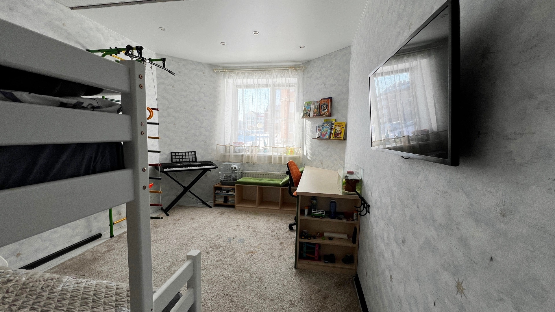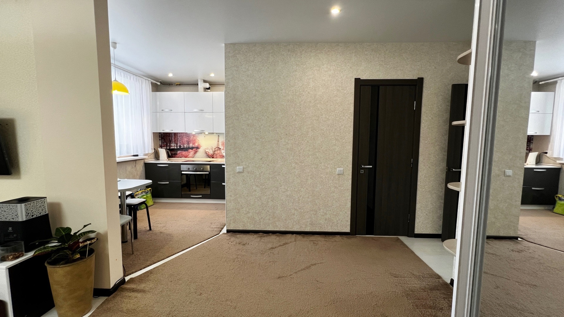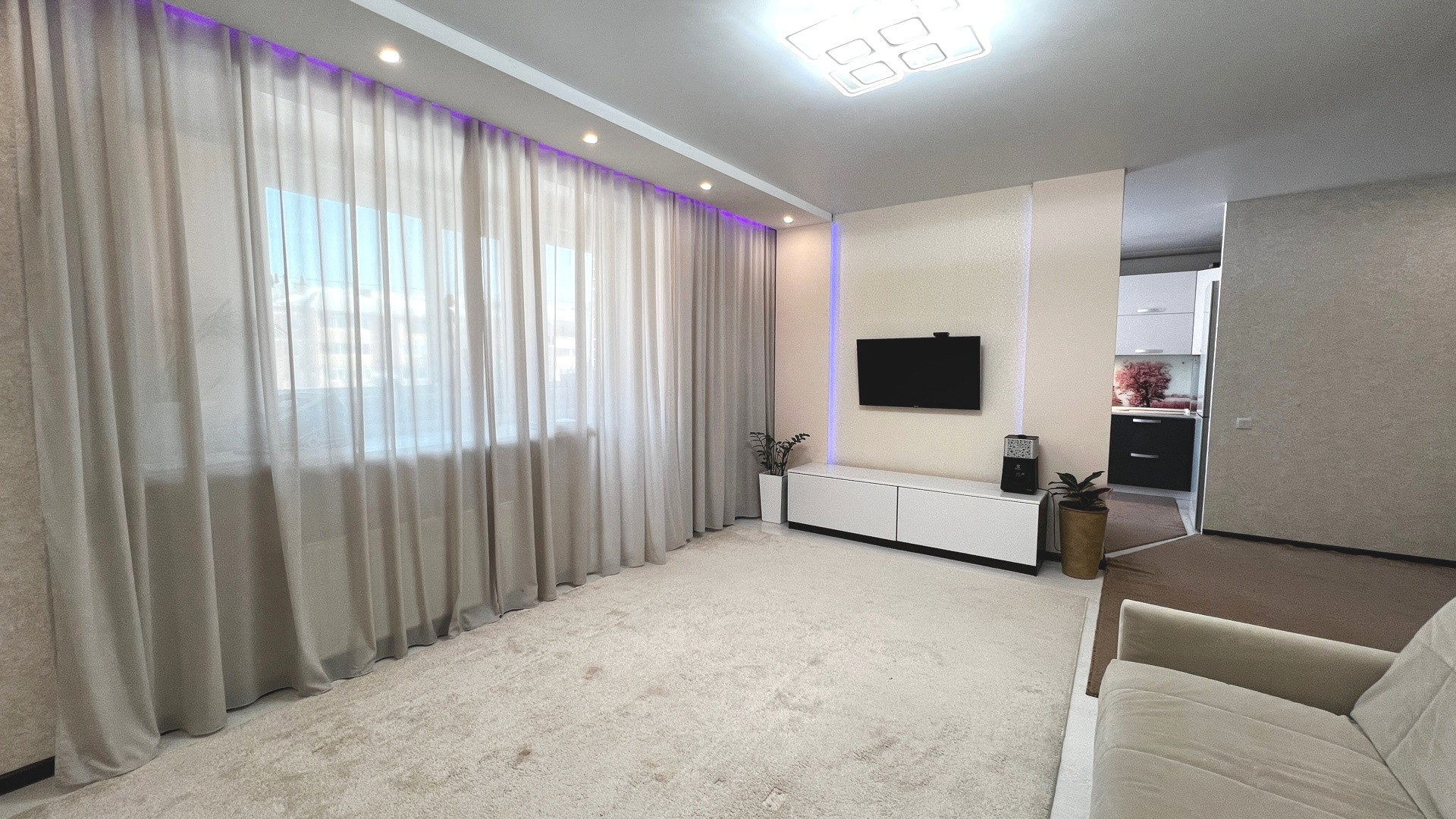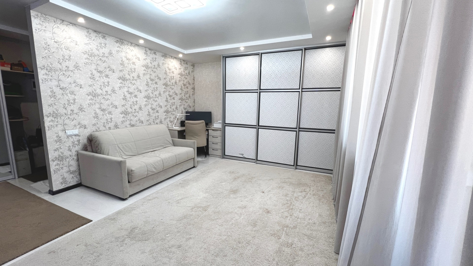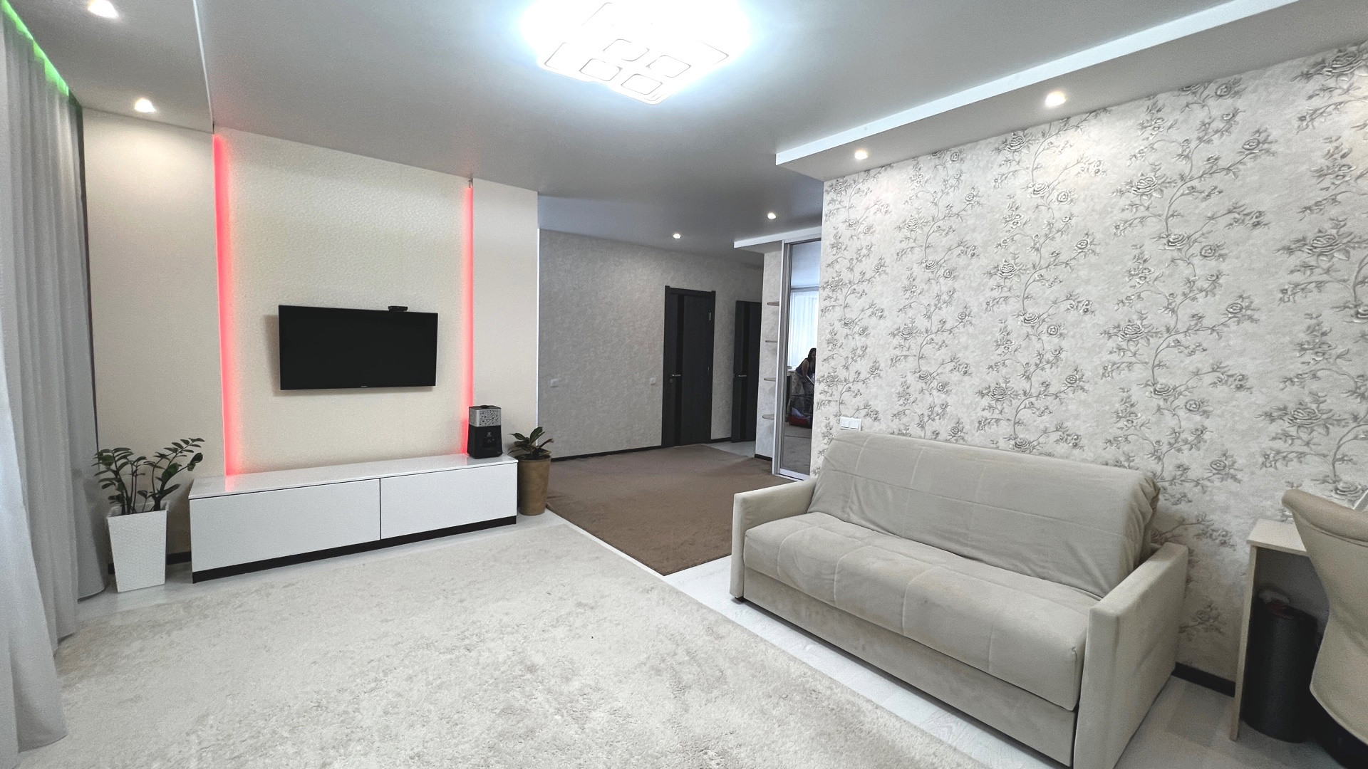 По всей квартире натяжные потолки, софиты, световые линии. На полу ламинат. Межкомнатные двери. Застеклённая лоджия 6 метров, высокий цоколь, сухой подвал. Крыша скатная. Чистый ухоженный подъезд.