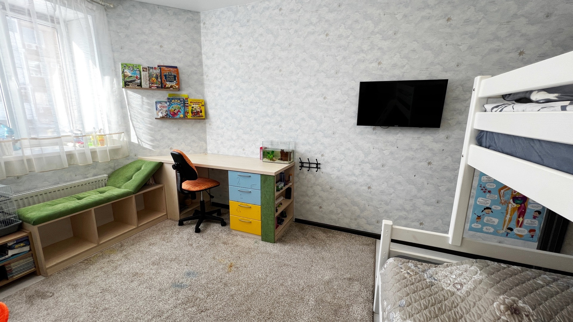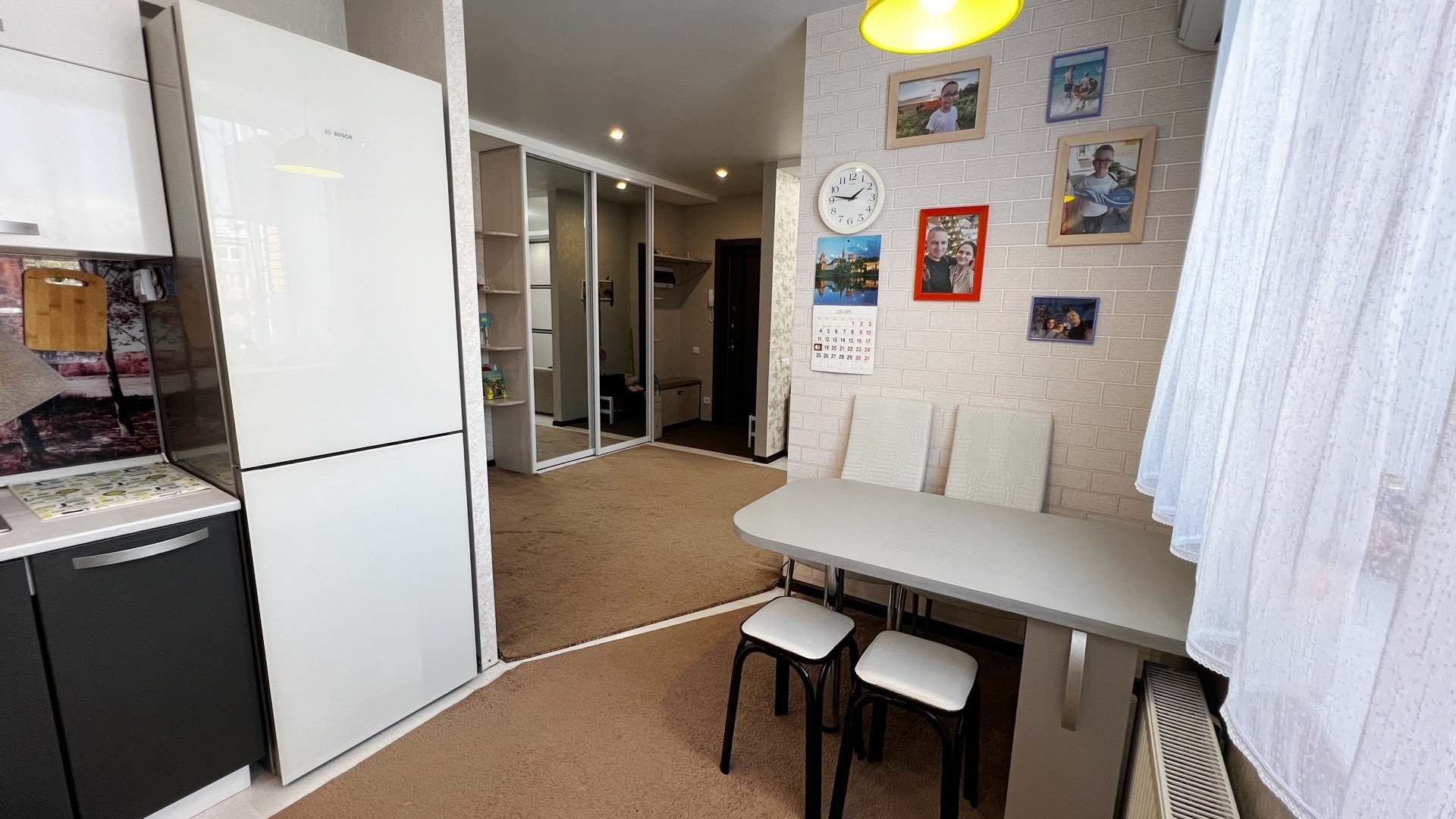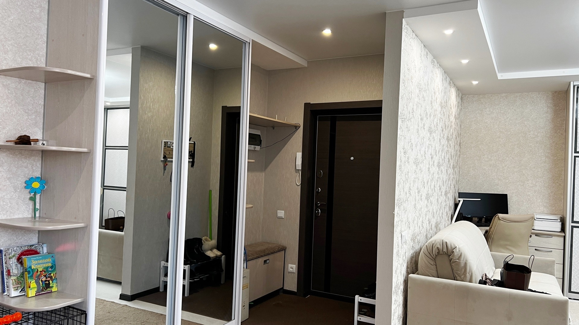 В ПОДАРОК - остаётся кухонный гарнитур со встроенной стеклокерамической плитой, духовой шкаф, 2 компьютерных стола, 2 больших встроенных шкафа, консоль, кондиционер, обеденный стол, стулья, холодильник.