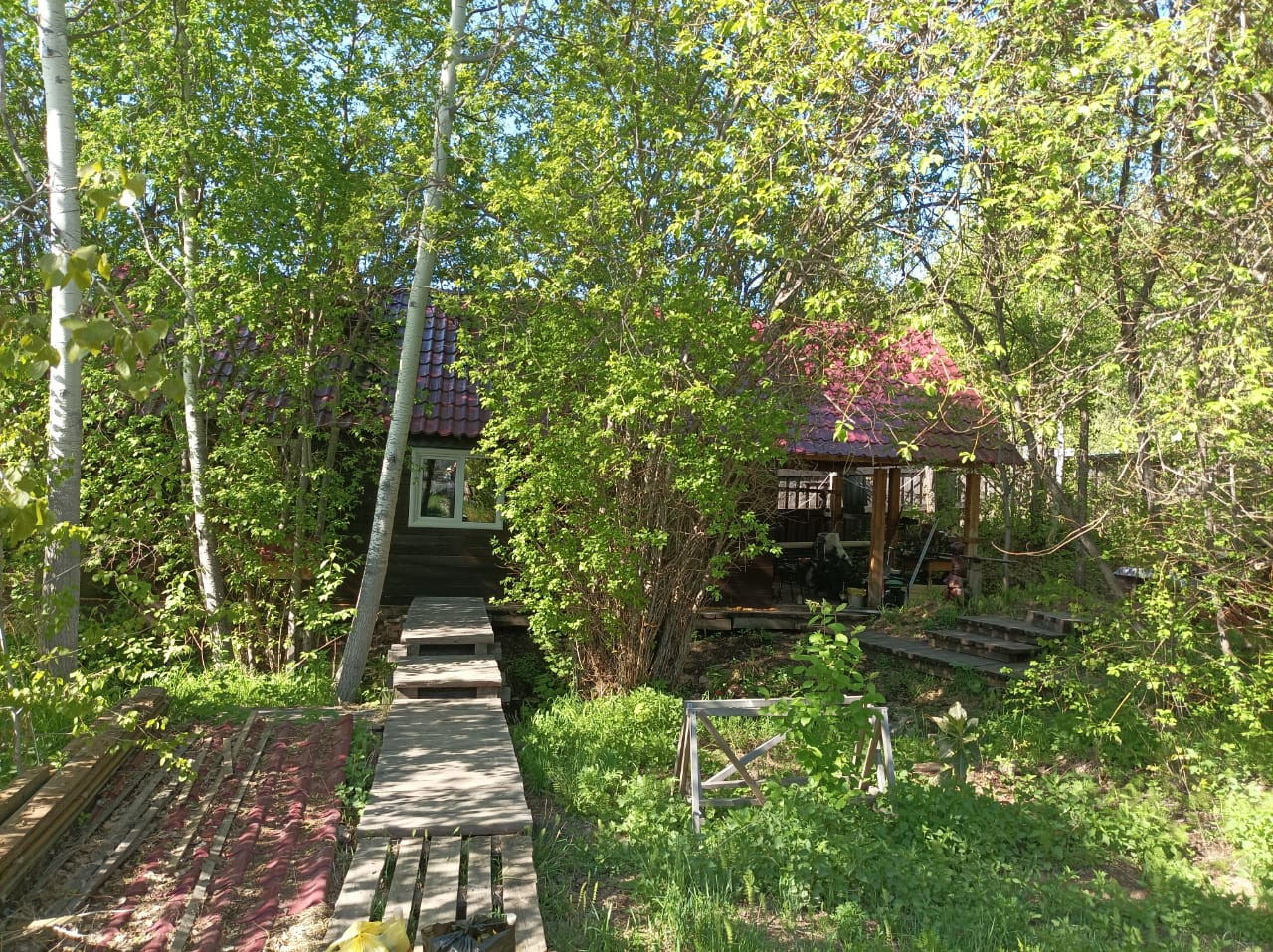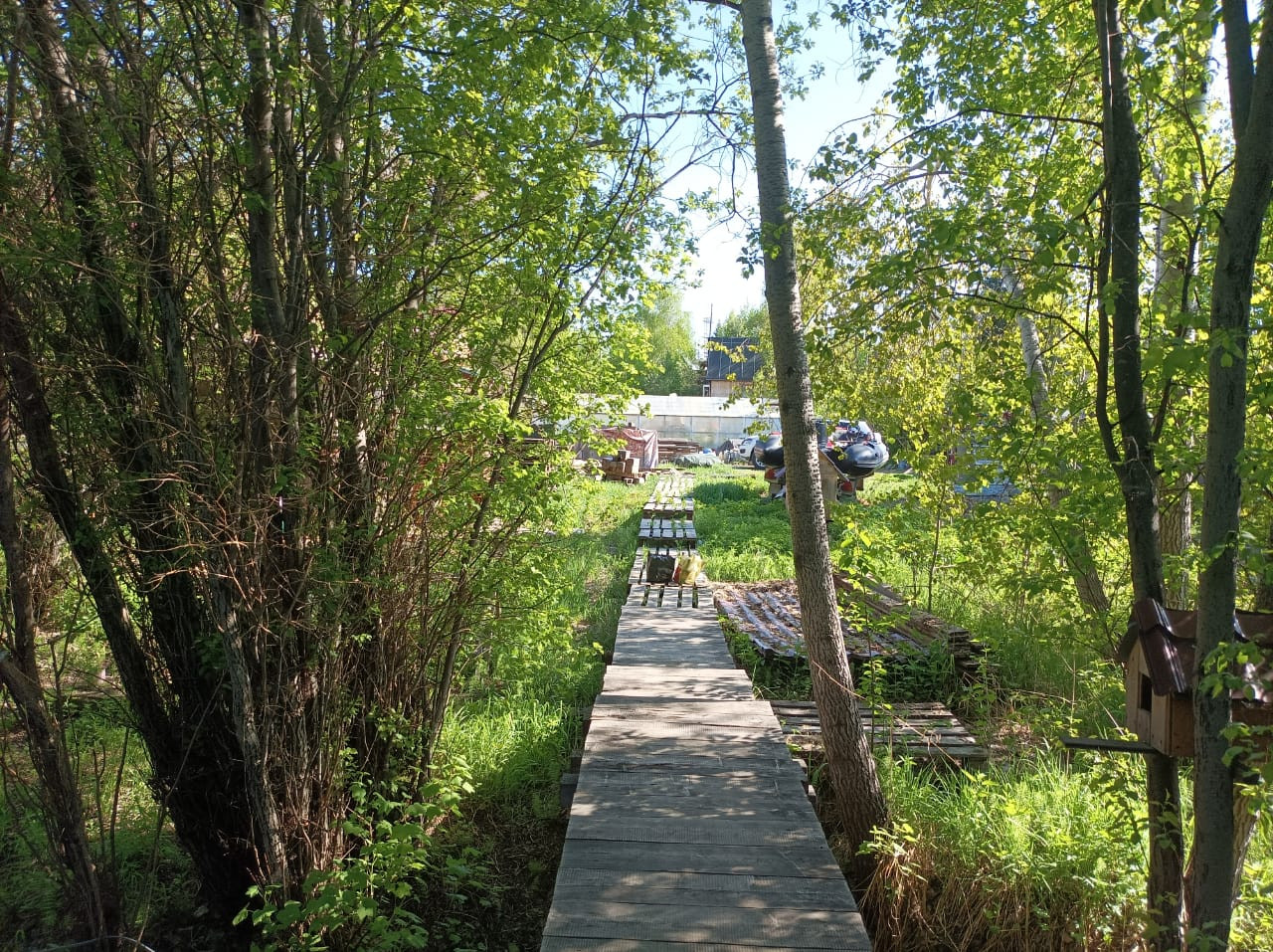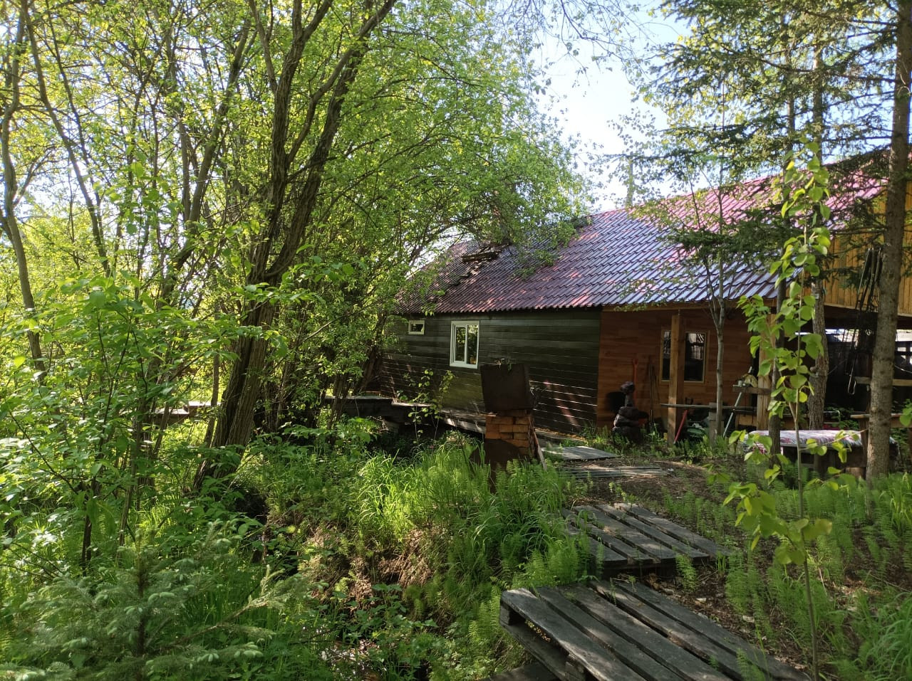3) Огород под картофель, пять больших грядок. Завезен перегной на огород, грядки и в теплицу, урожай очень хороший. Посажено из питомника 5 сортовых яблонь 2 сливы и 2 жимолости, клубника. Вишневый сад (крупная ягода на ножке, не войлочная 7-10 ведер ежегодно). Кусты смородины, облепихи, крыжовника, калины. Культурные грибы вешенки на пнях. Теплица поликарбонатная на бетонном фундаменте 3×10, внутри три гряды. В этой зоне построен еще домик 6*4 метра (летний), не гнилой.