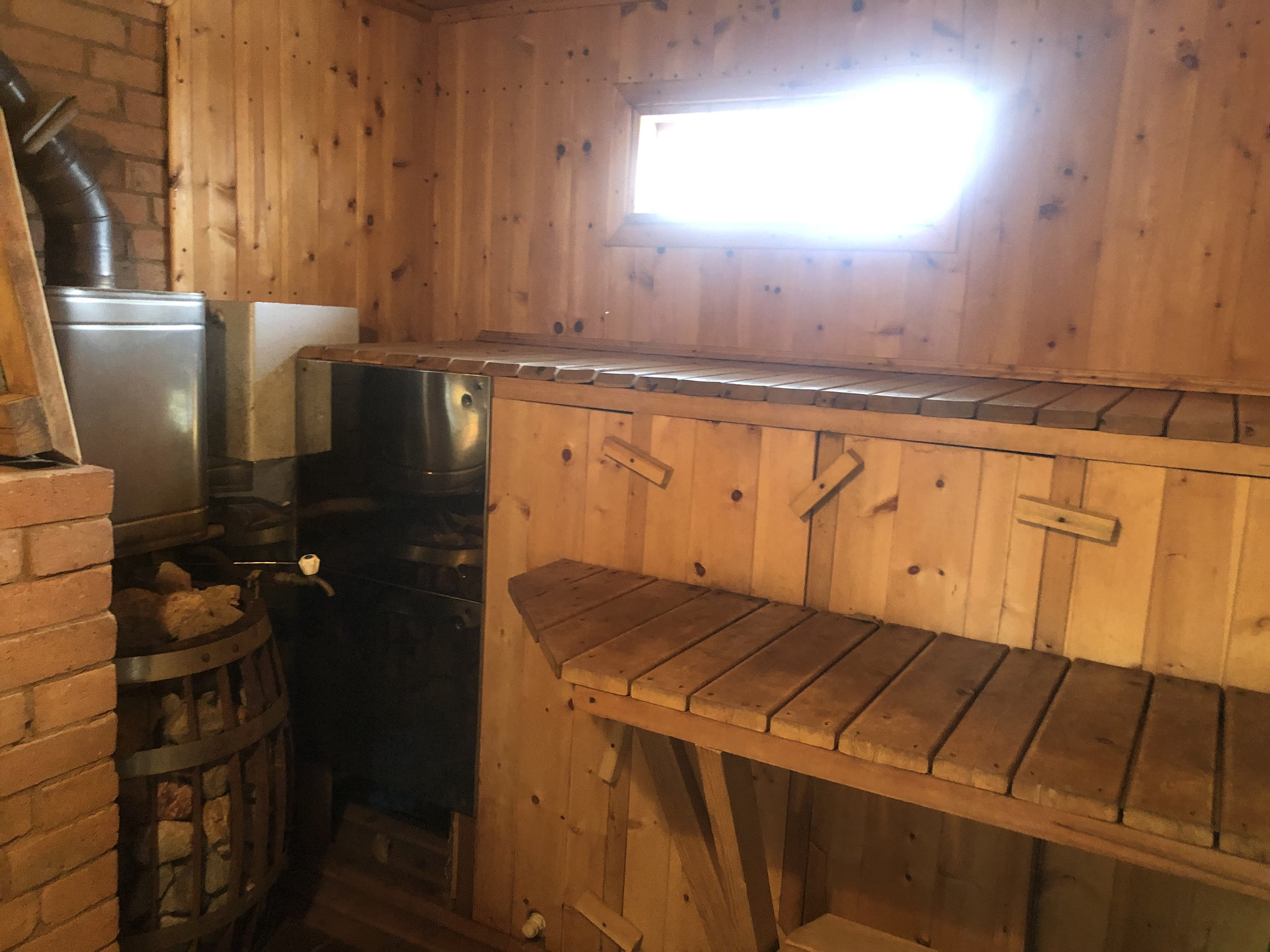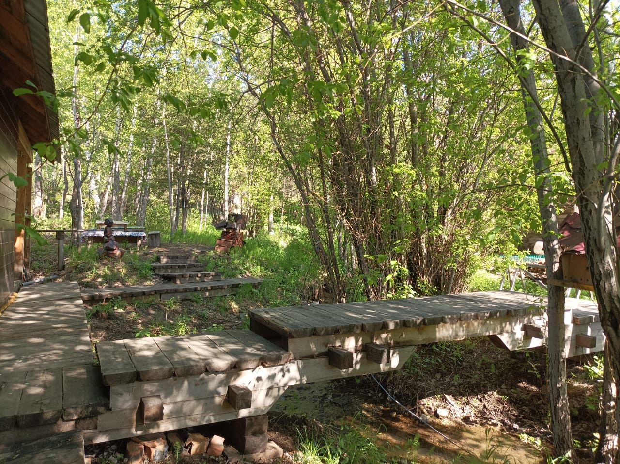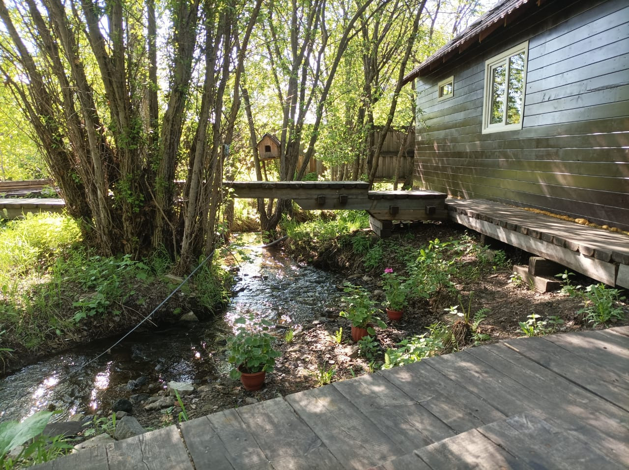1) Лесная зона с ручьем (очень живописно!!!). Ручей не перемерзает. Через ручей смонтированы мосты. Есть мангальная зона. На ручье построена баня с террасой (полноценная однокомнатная квартира), размером 6×12 м2, все обшито вагонкой, парилка кедровой (включая полки). В бане одна комната 3,6×6 м2, кухня 3×3 м2, парилка 3×3 м2, теплый туалет, гардеробная, прихожая. Отопление комнат паровое, в печь встроен теплообменник (электрическое в резерве). Есть канализация, душ. Парилка топится отдельно. Заведено 380 В. Ленточный бетонный фундамент. Год постройки 2018г. Мебель вся остается.