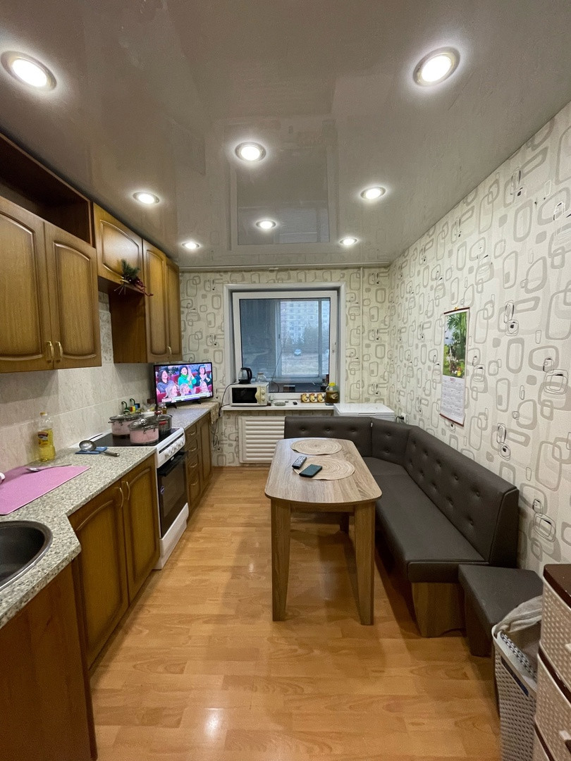 Продам отличную квартиру необычной планировки, туалет в конце квартиры, расположен далеко от спален и кухни, лоджия большая 6 метровая, на полу ламинат, натяжные потолки, окна пвх, на лоджии ремонт, ванна/туалет кафель, есть отдельный тамбур (там раздевалка), мебель остается и бытовая техника. Торг