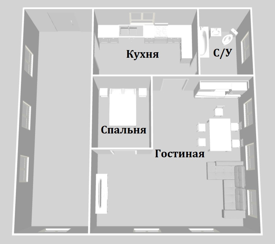 Удачная планировка с большим количеством окон и возможностью увеличения жилых комнат.