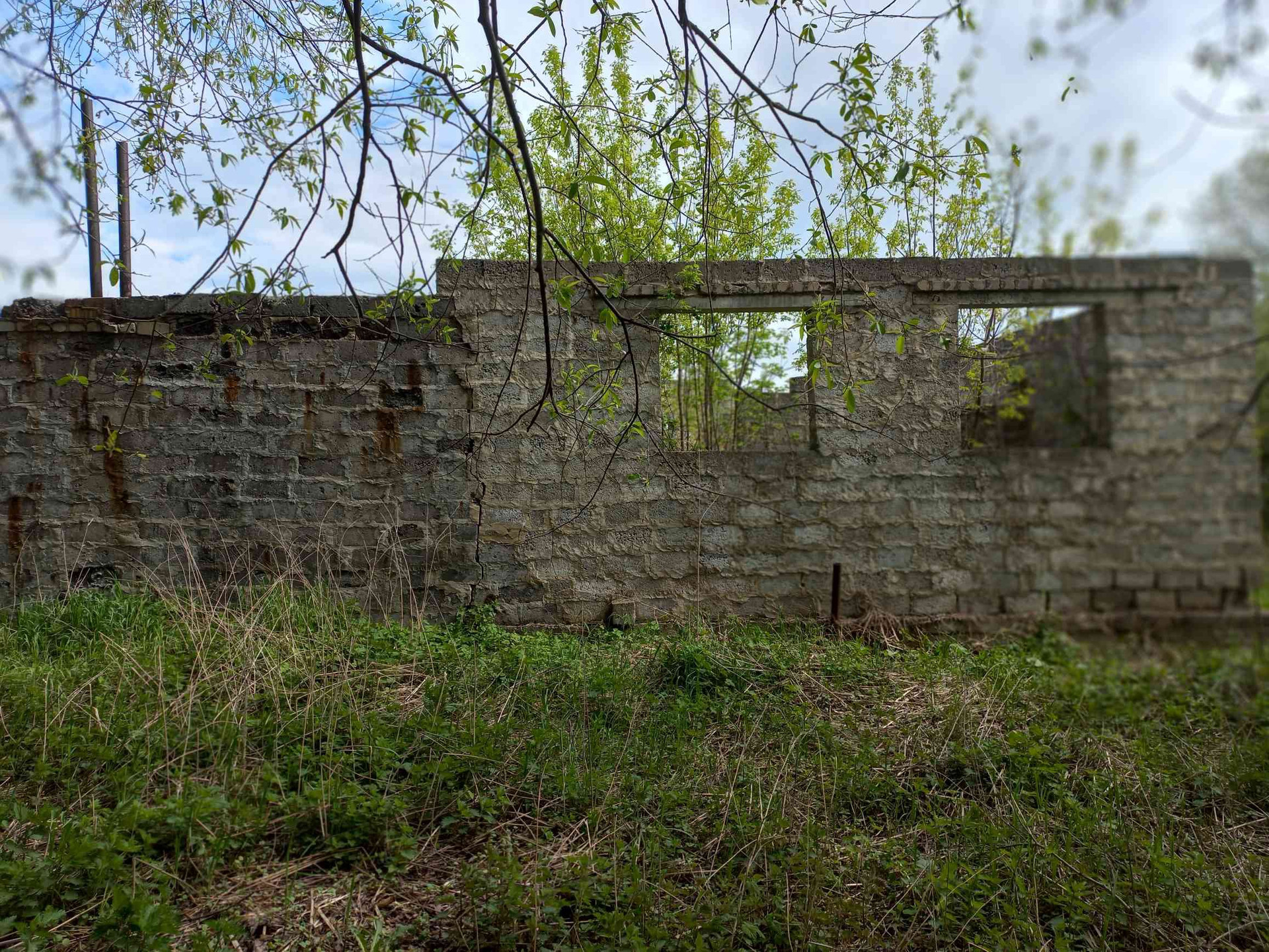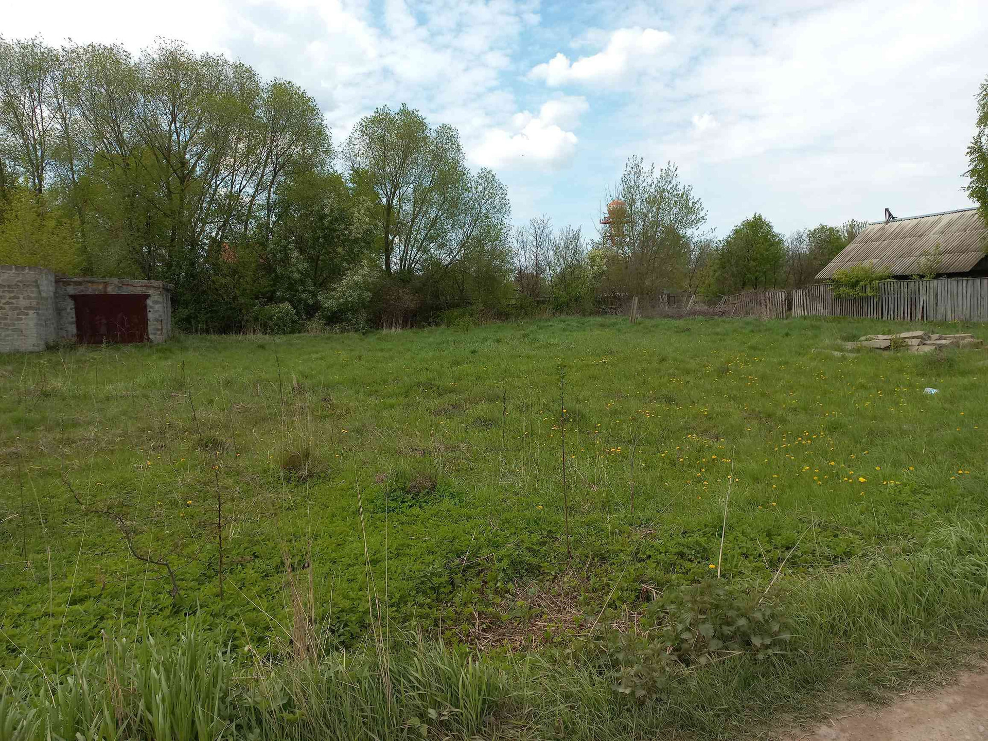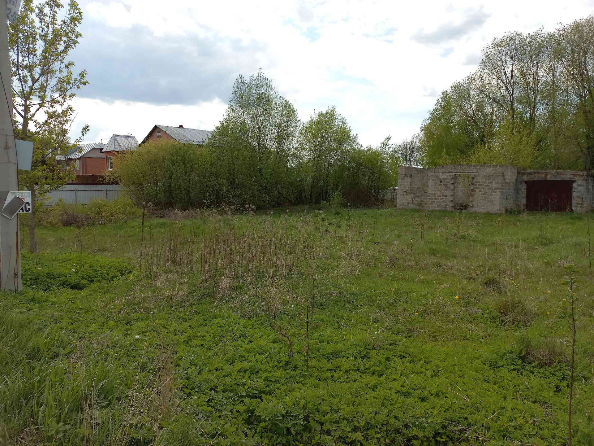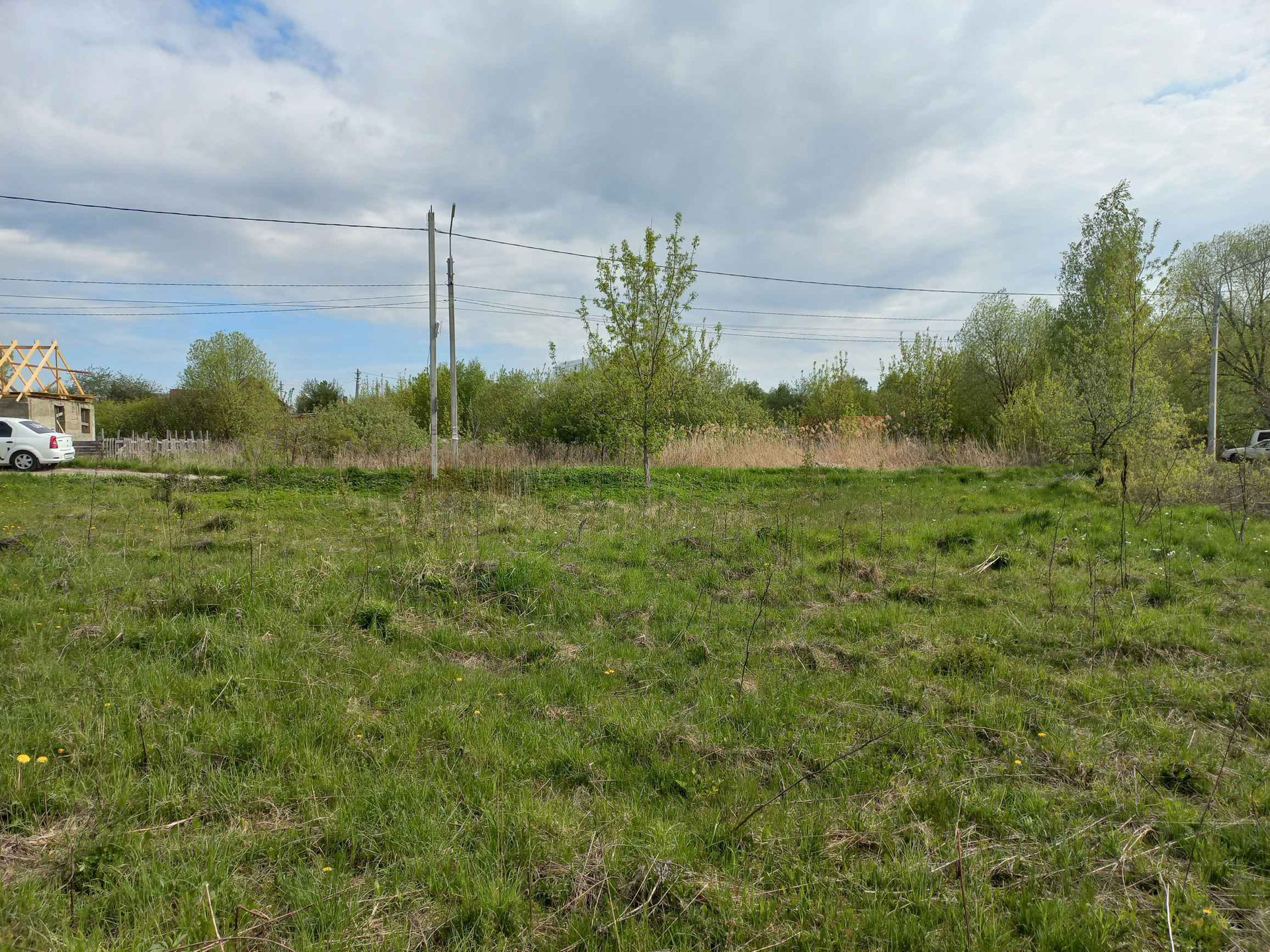 участок с недостоеным домом и гаражом, на участке комуникации, электричество, газ,  вода неподалеку, калализация