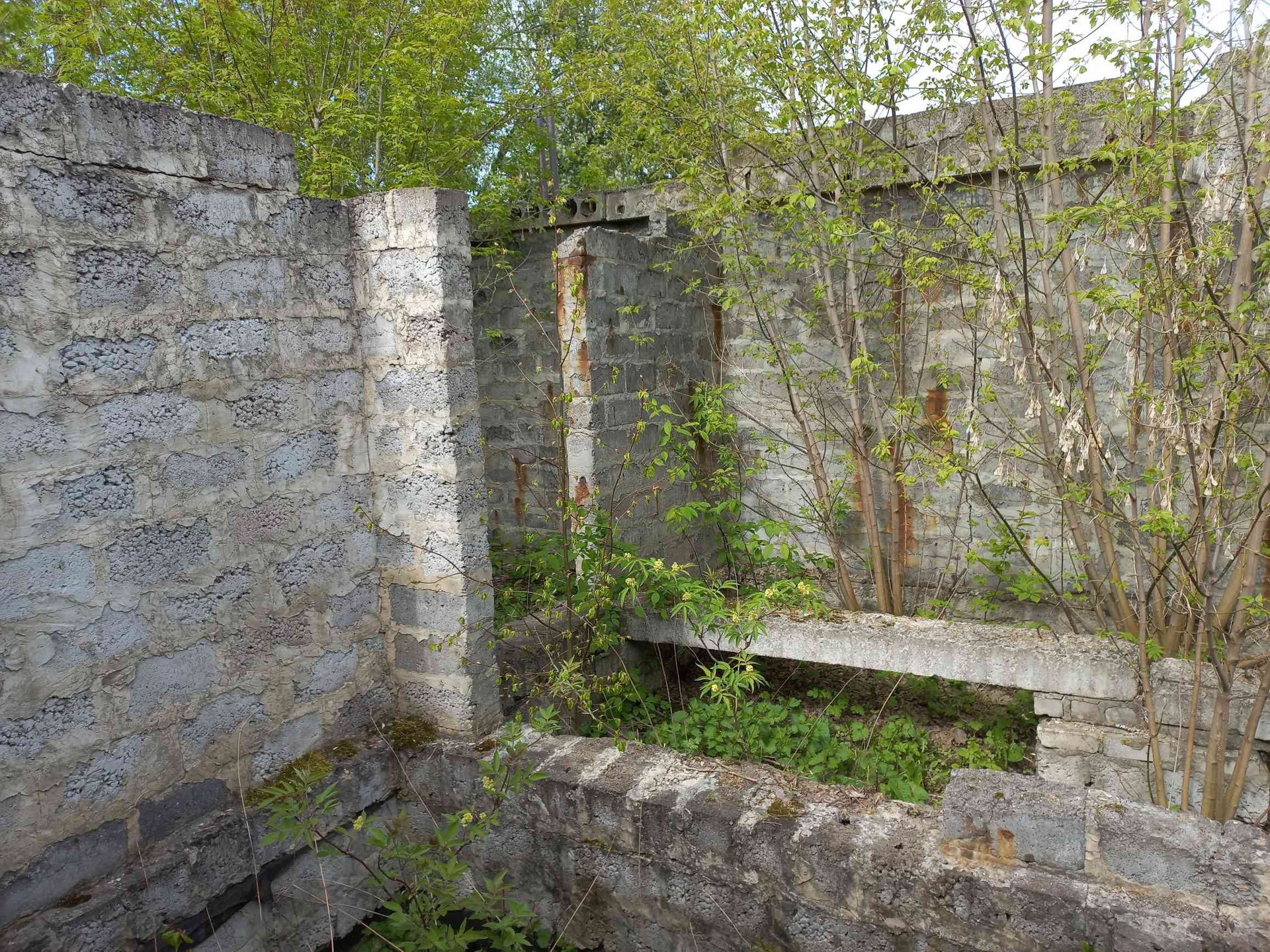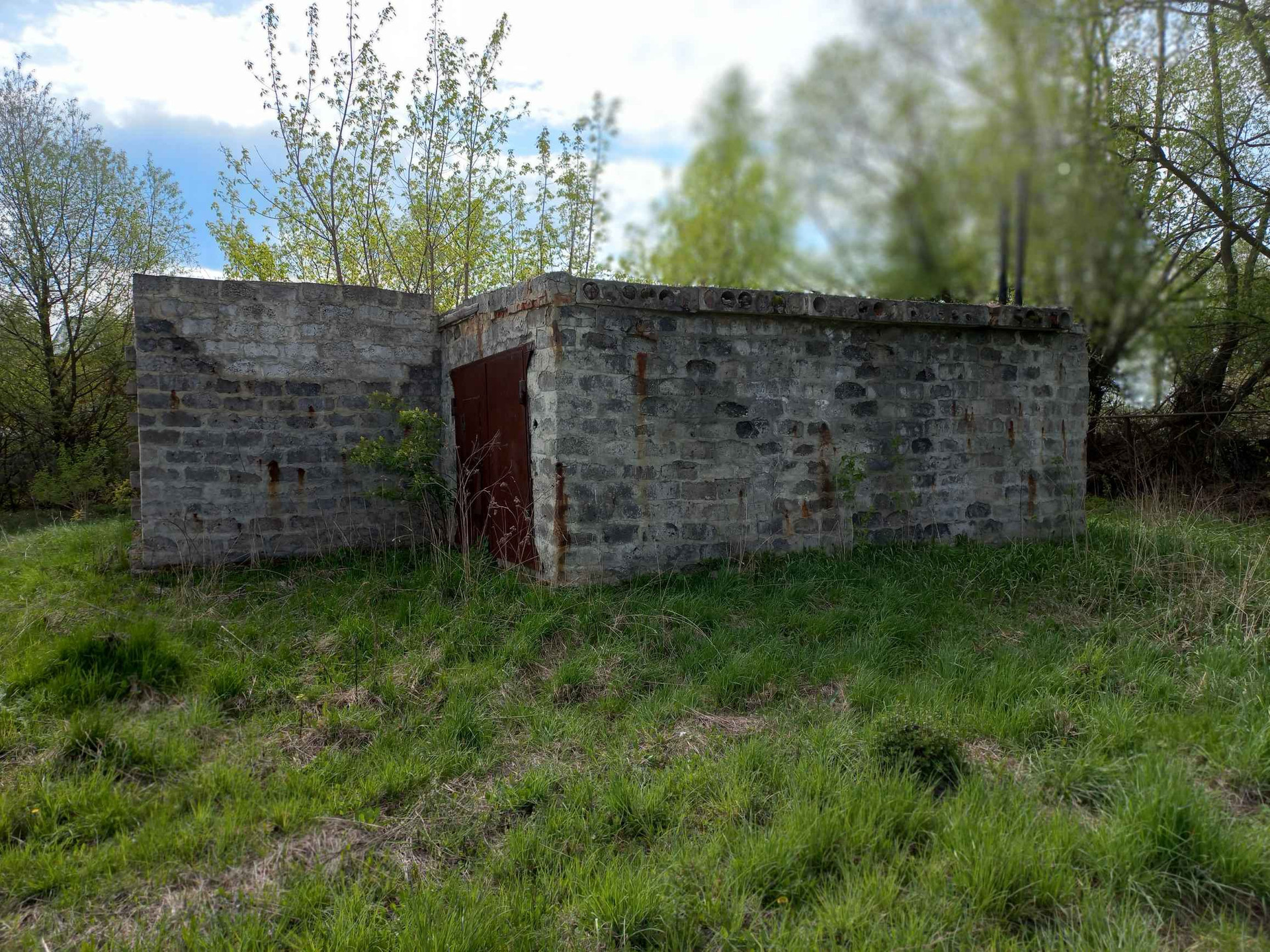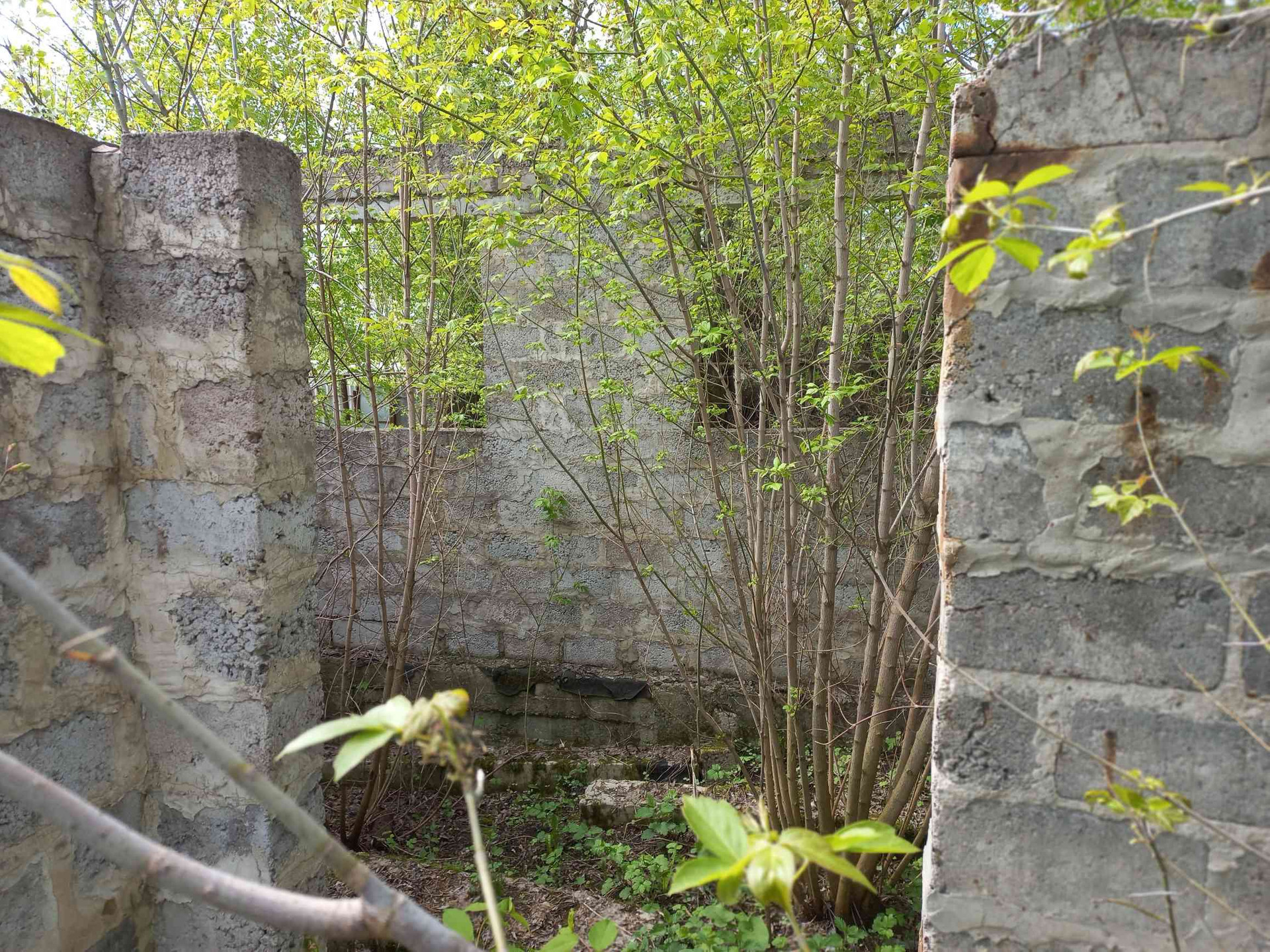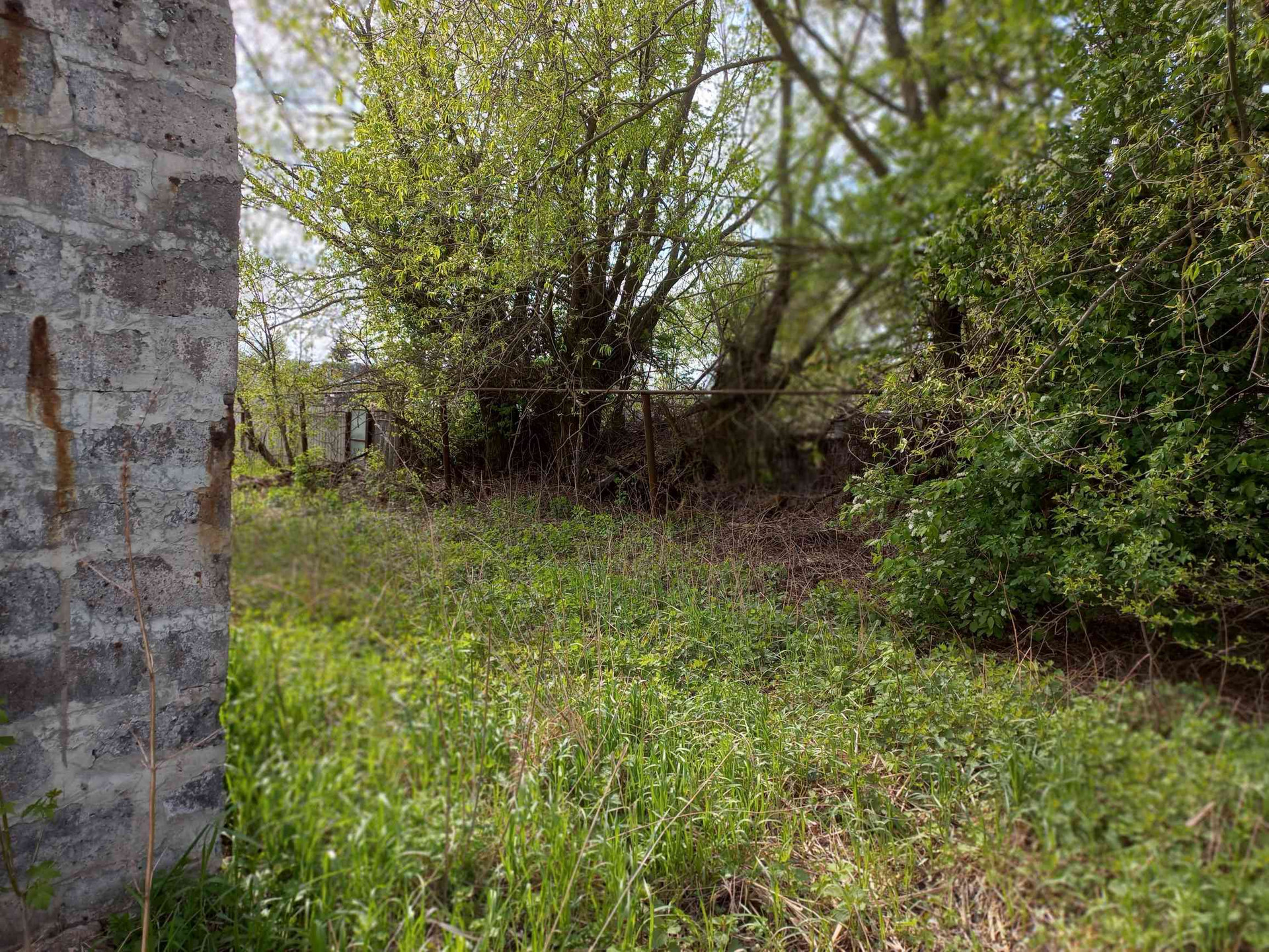участок с недостоеным домом и гаражом, на участке комуникации, электричество, газ,  вода неподалеку, калализация