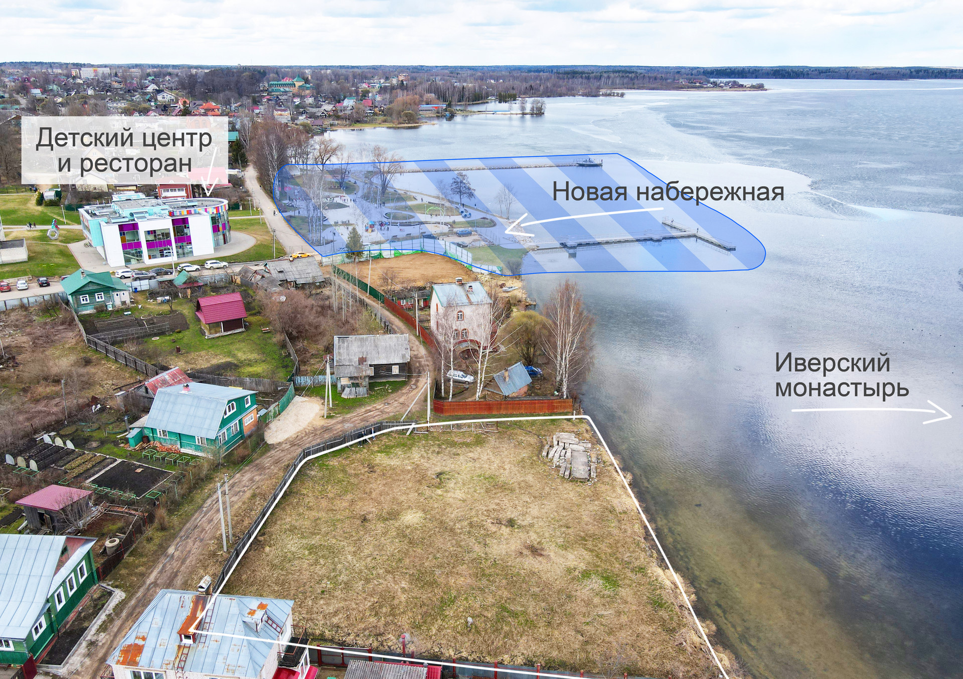 - В 100 метрах от городской современной набережной с детской площадкой, детским развлекательным центром и рестораном «Место.Валдай» (см. фото).