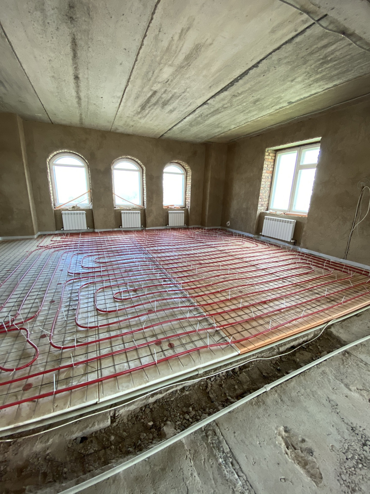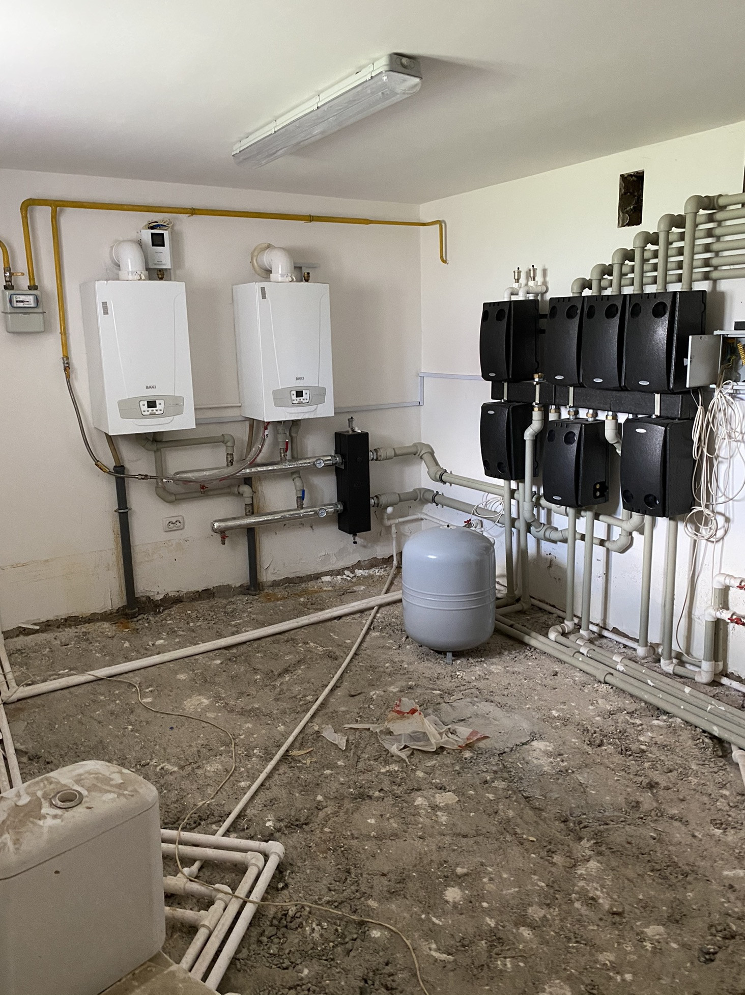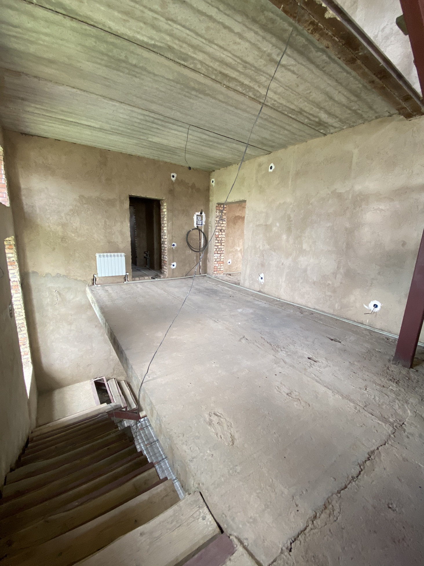 Все коммуникации центральные, в том числе и канализация. Сделана разводка электричества, системы отопления ( отопление подключено), установлены два котла. Сделана разводка тёплых полов. Стены оштукатурены. Перекрытия ж/б плиты. В доме три балкона.