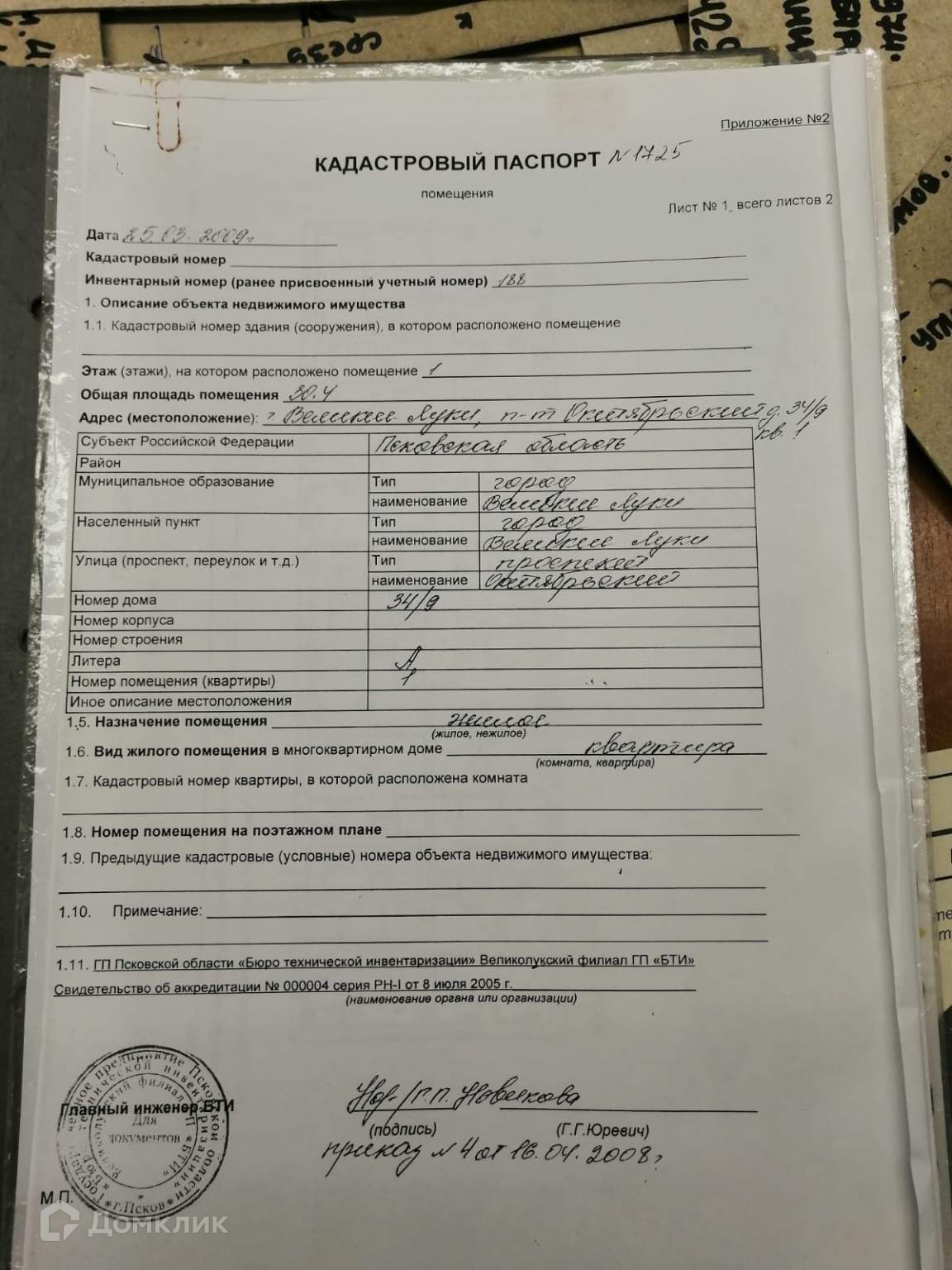 2-комнатная квартира, 30.4 м2, этаж 1 / 4, на продажу в Великих Луках, Октябрьский проспект, 34/9