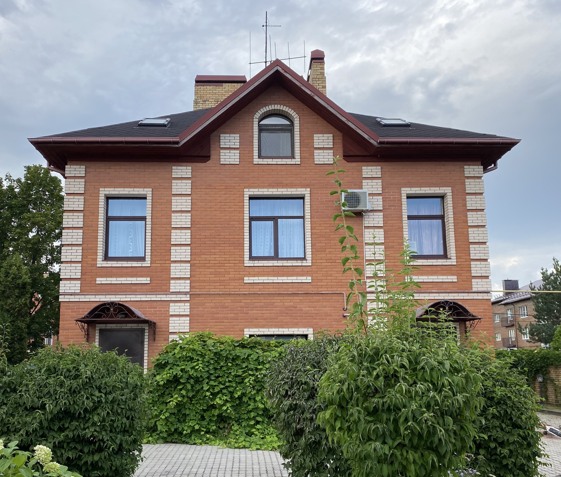 Фундамент - монолитная плита, кровля - гибкая черепица, стены - кирпич.