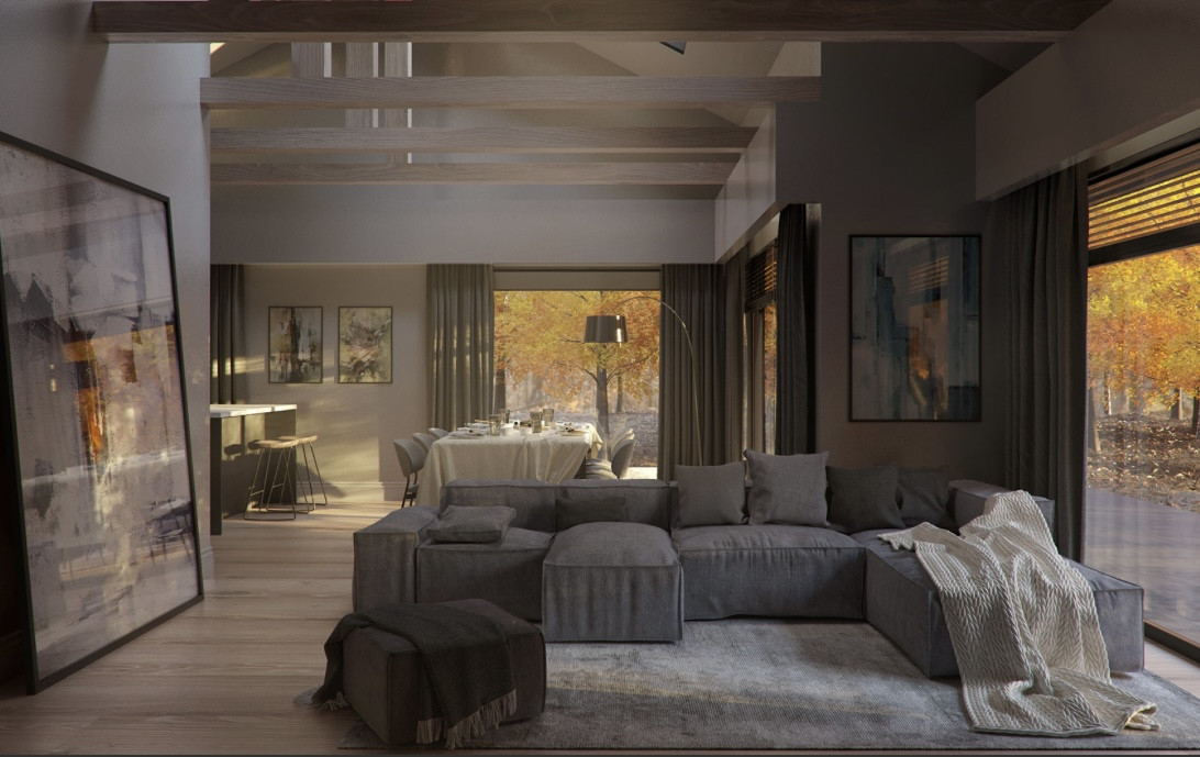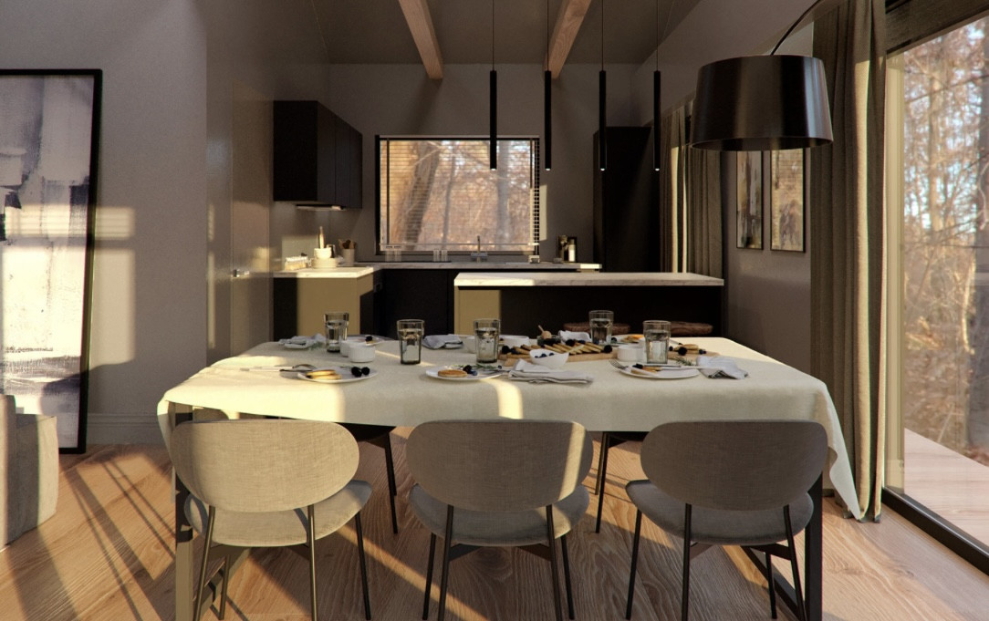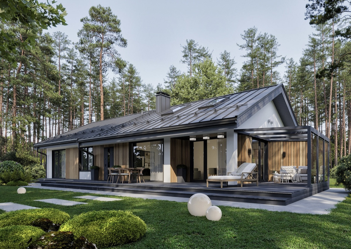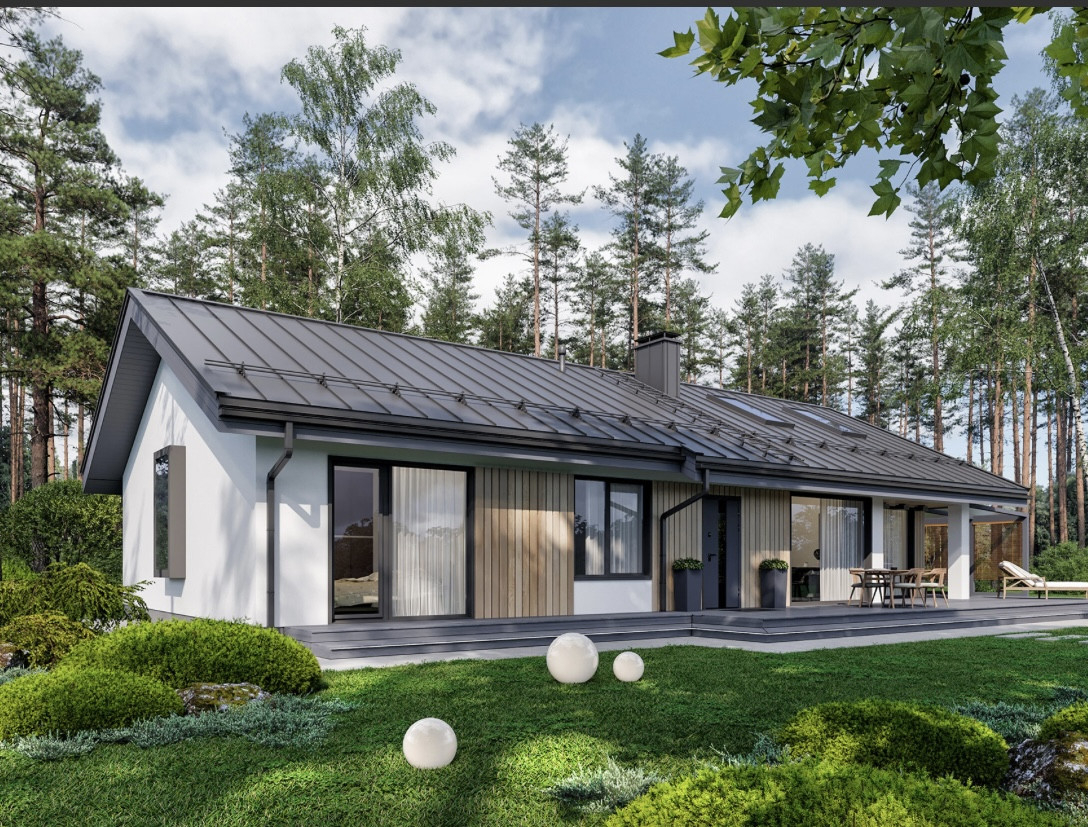 Планировка данного одноэтажного дома эргономична. Просторная прихожая 8 кв.м., котельная 5 кв.м, приватная зона включает в себя три спальни (10.2 кв.м, 13.3 кв.м и 10.2 кв.м) и два с/у (4 кв.м и 12 кв.м), зона общего пребывания состоит из кухни-столовой площадью 42 кв.м.
