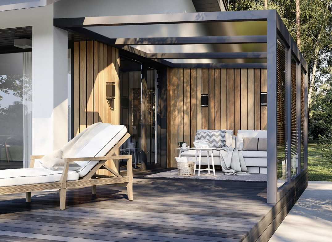 Фундамент - монолитная плита, кровля - металлическая фальцевая, стены - газобетон (утеплен и отделан фасадной штукатуркой и декоративными элементами из лиственницы).
