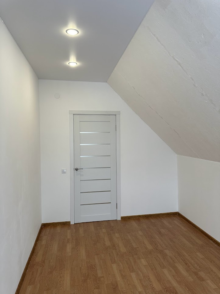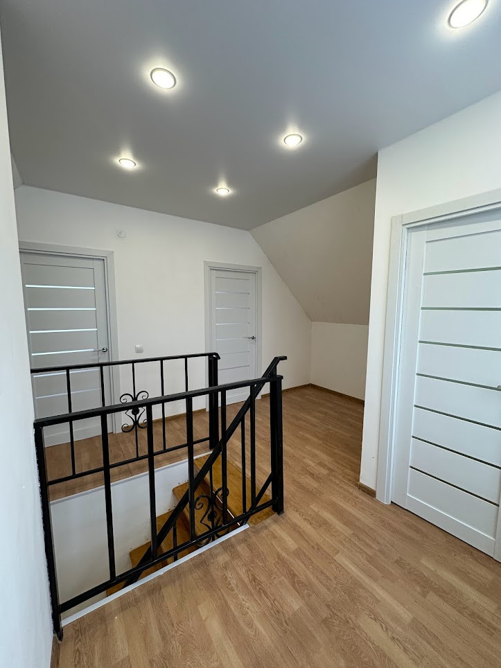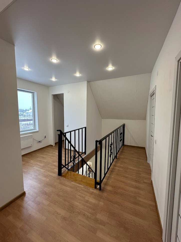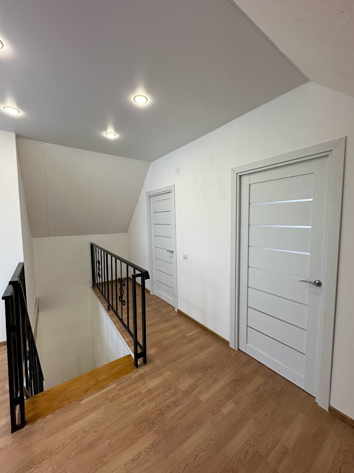 Внутренняя отделка "под чистовую": натяжные матовые потолки со встроенными светильниками, полы - ламинат, в прихожей - плитка, все стены оштукатурены и ошпаклеваны, подготовлены под любую отделку на ваш вкус; новые межкомнатные двери. С/узел на 1-м этаже - плитка. Оба с/узла полностью укомплектованы необходимой для комфортного проживания сантехникой и мебелью.