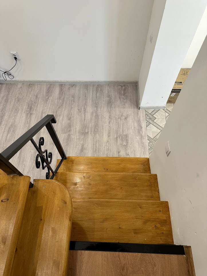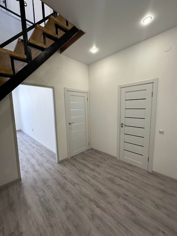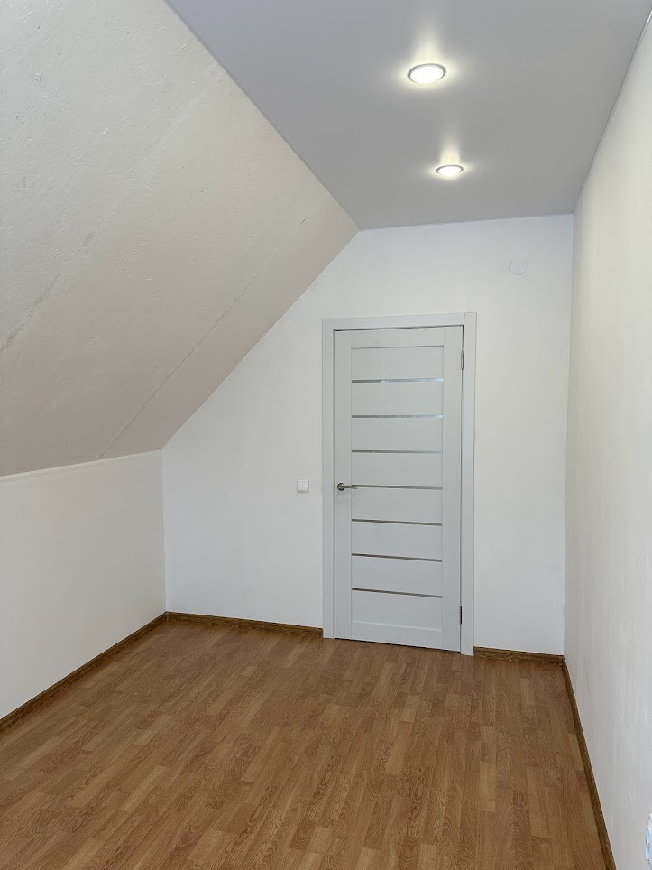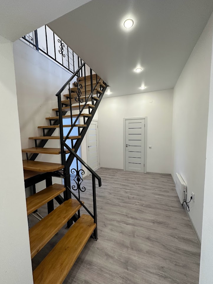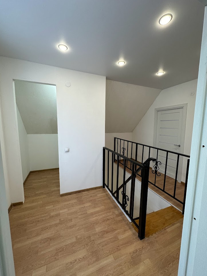 Внутренняя отделка "под чистовую": натяжные матовые потолки со встроенными светильниками, полы - ламинат, в прихожей - плитка, все стены оштукатурены и ошпаклеваны, подготовлены под любую отделку на ваш вкус; новые межкомнатные двери. С/узел на 1-м этаже - плитка. Оба с/узла полностью укомплектованы необходимой для комфортного проживания сантехникой и мебелью.