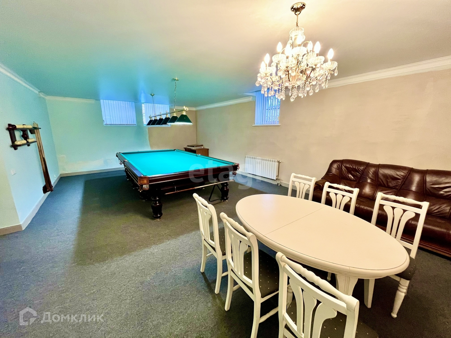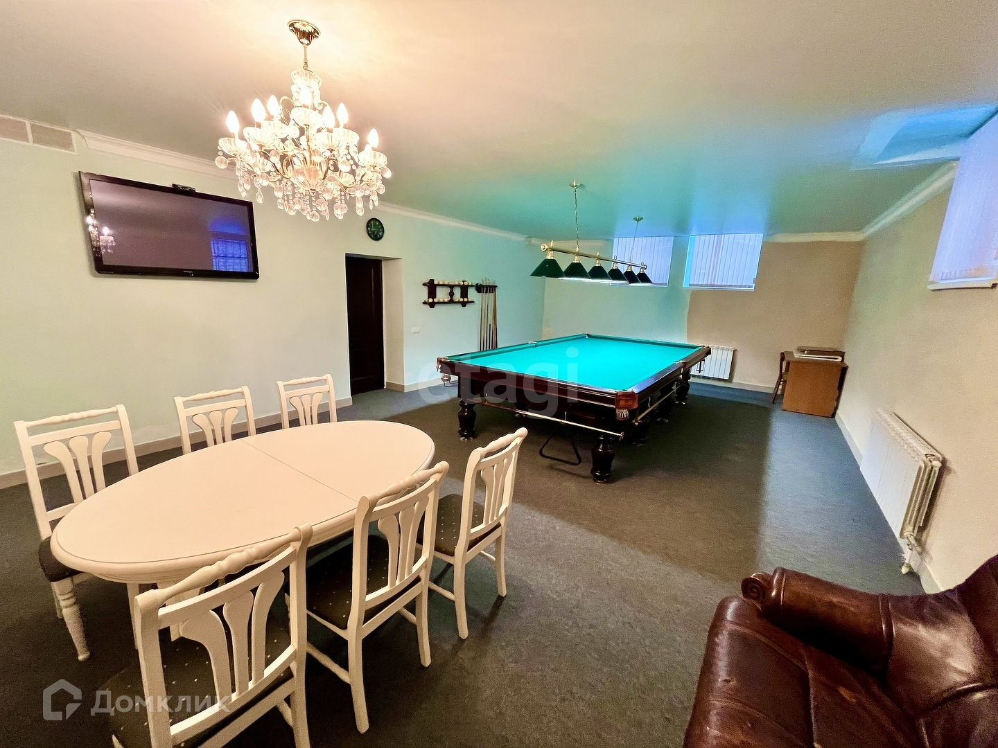 В доме предусмотрено всё необходимое: изысканный зал-столовая для проведения мероприятий, кухня, бильярдная и спортивный зал на цокольном этаже, прачечная, кладовые помещения, видеонаблюдение, своя котельная.