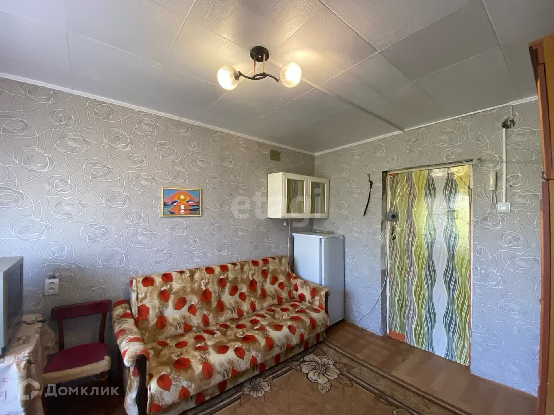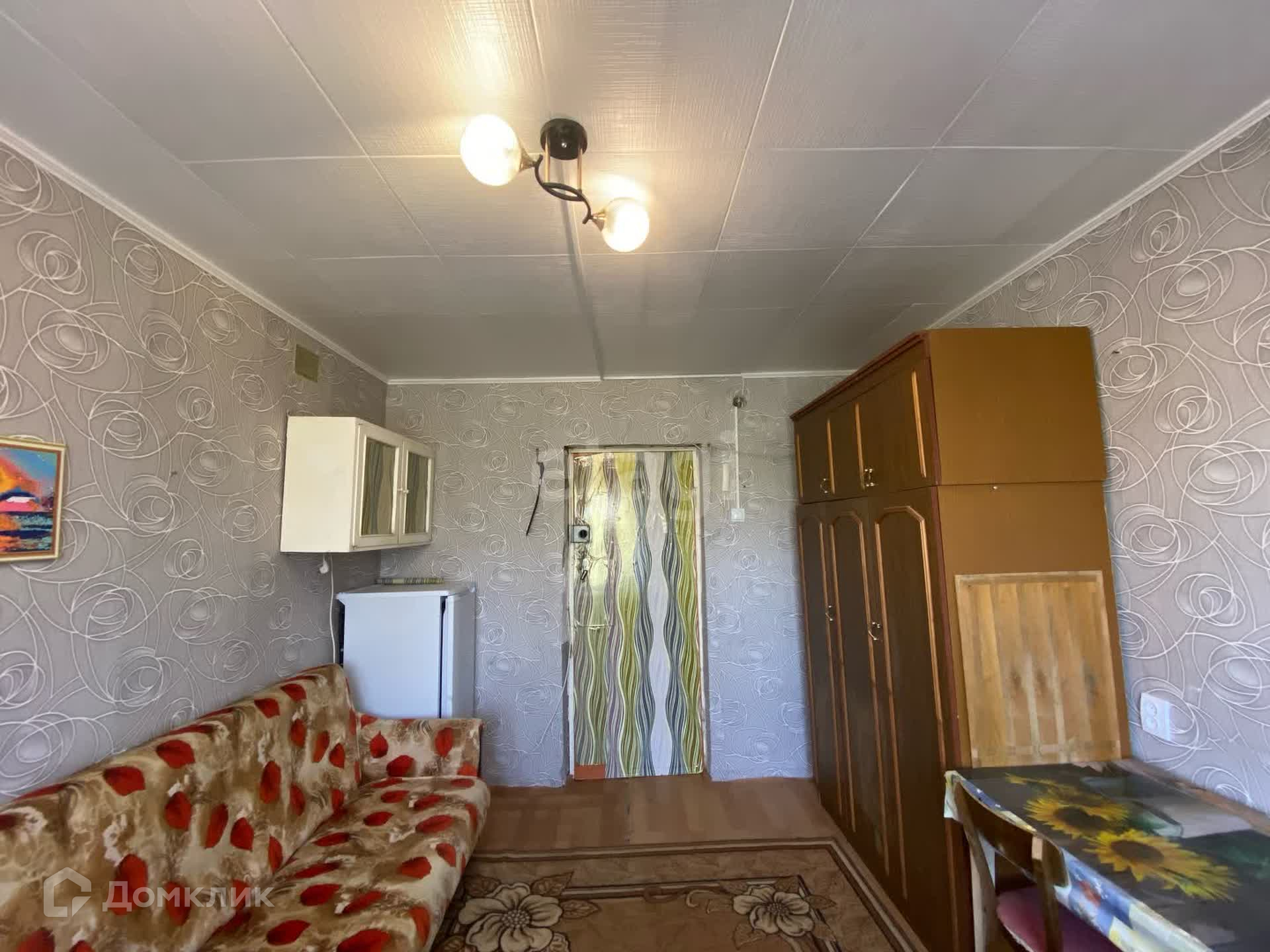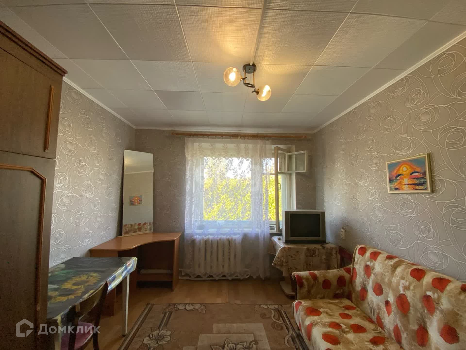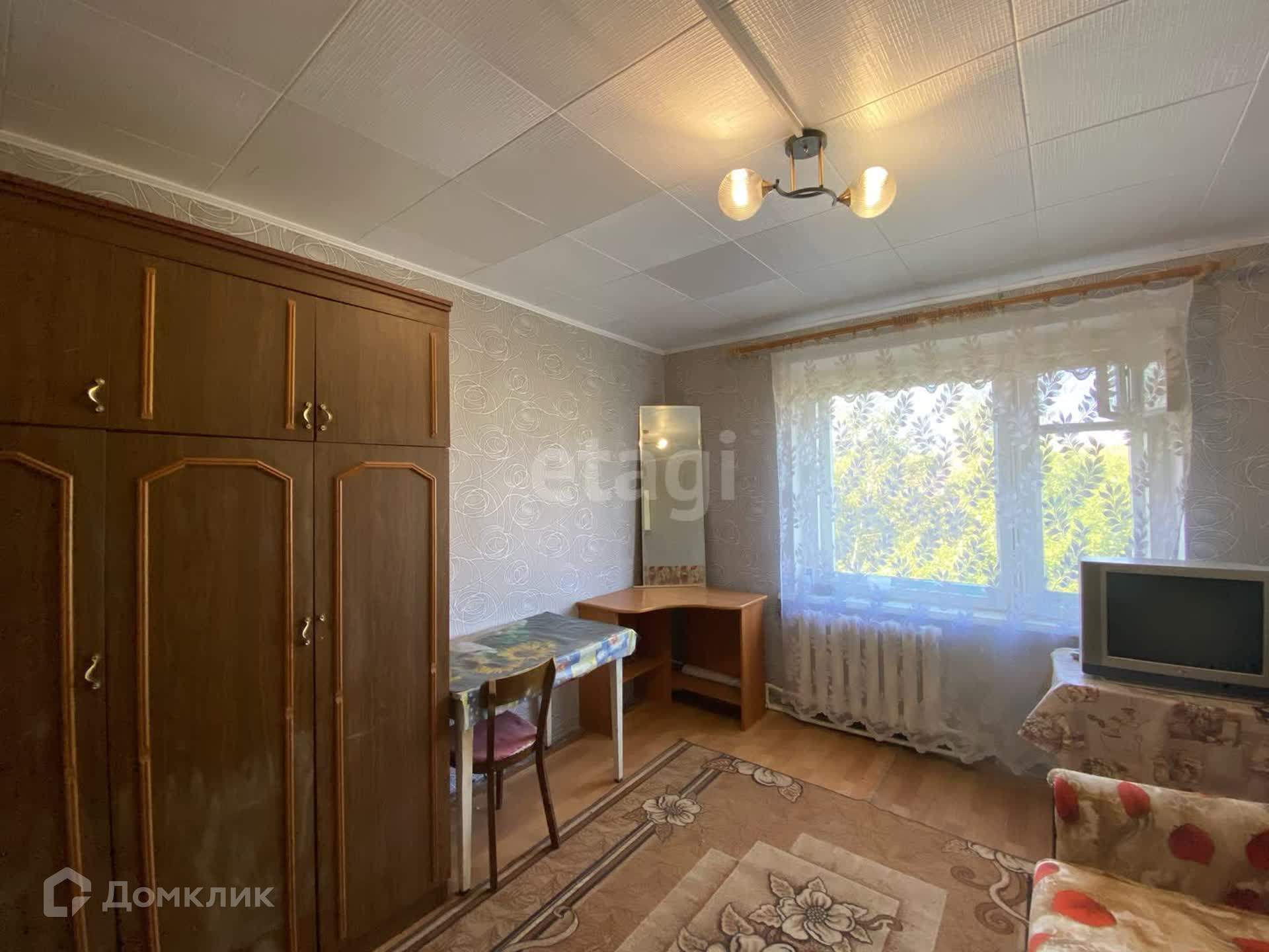 Сделан хороший ремонт. В самой комнате уложен линолеум, поклеены обои. Из техники имеется холодильник и телевизор. Из мебели остается диван, шкаф, три стола. Вид из окна во двор.