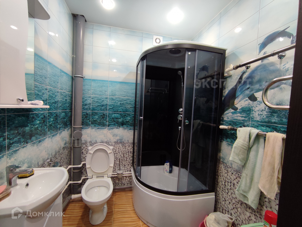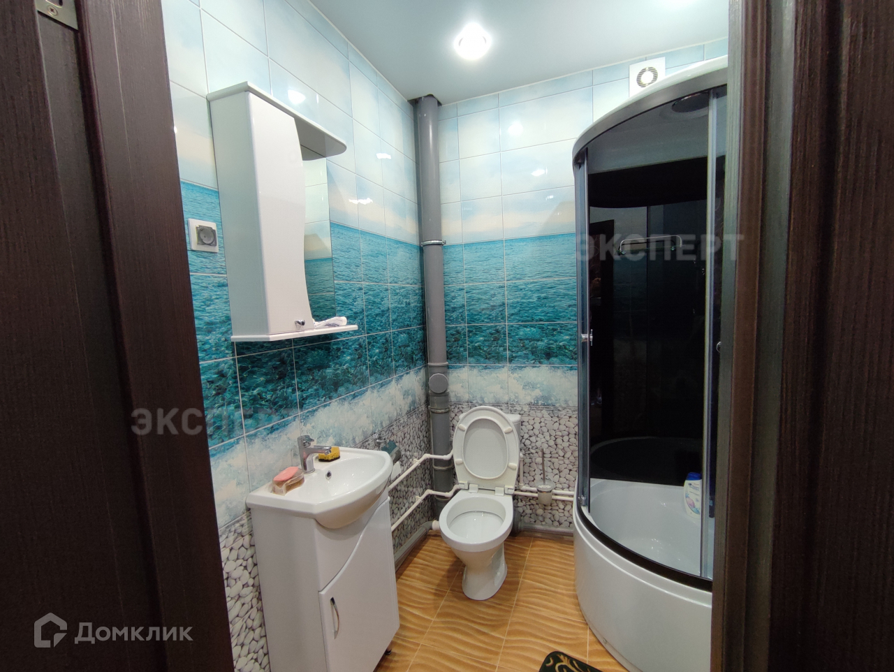Санузел совмещенный, кафель на полу и стенах. Просторная душевая кабина.