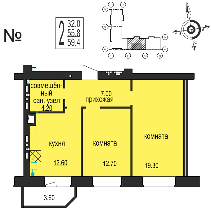Общая площадь 59.4 м2