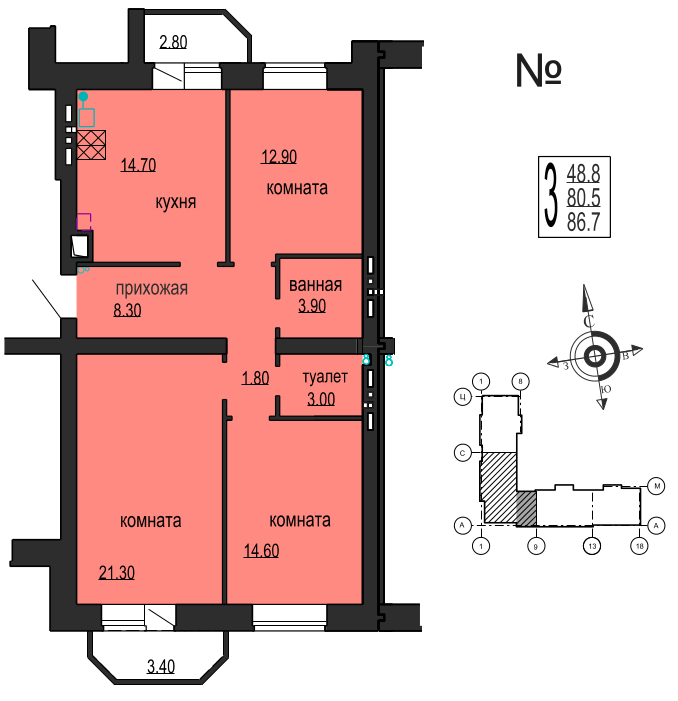 Общая площадь 86.7 м2