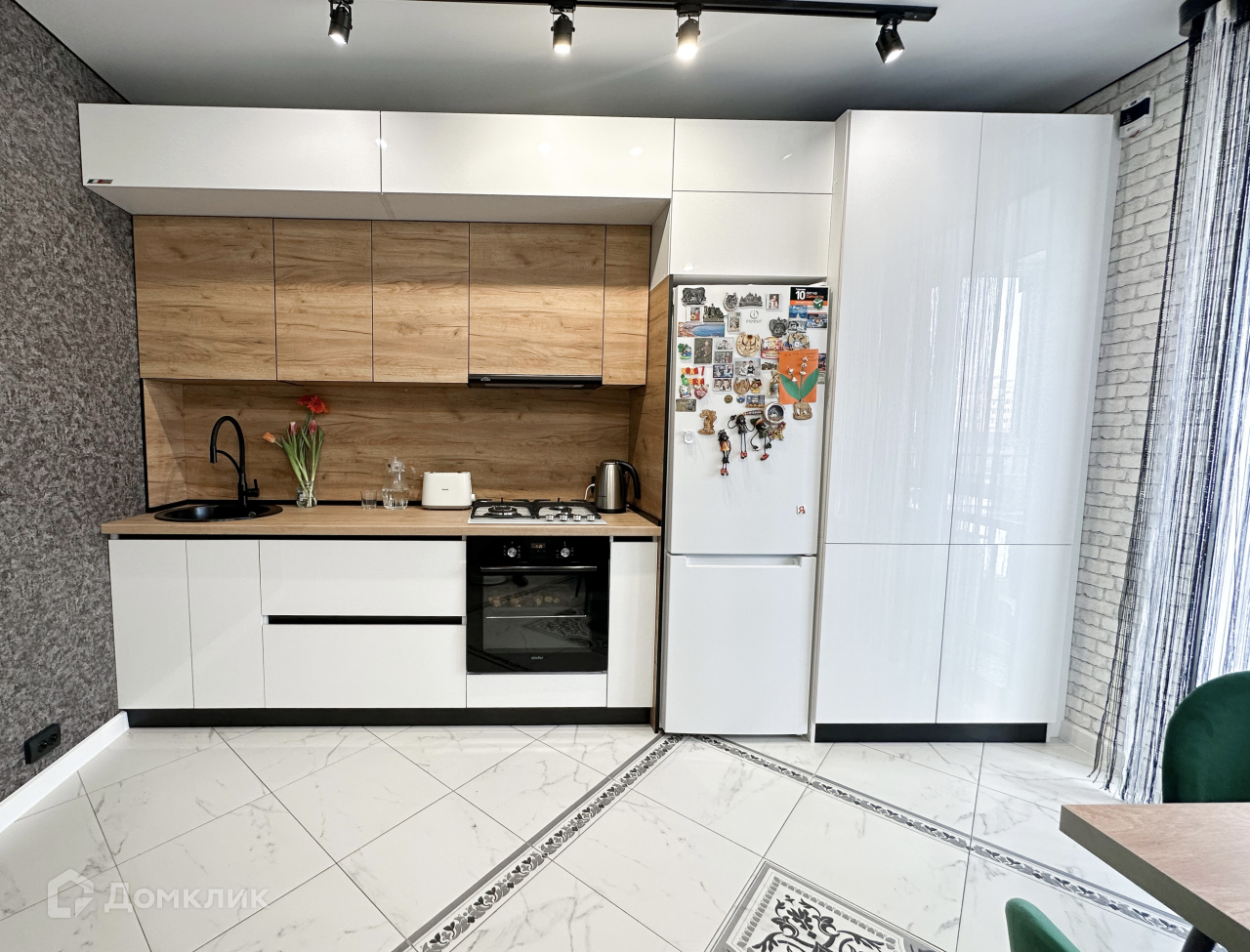 Квартира продаётся с мебелью и техникой: встроенный кухонный гарнитур с варочной поверхностью и вытяжкой.