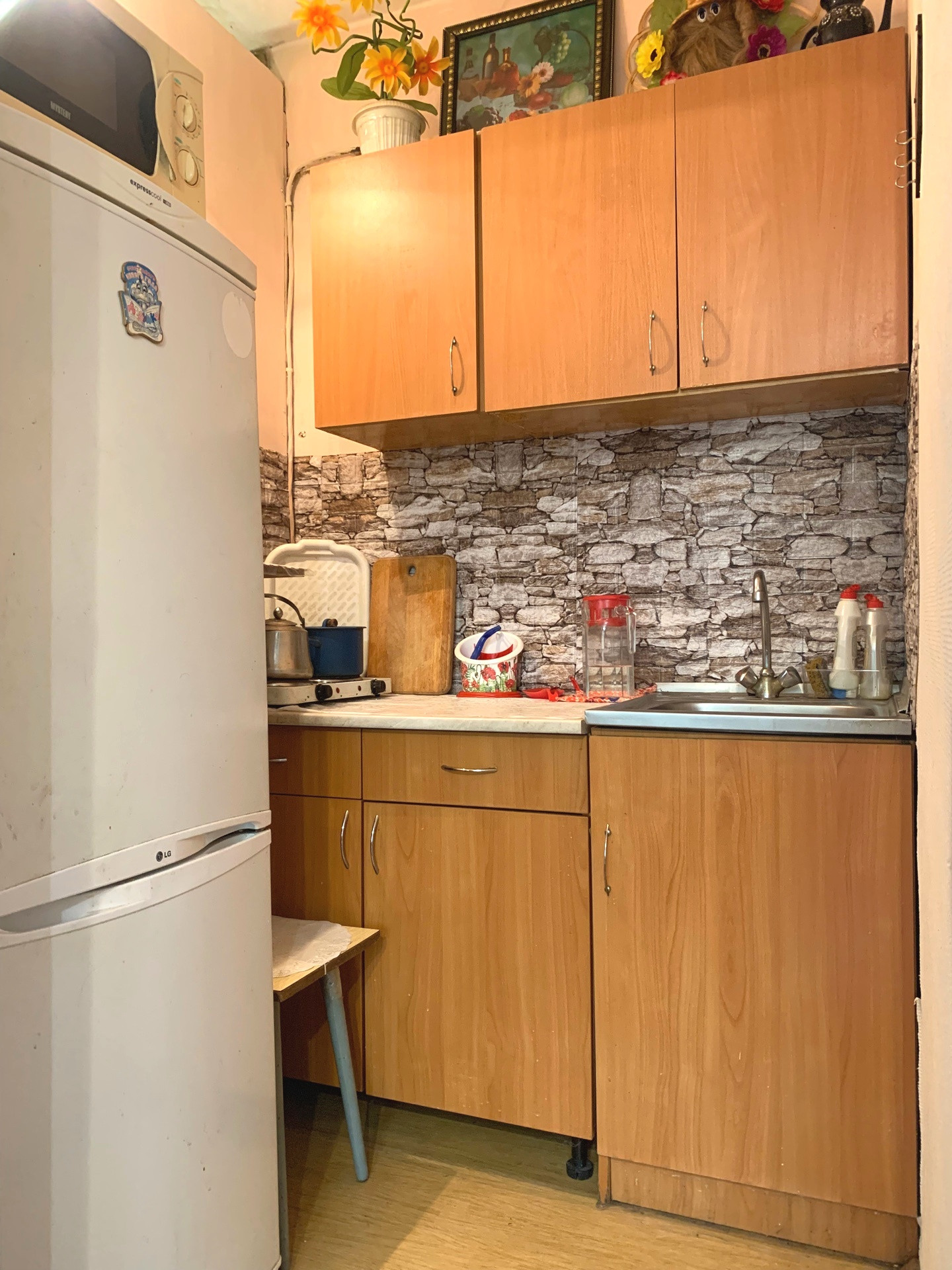 Хорошее состояние, косметический ремонт, натяжные потолки, обновлен линолеум в комнатах, стеклопакеты, металлическая входная дверь, установлены счетчики на воду и эл-во.