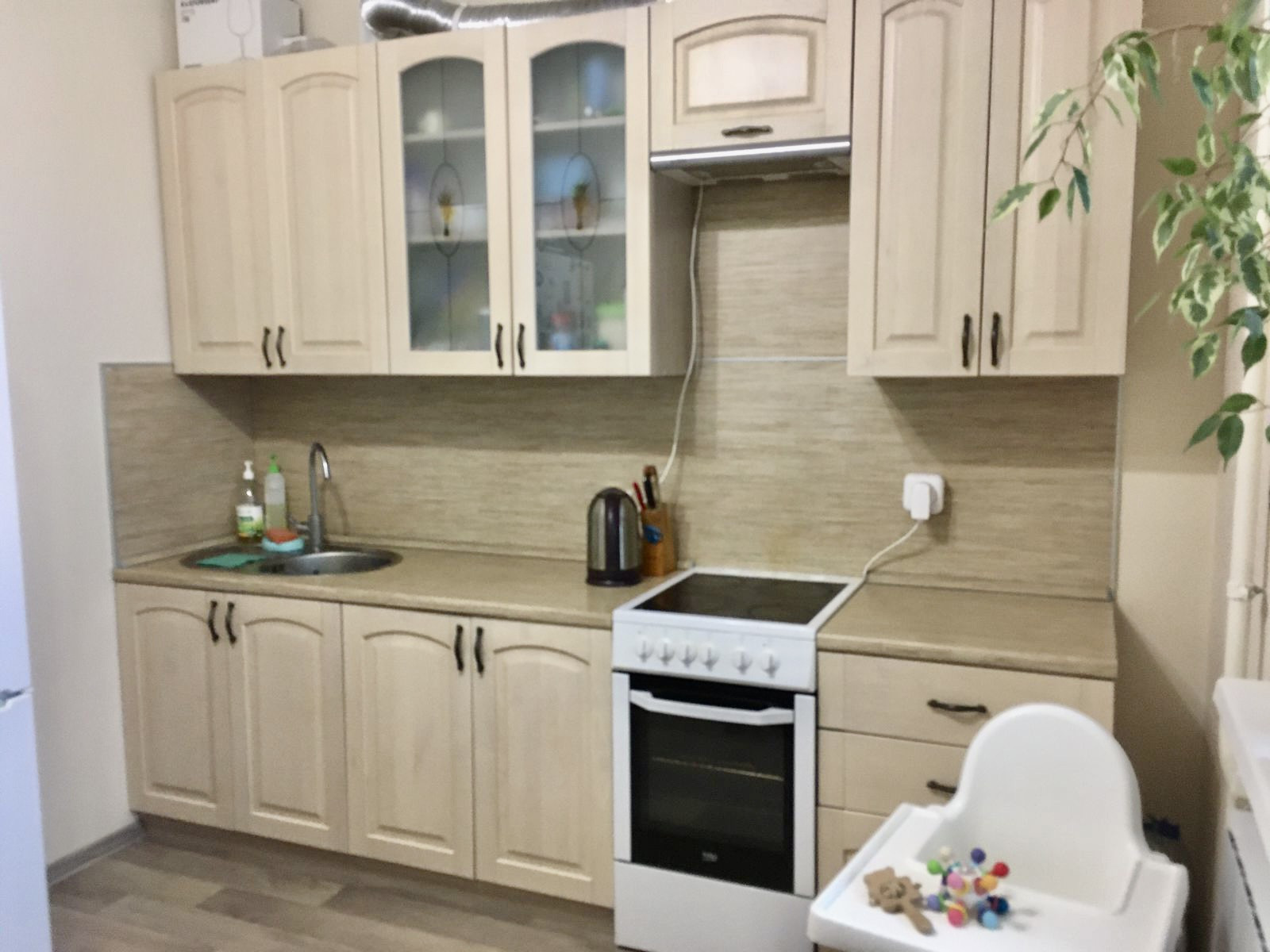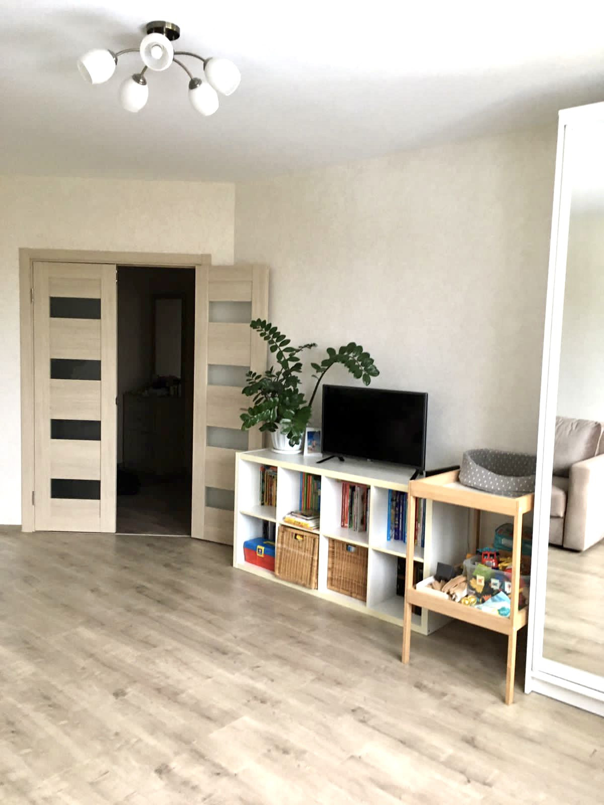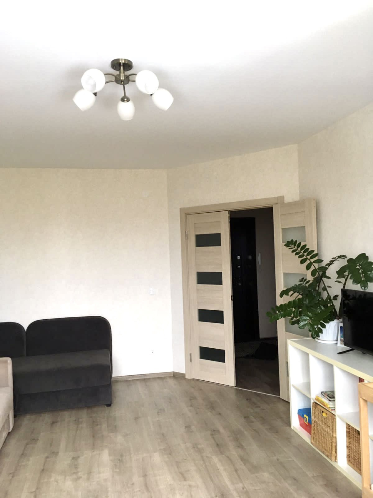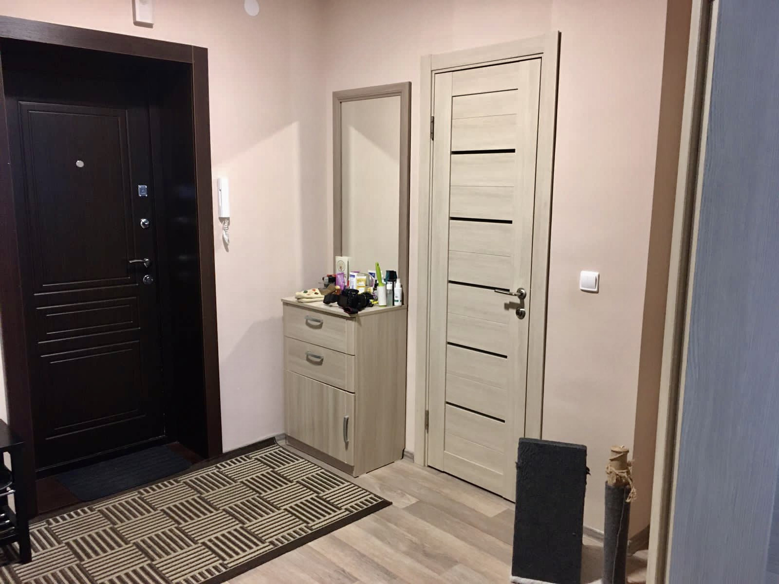 В ванной и туалете на стенах кафель, на полу керамогранит, в комнате ламинат, в прихожей и кухне линолеум. Качественные обои Erismann под покраску. В квартире остаётся кухонный гарнитур, прихожая, тумба и шкафчик с зеркалом в ванной, остальная мебель и техника по договорённости.