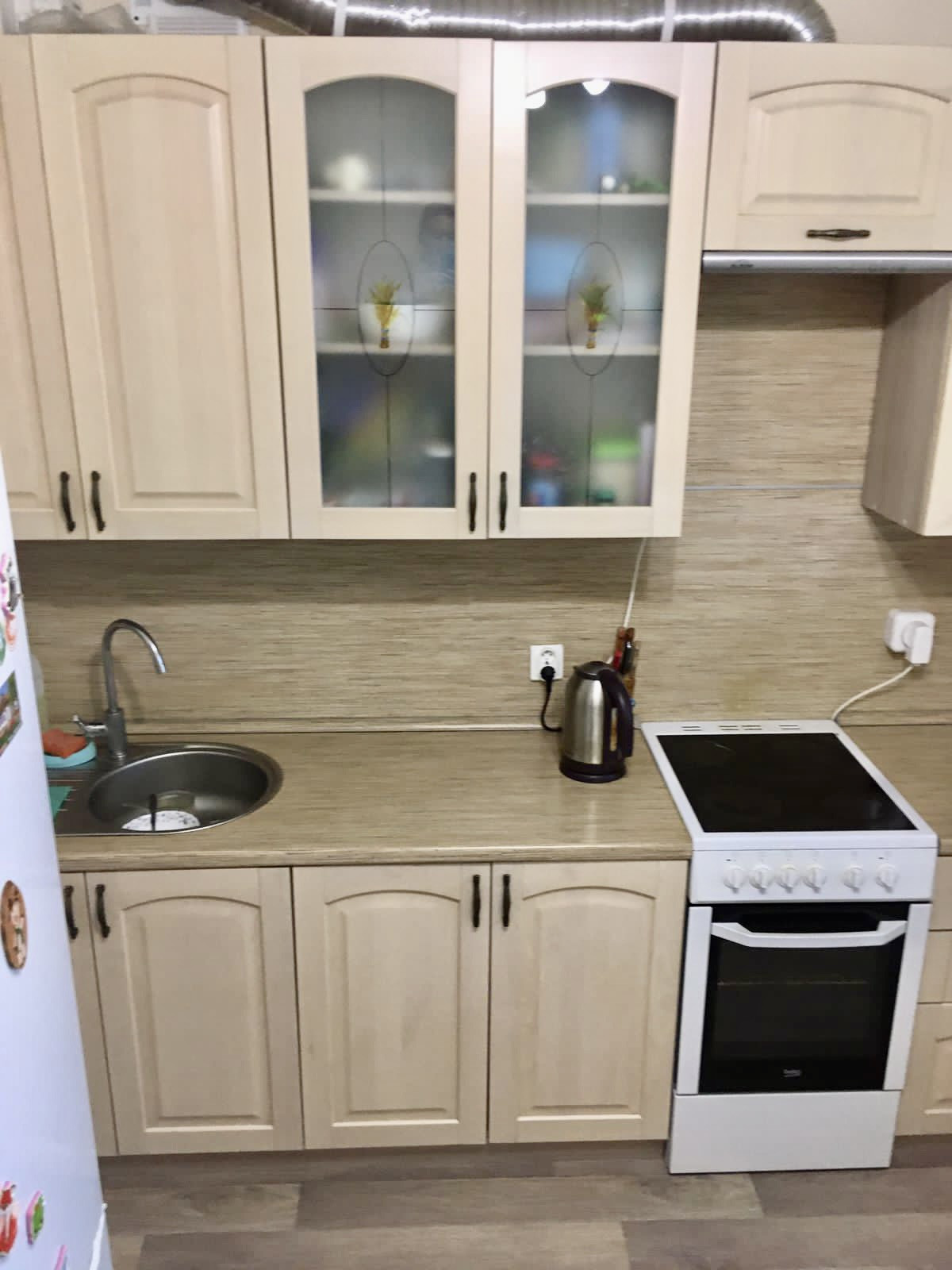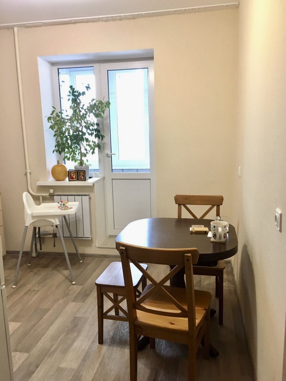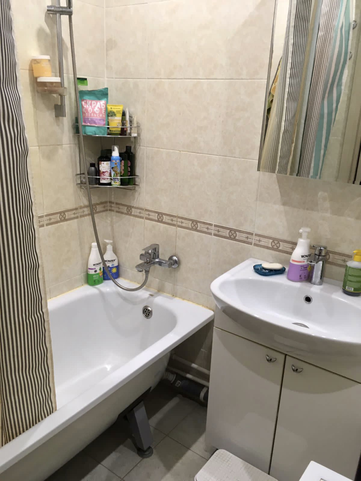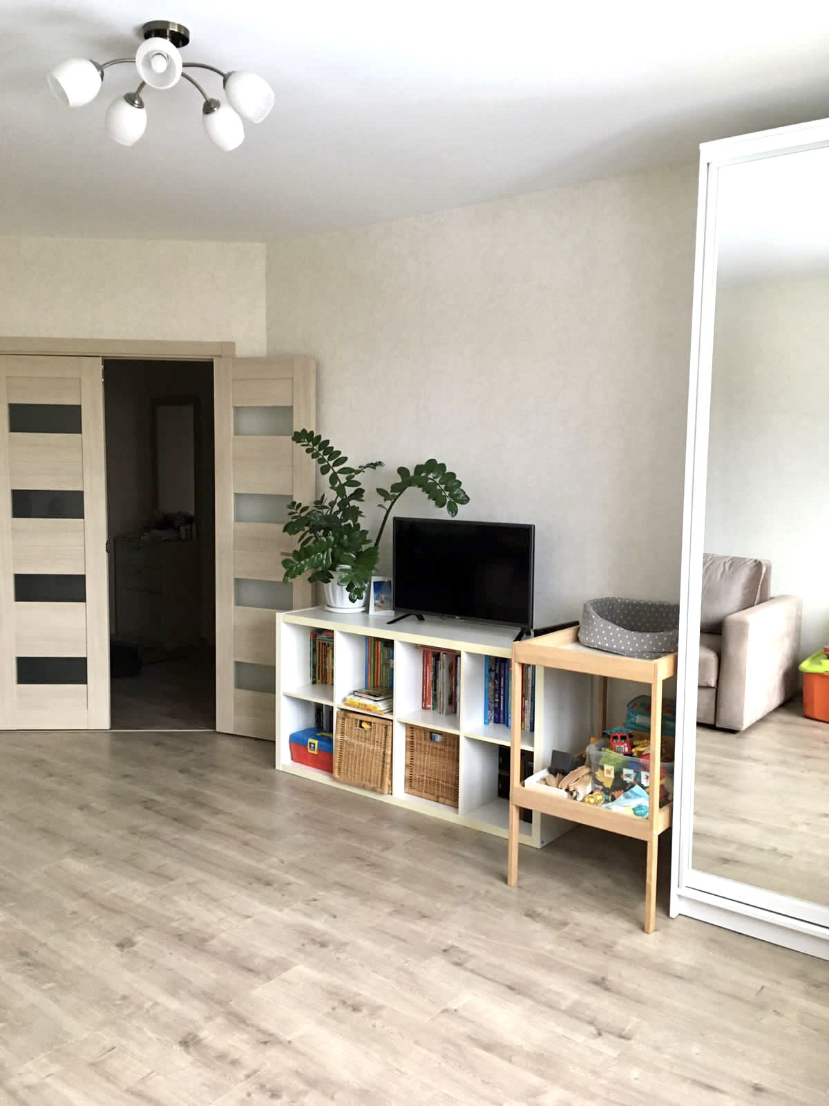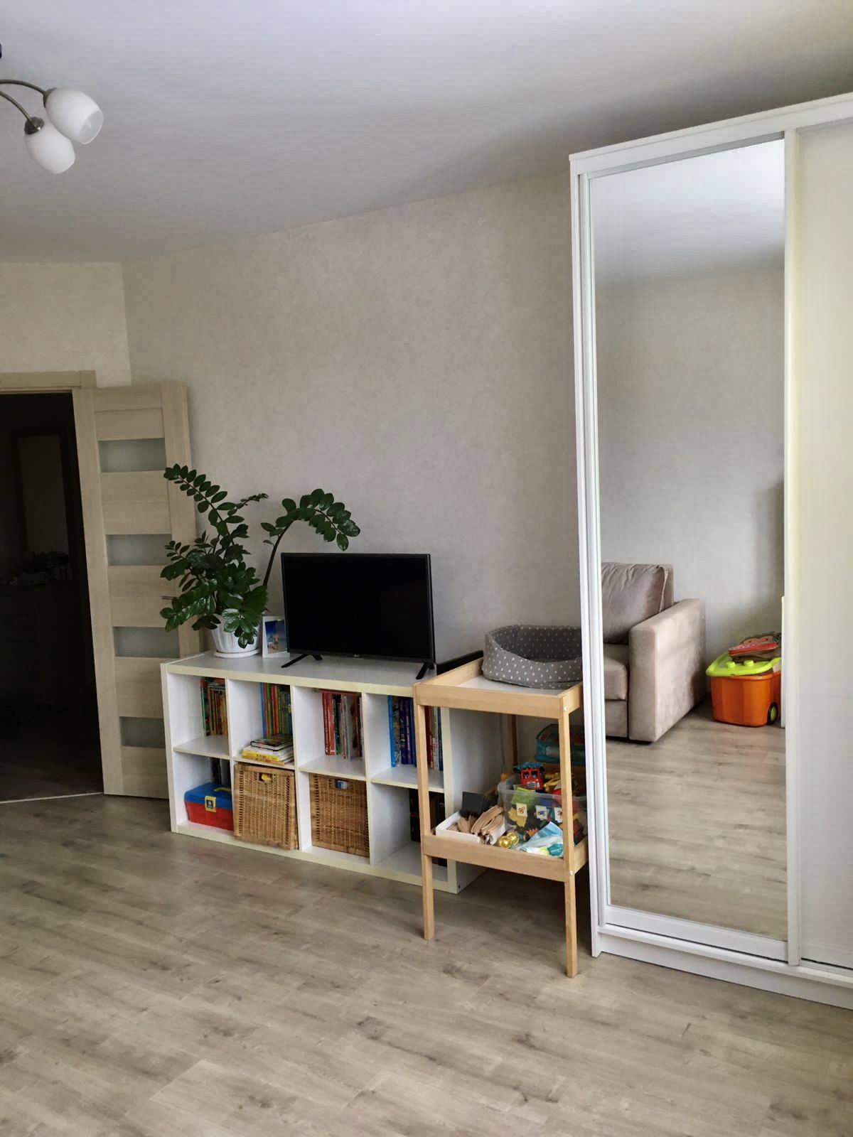 В ванной и туалете на стенах кафель, на полу керамогранит, в комнате ламинат, в прихожей и кухне линолеум. Качественные обои Erismann под покраску. В квартире остаётся кухонный гарнитур, прихожая, тумба и шкафчик с зеркалом в ванной, остальная мебель и техника по договорённости.