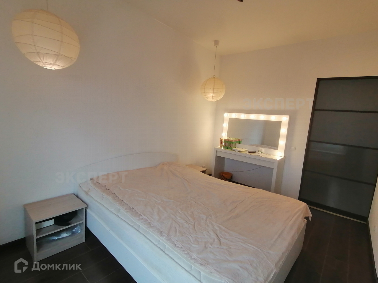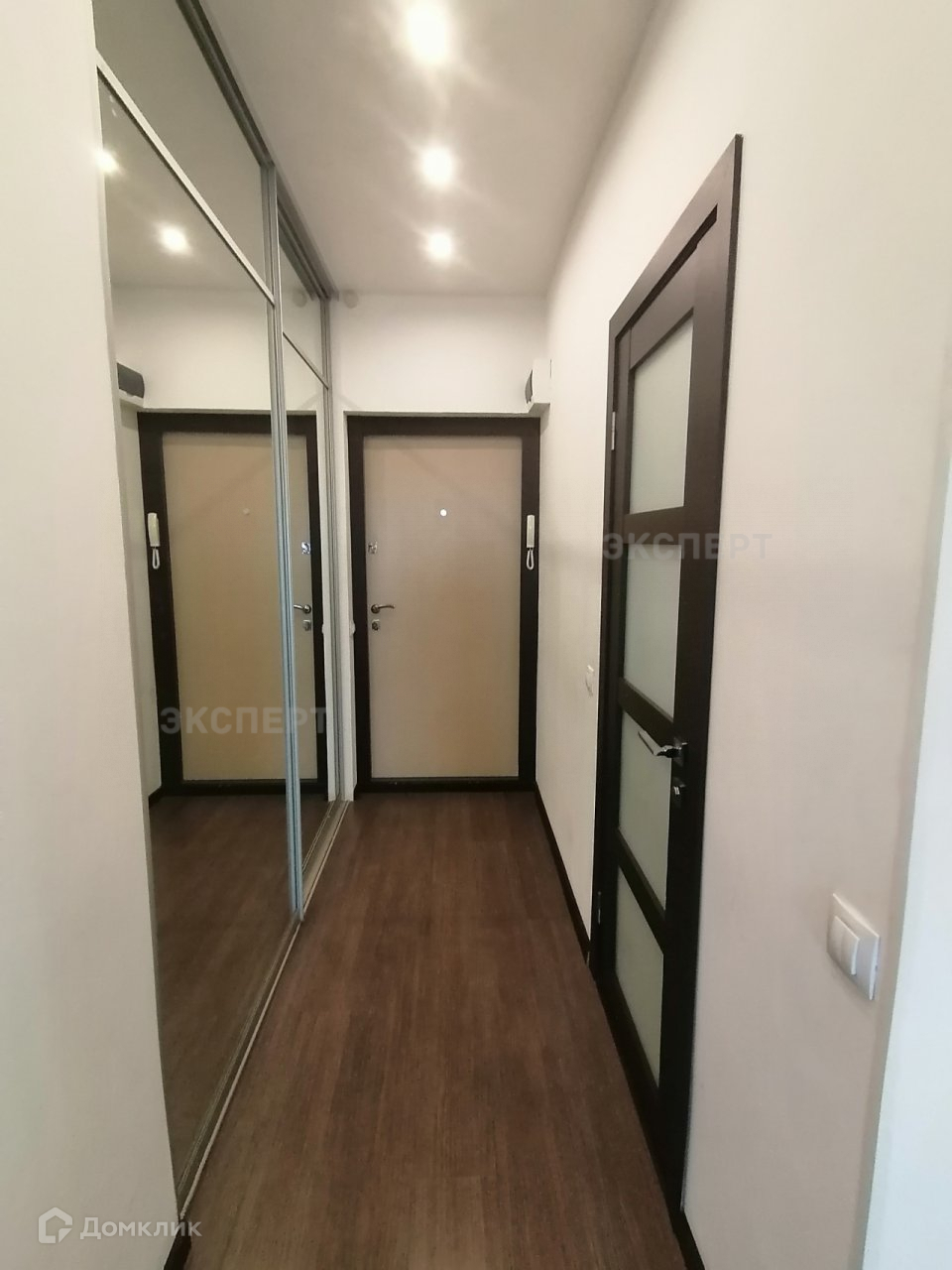 Установлена дверь-купе для входа в комнаты.В коридоре вместительный шкаф-купе.Интересное освещение в комнатах.
