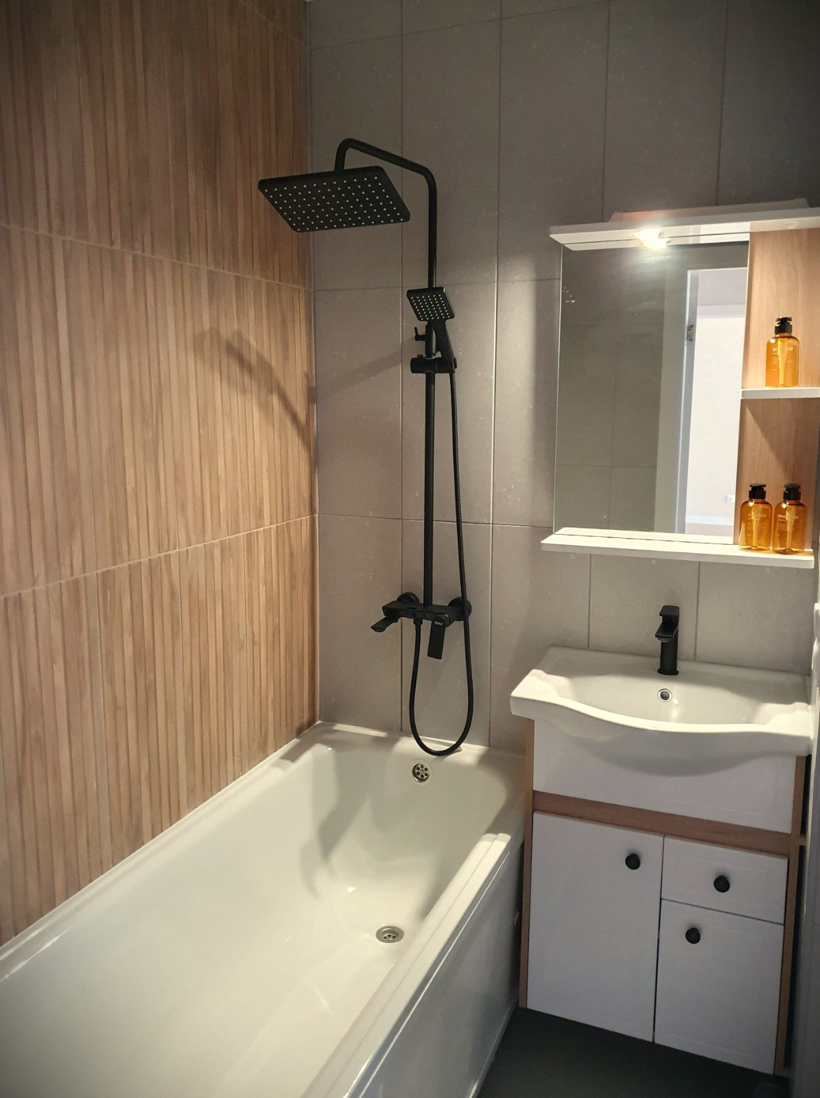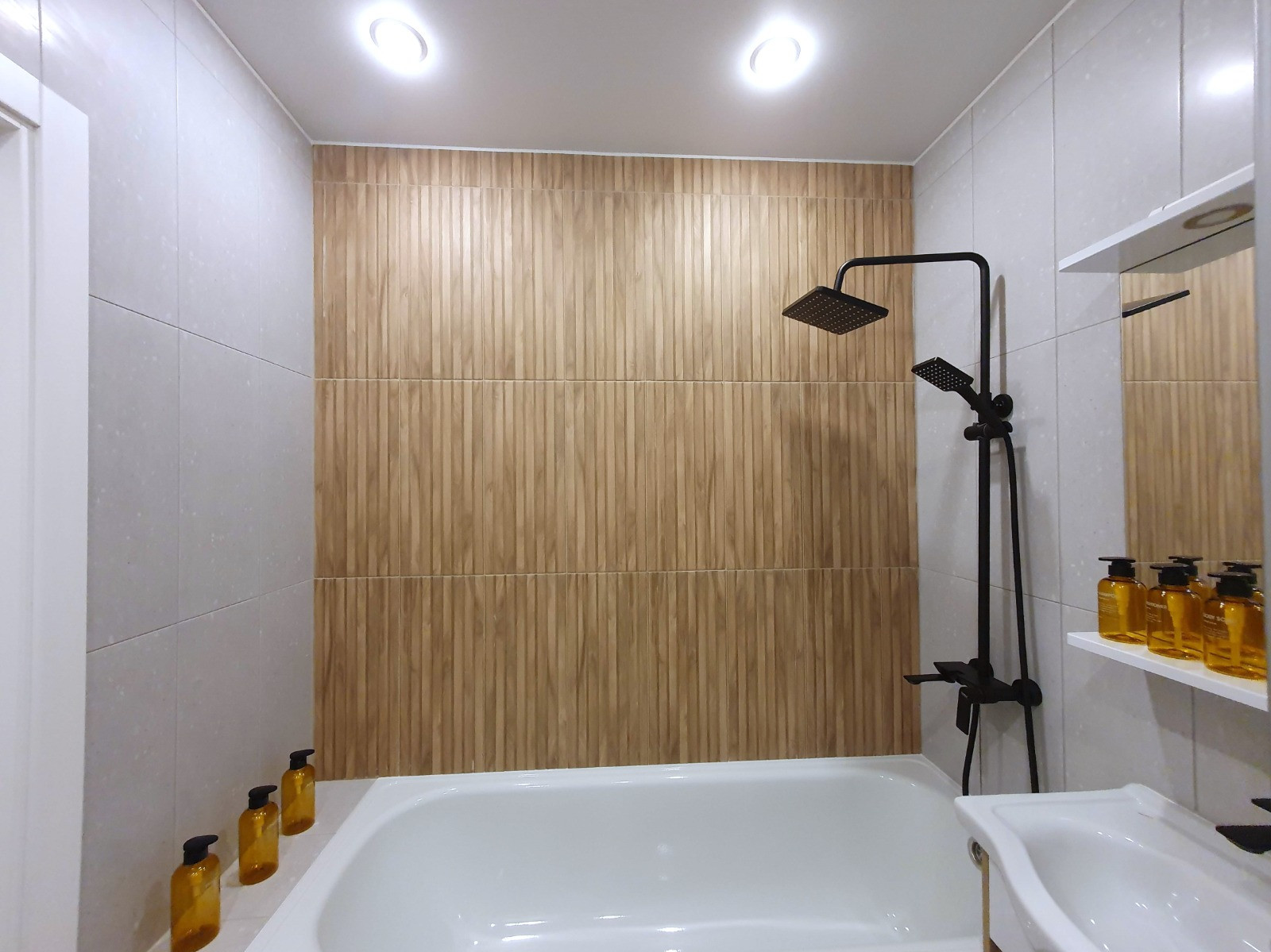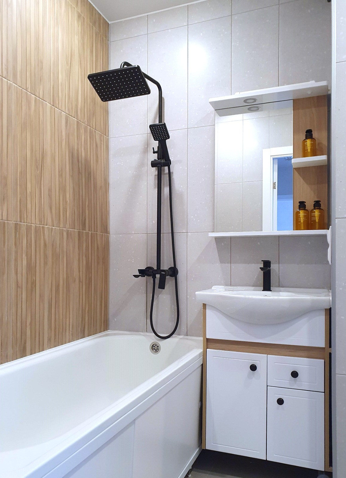Ванная комната с теплым полом, инсталляцией, тропической душевой системой, отделана современной плиткой в стиле «Терраццо» и под натуральный дуб, в тон кухонного гарнитура и ламината.