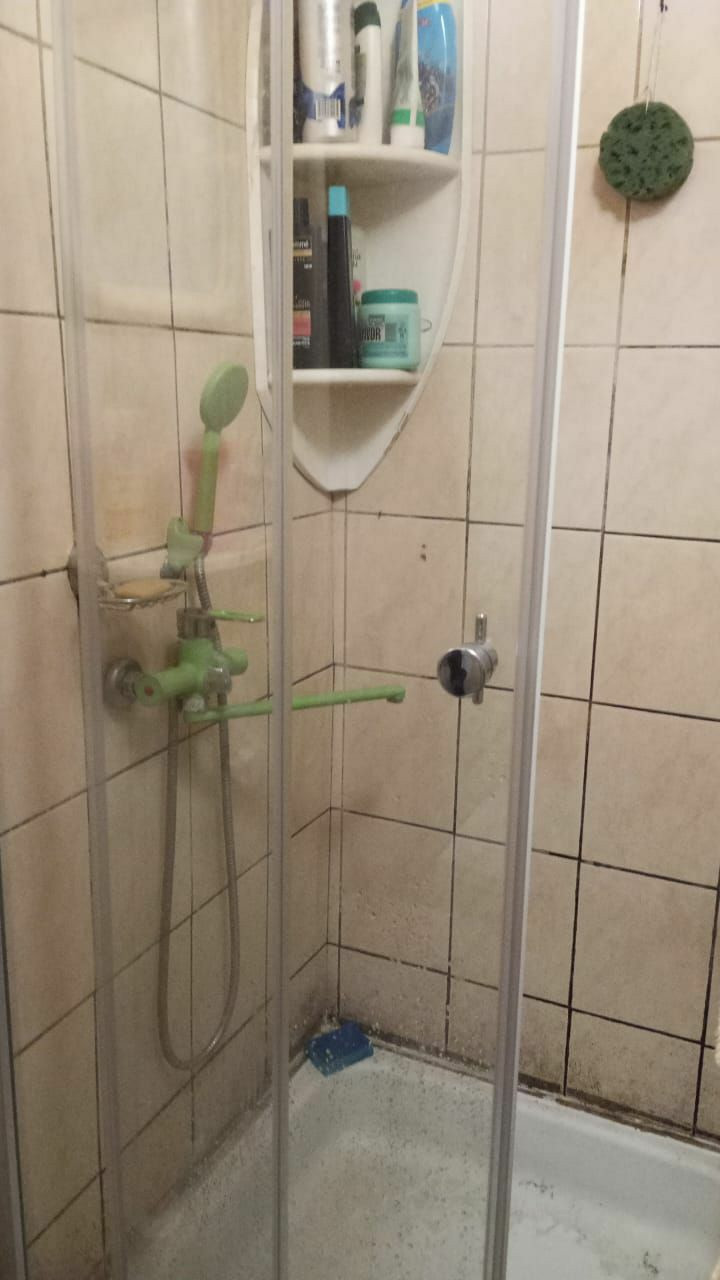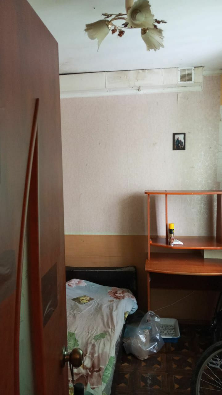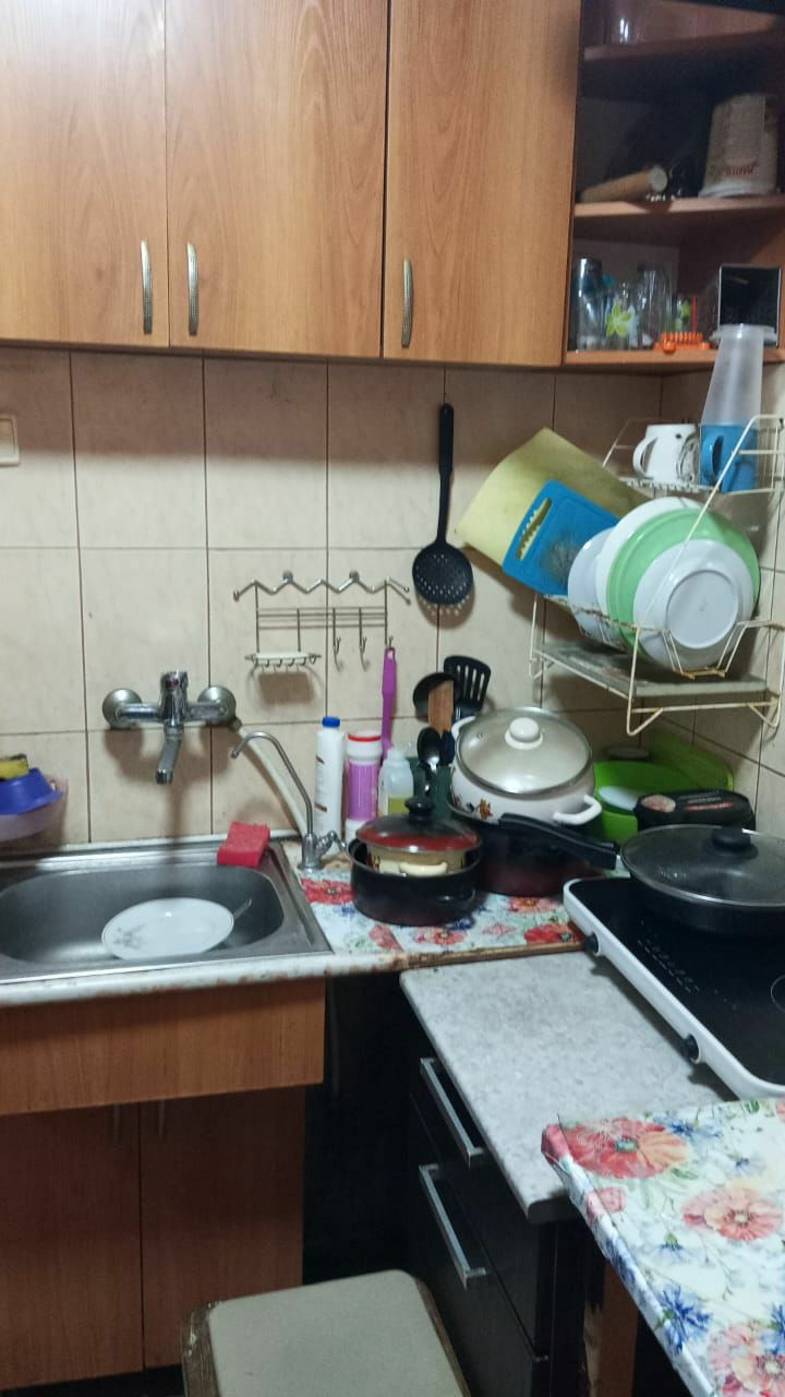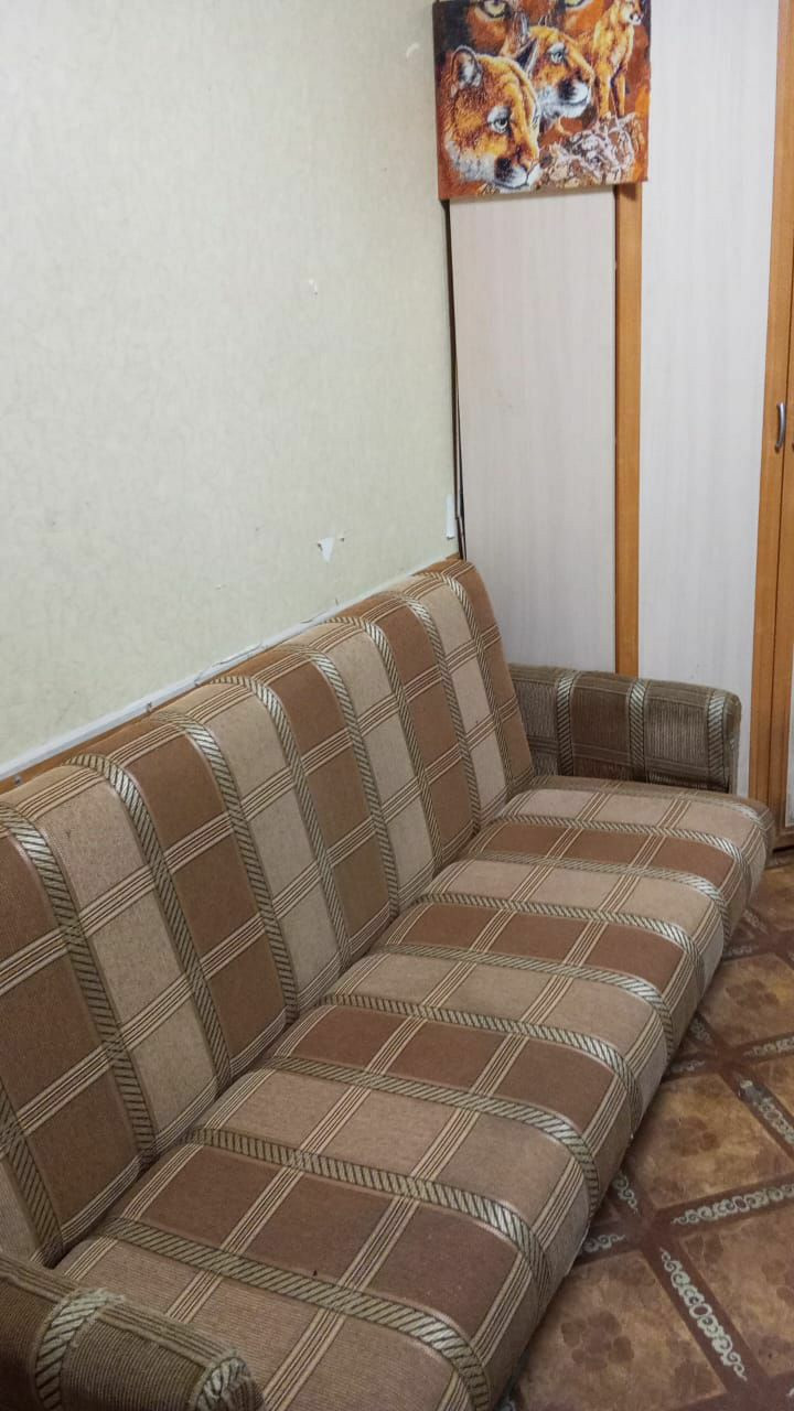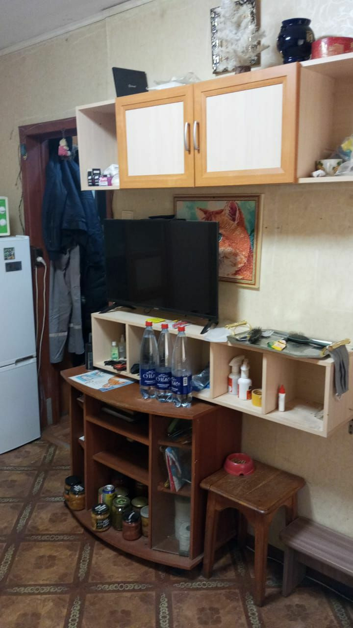 Встроенная мебель в комнате,угловой шкаф в маленькой комнате,прихожая. Санузел совмещенный,душевая кабина,бойлер на 50 литров.Нужен косметический ремонт.