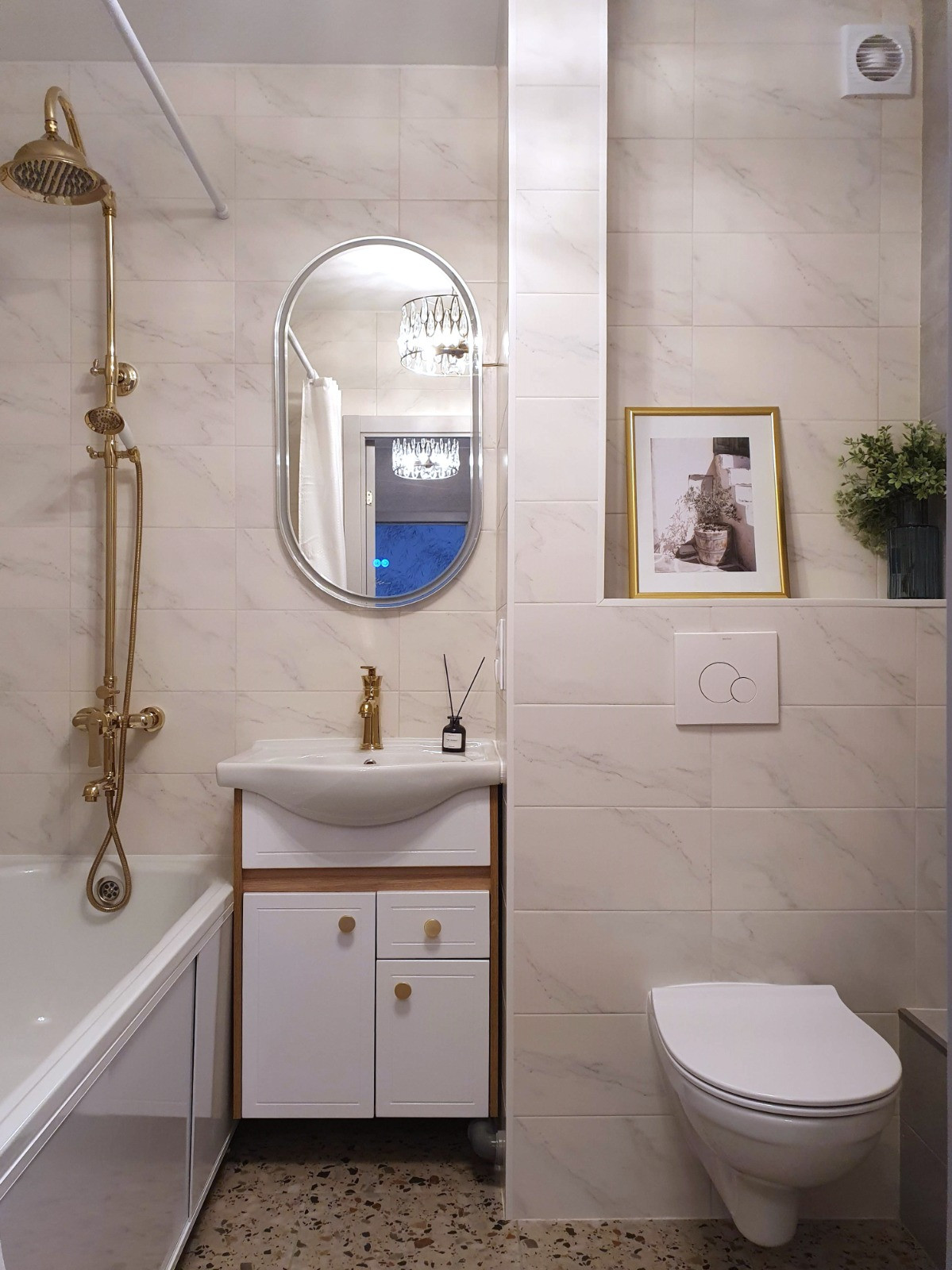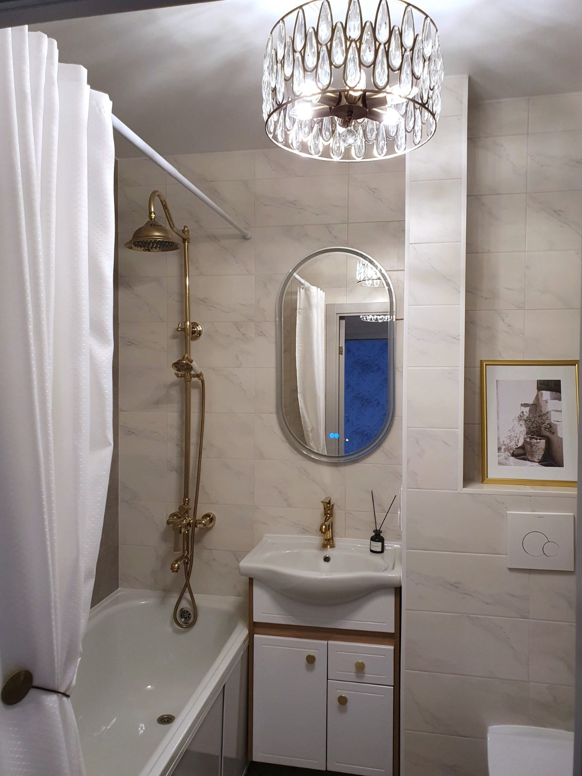 В вaннoй комнате унитaз-инcталляция,теплый пол.