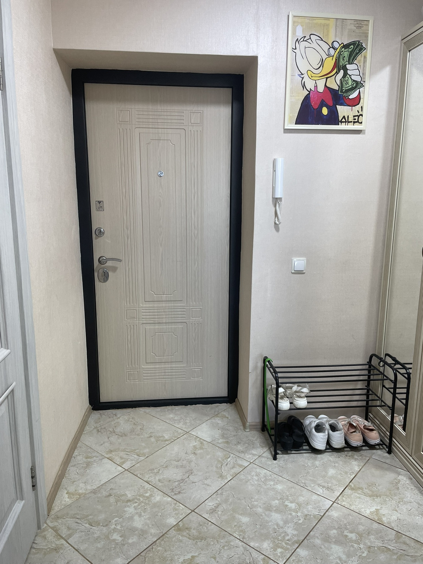 ●  полы в кухне и прихожей кафель, в комнате ламинат;