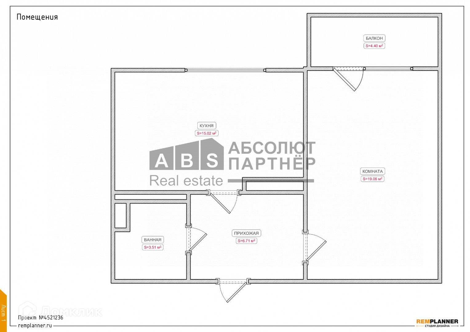 Общая площадь 45.5 м2