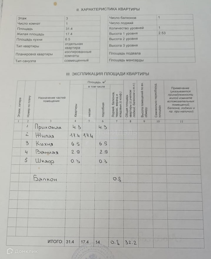 Общая площадь 31.4 м2