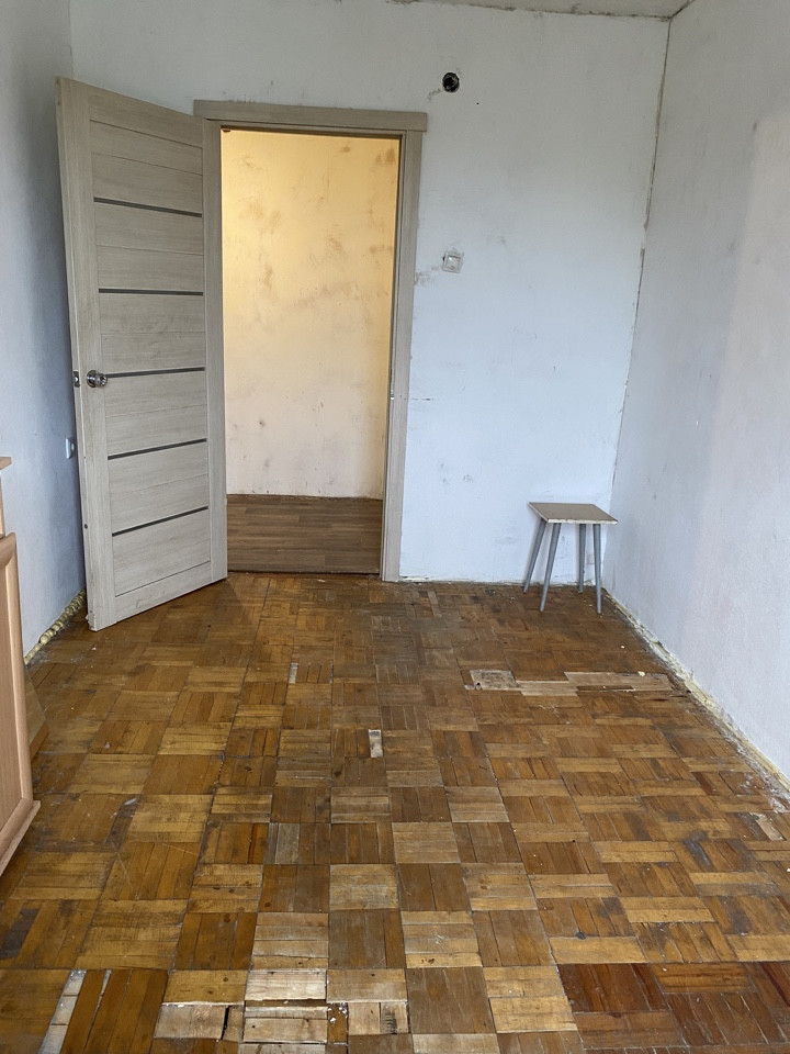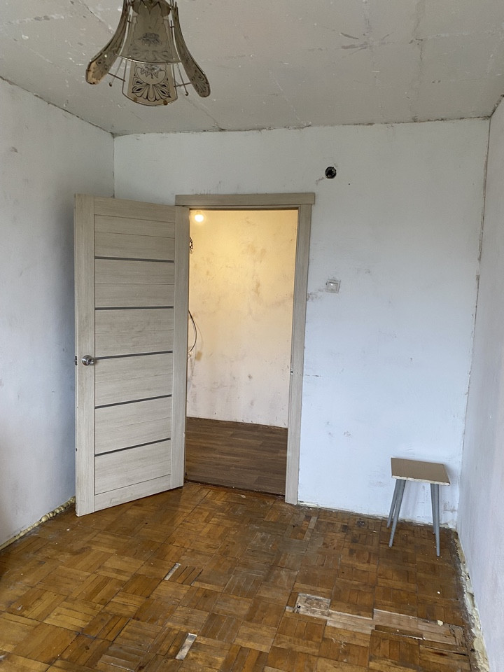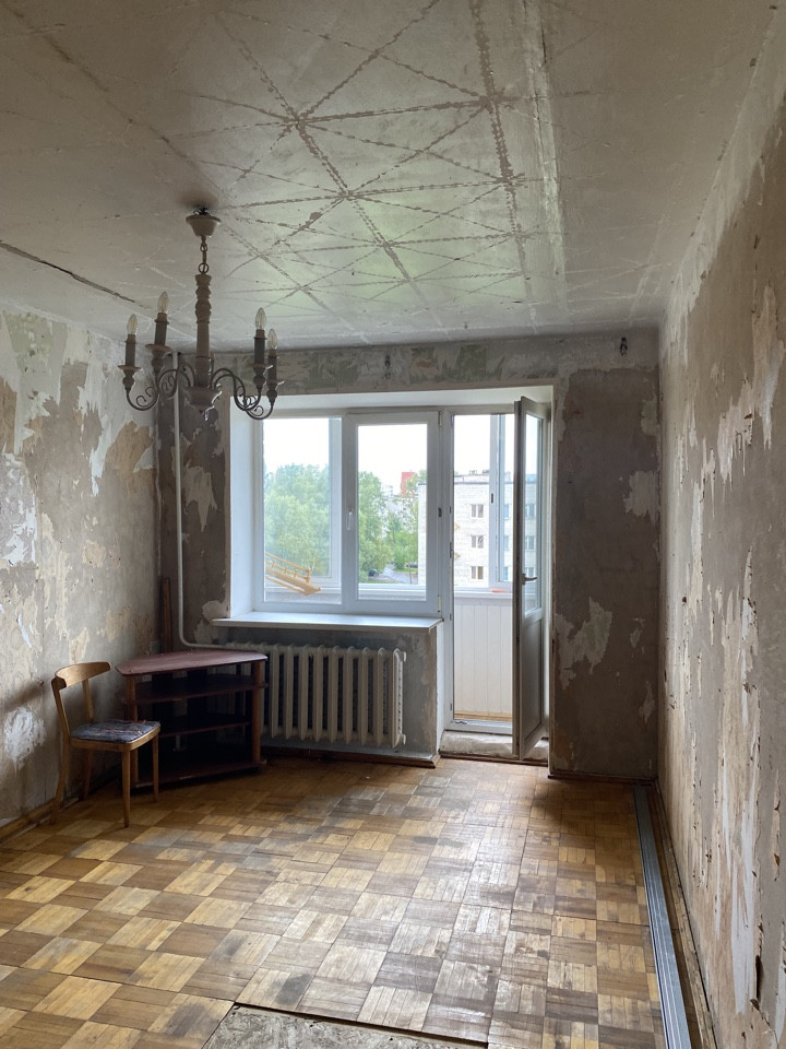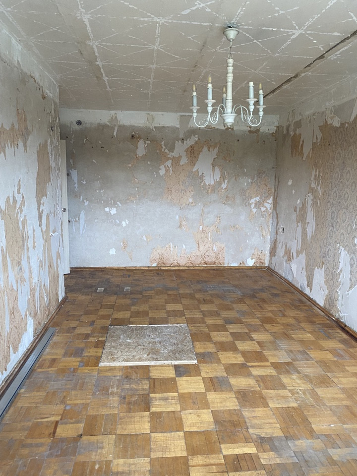 Подготовлена под ремонт: сняты обои и потолки, частично выровнены стены.