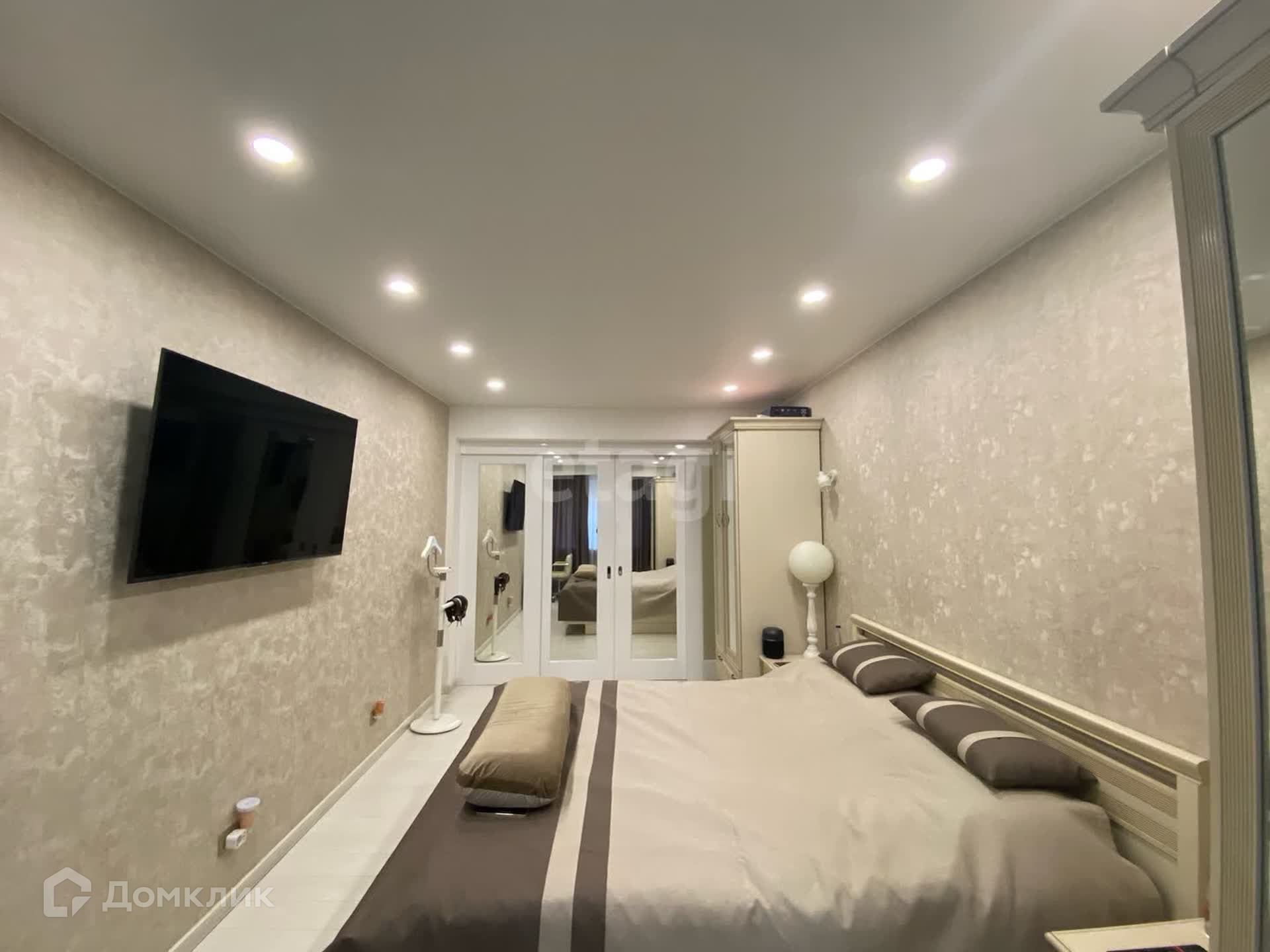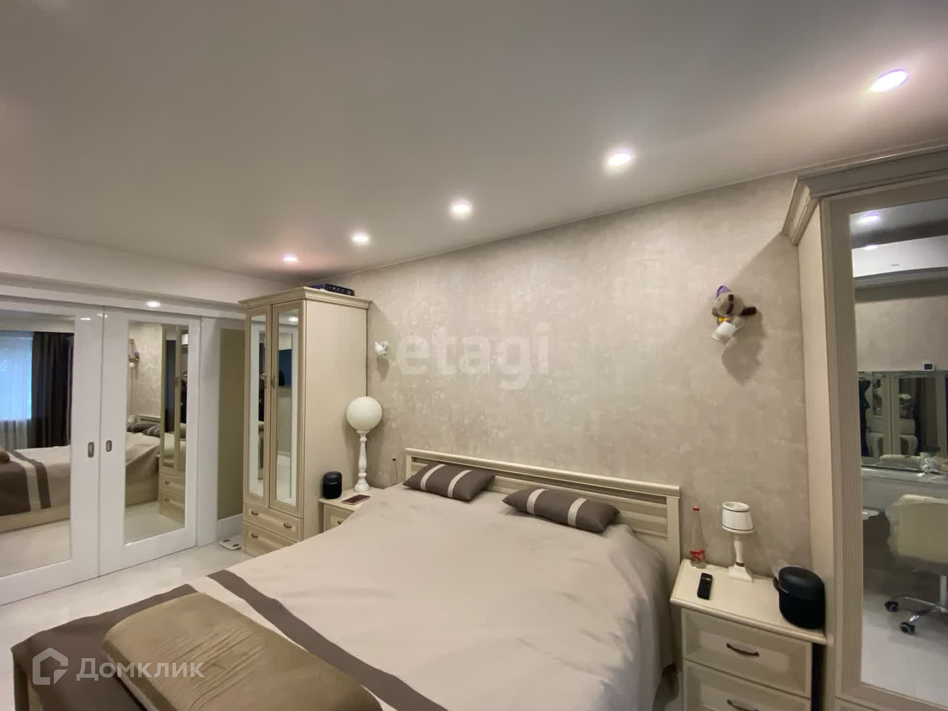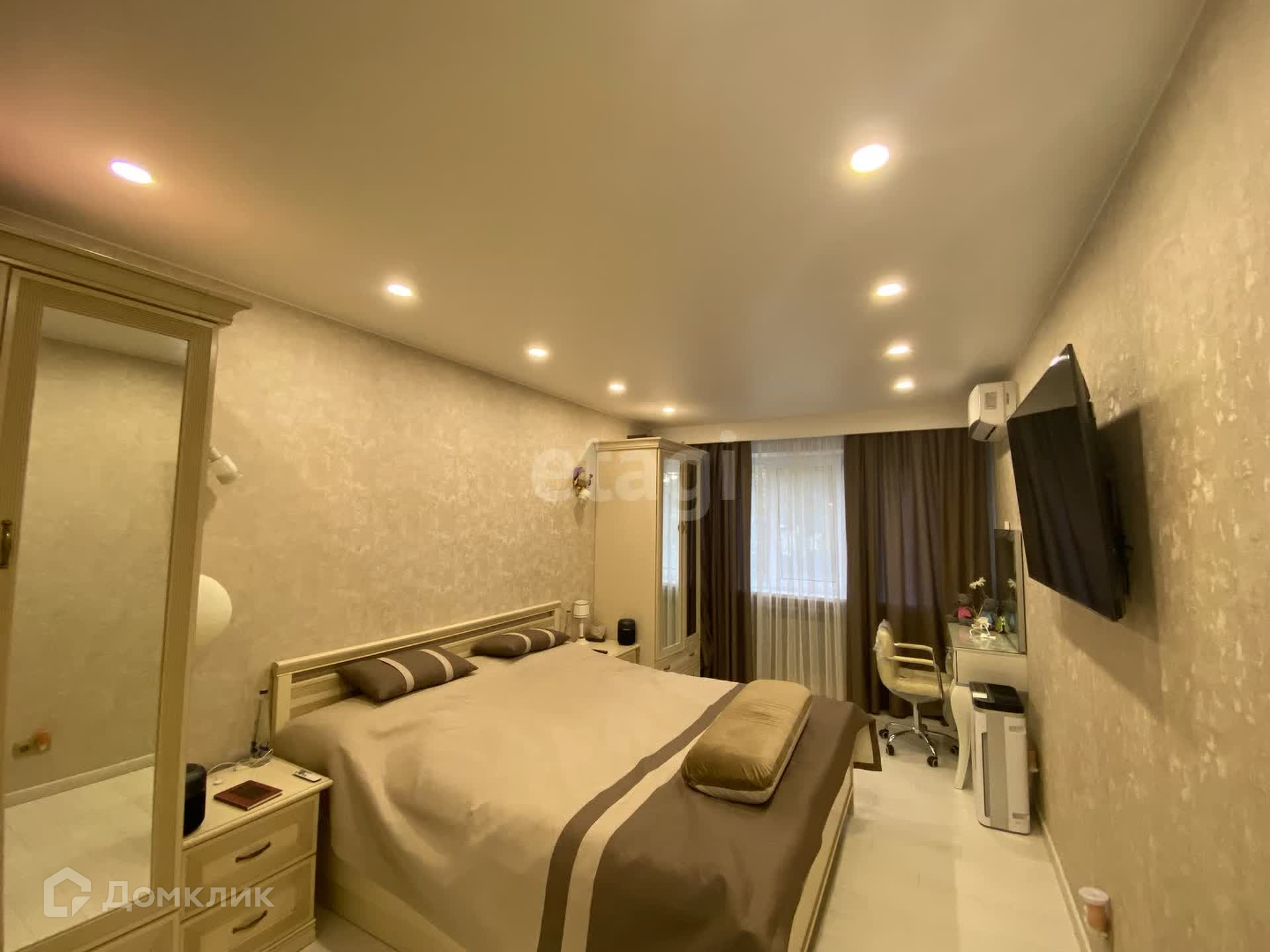 Комната правильной геометрической формы, площадью 17.1 м2, здесь удачно разместили двуспальную кровать с качественным матрасом, два шкафа для одежды, прикроватные тумбочки и туалетный столик. Прият