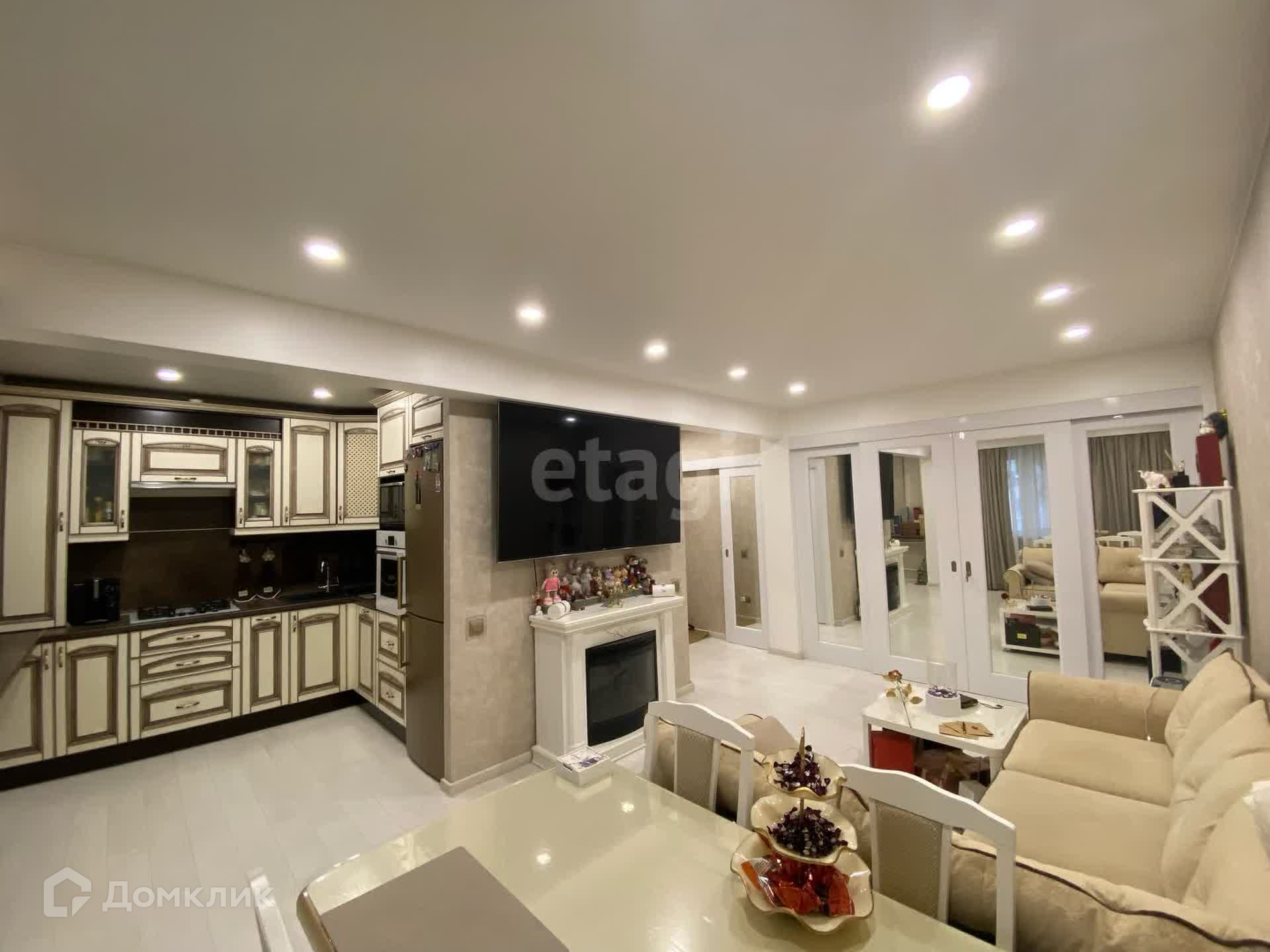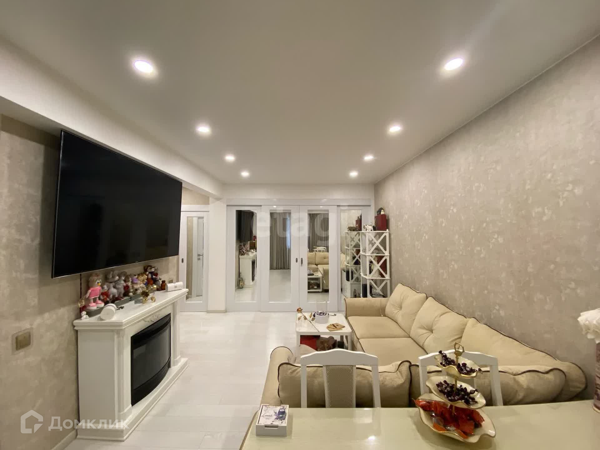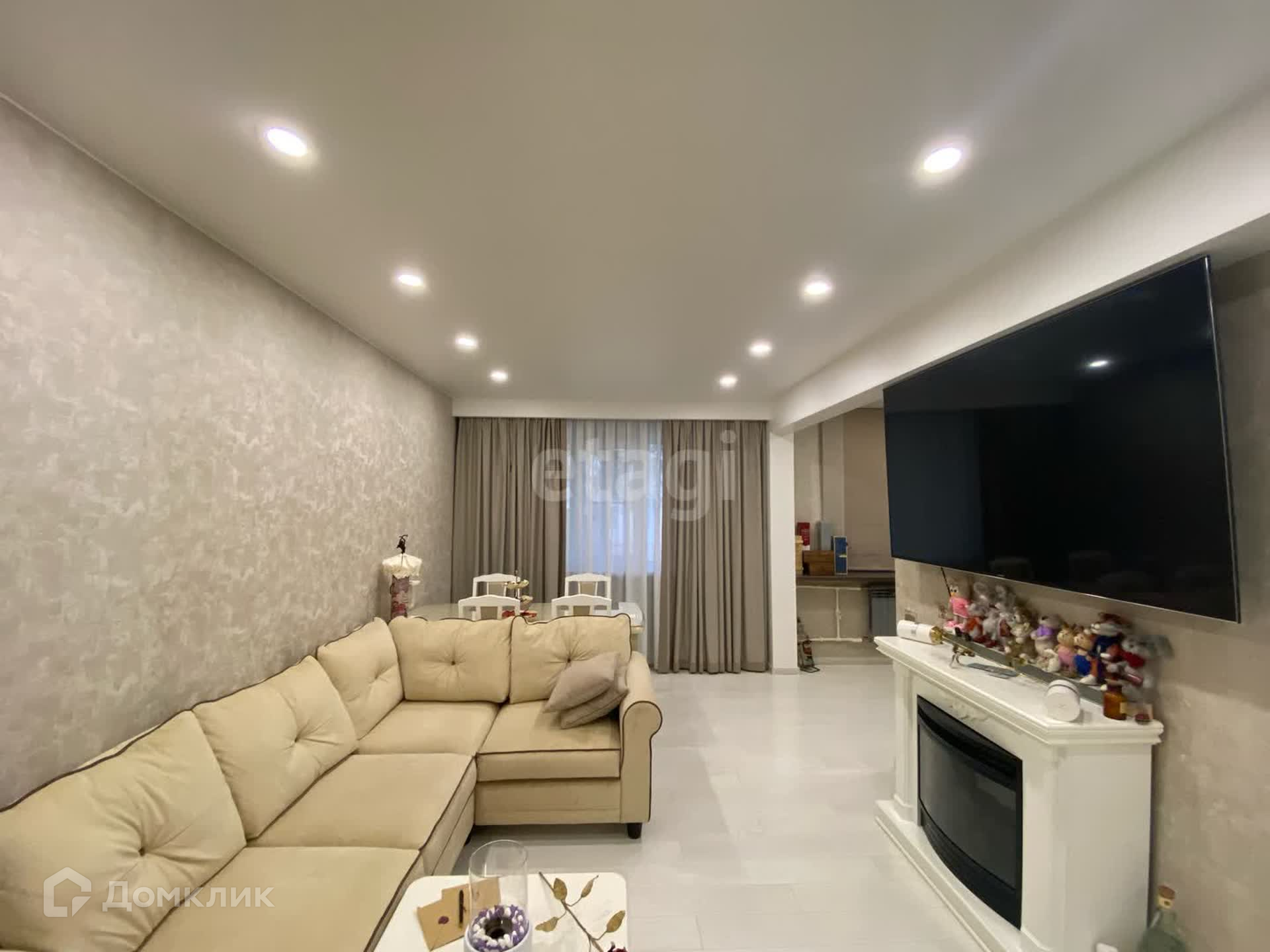Просторная комната площадью 19 м2, в которой легко поместился просторный диван и большой телевизор на стене, для того, чтобы собираться всей семьёй за просмотром любимого фильма! Наличие камина придаёт данной комнате особенный уют.