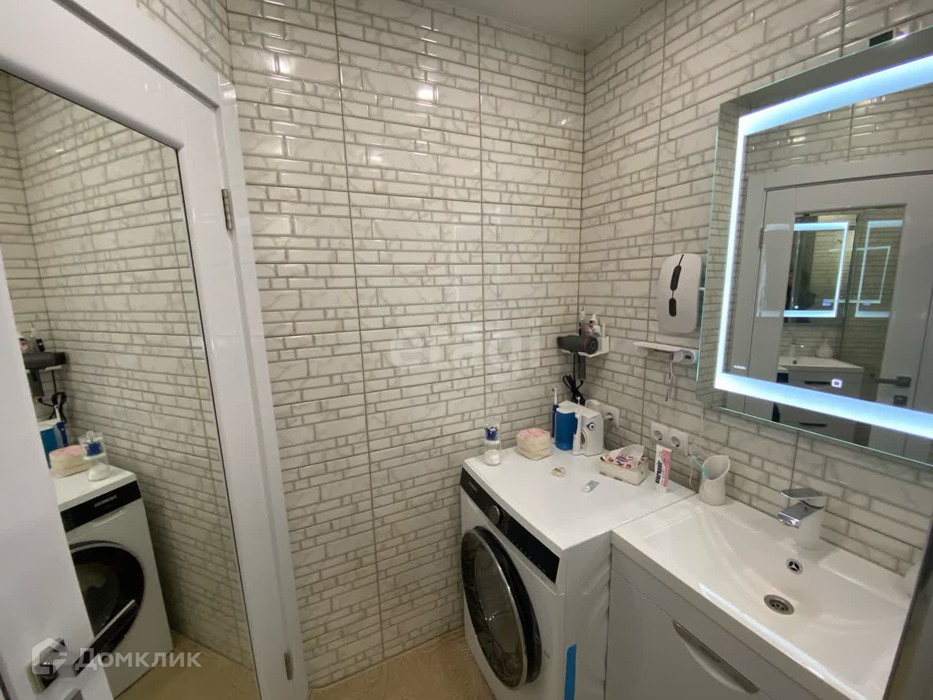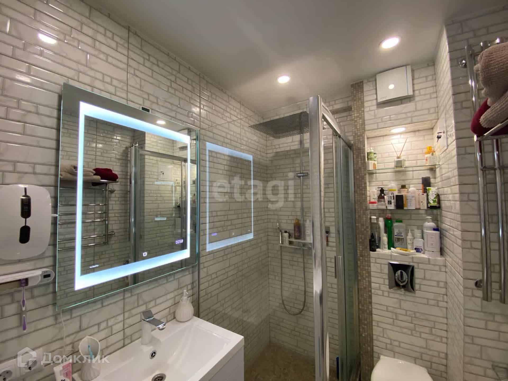 Санузел совмещённый. На польное и настенное покрытие плитка. Расположена душевая кабинка с тропическим душем, стиральная машинка, зеркало с подсветкой. Установлена хорошая, качественная сантехника, а так же датчики против залива.
