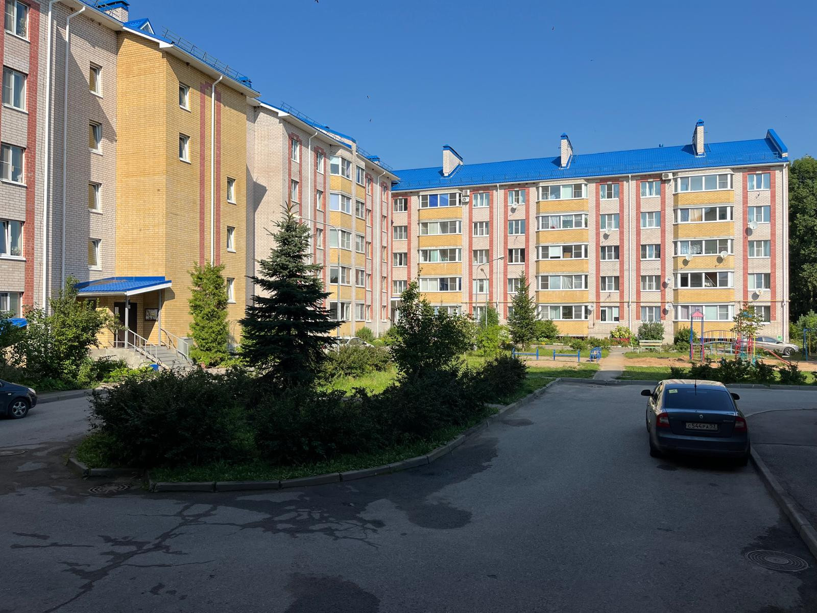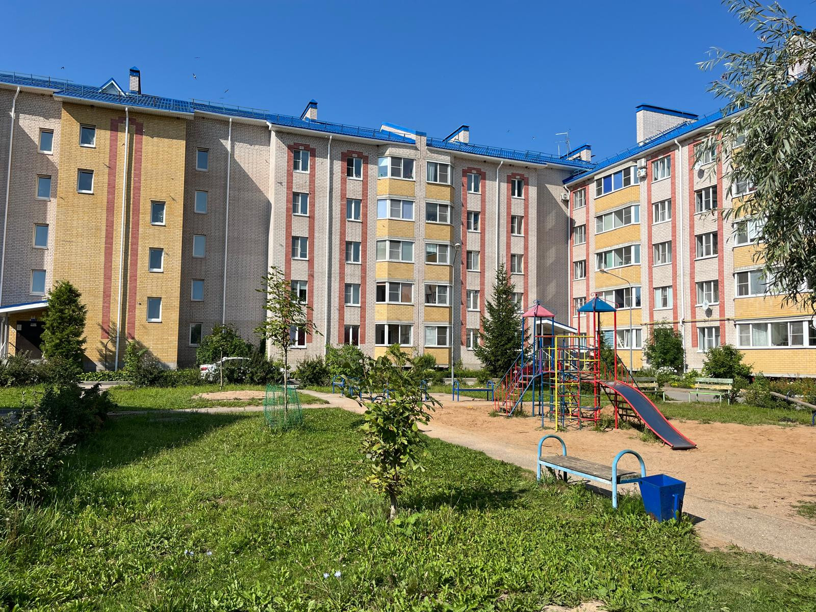 Двор чистый, зеленый, с детской площадкой и большой парковкой.