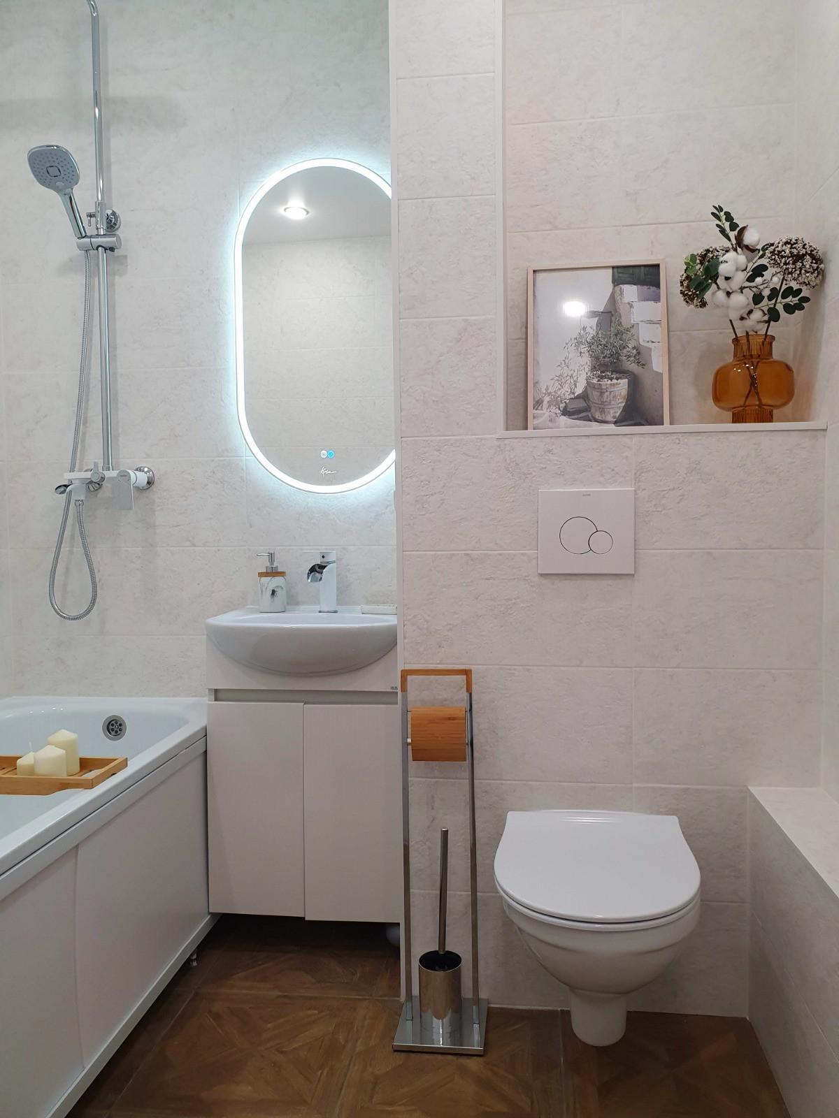 В ванной теплый пoл и тpопичeский душ.