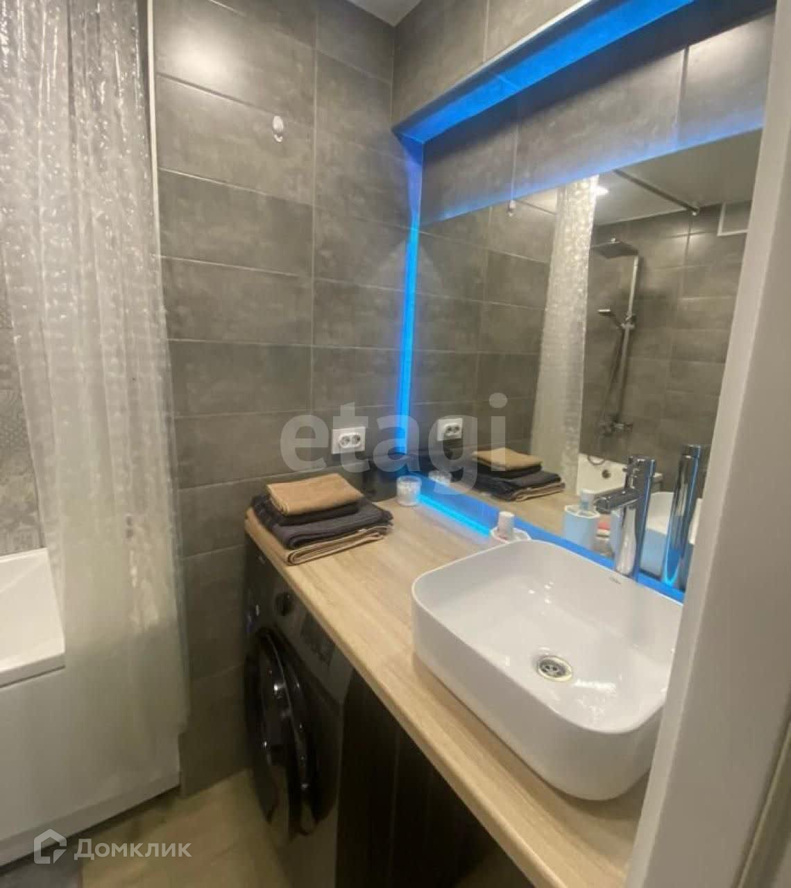 Стиральная машину аккуратно установлена под столешницей с раковиной, что экономит место и добавляет удобства в использовании.