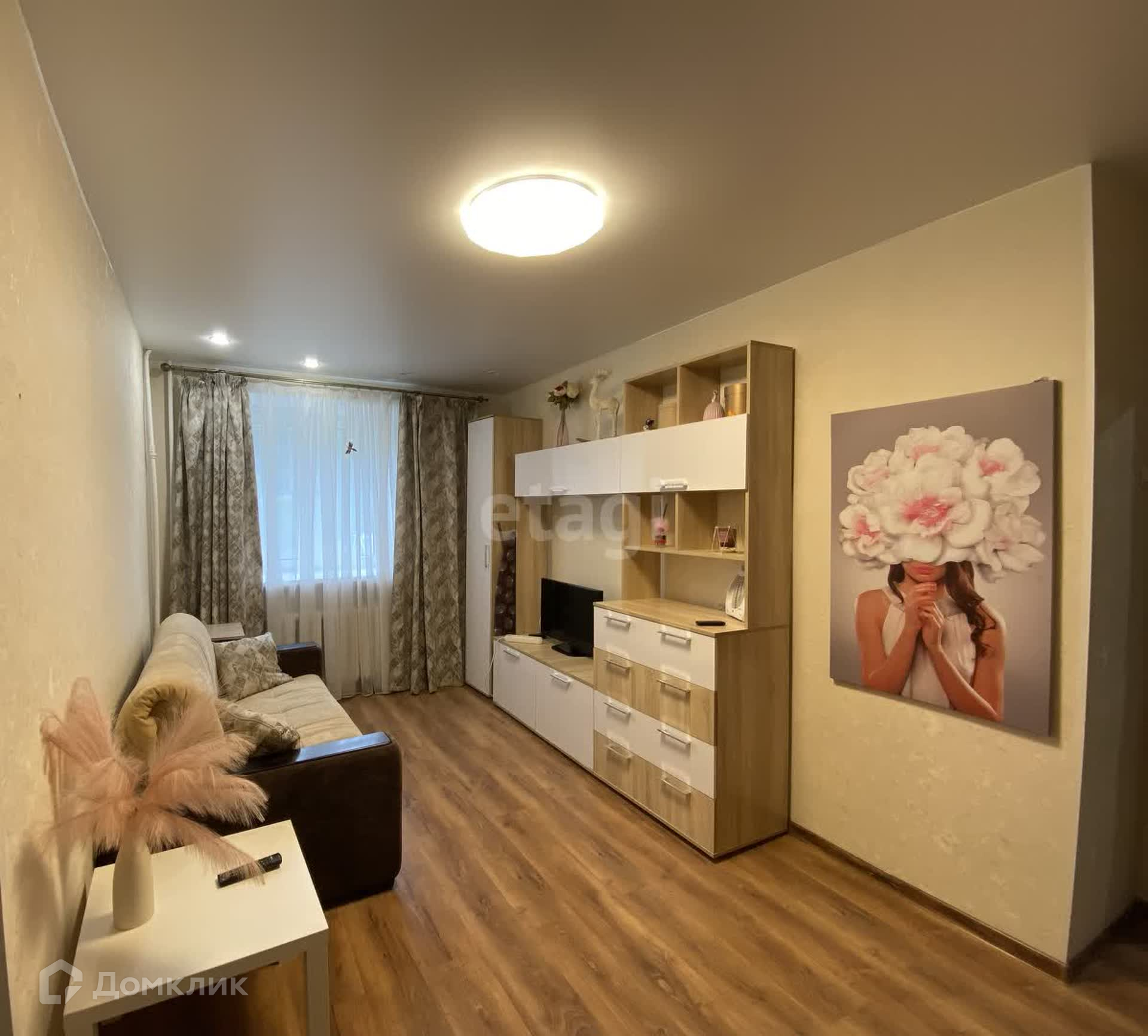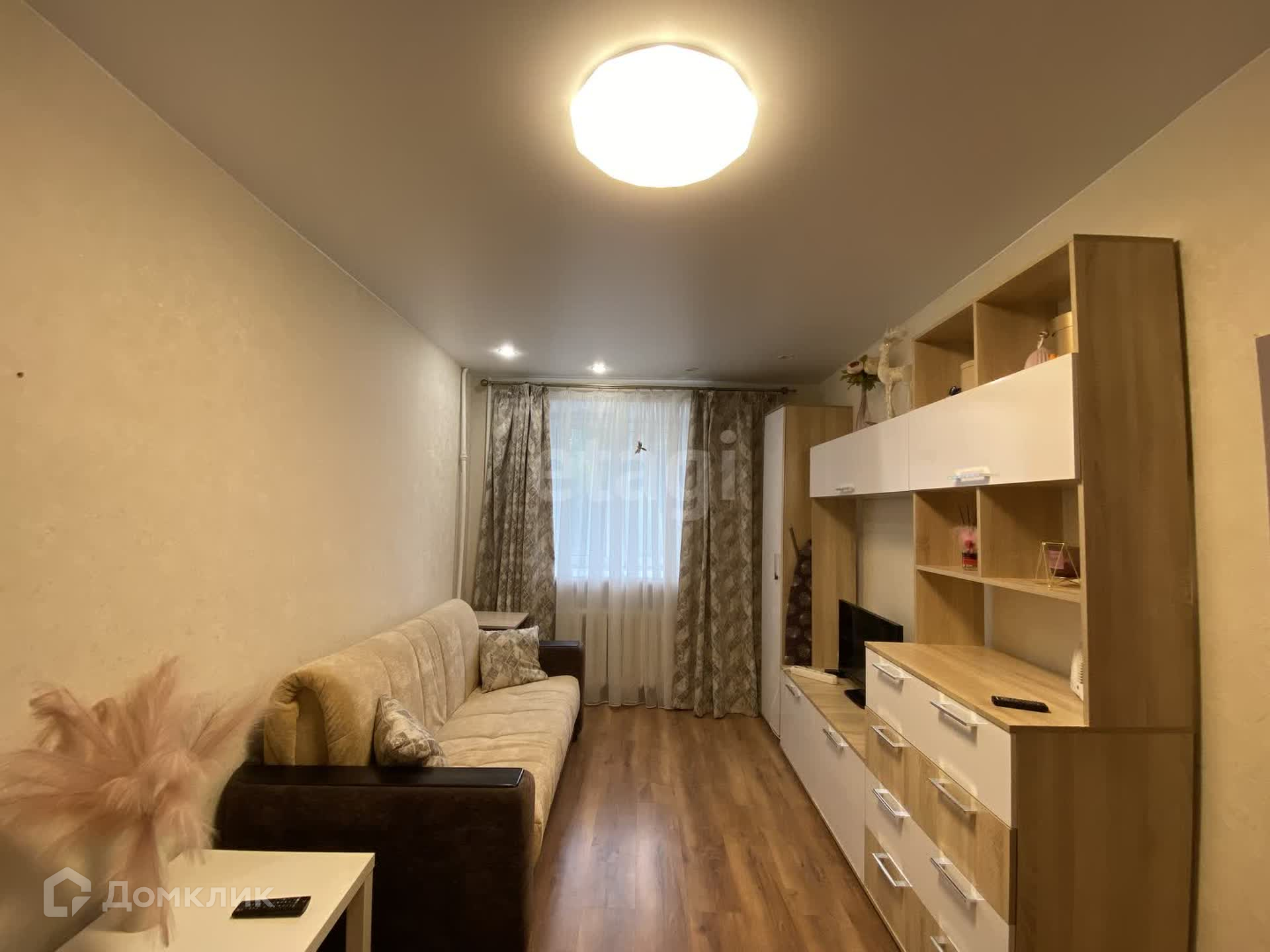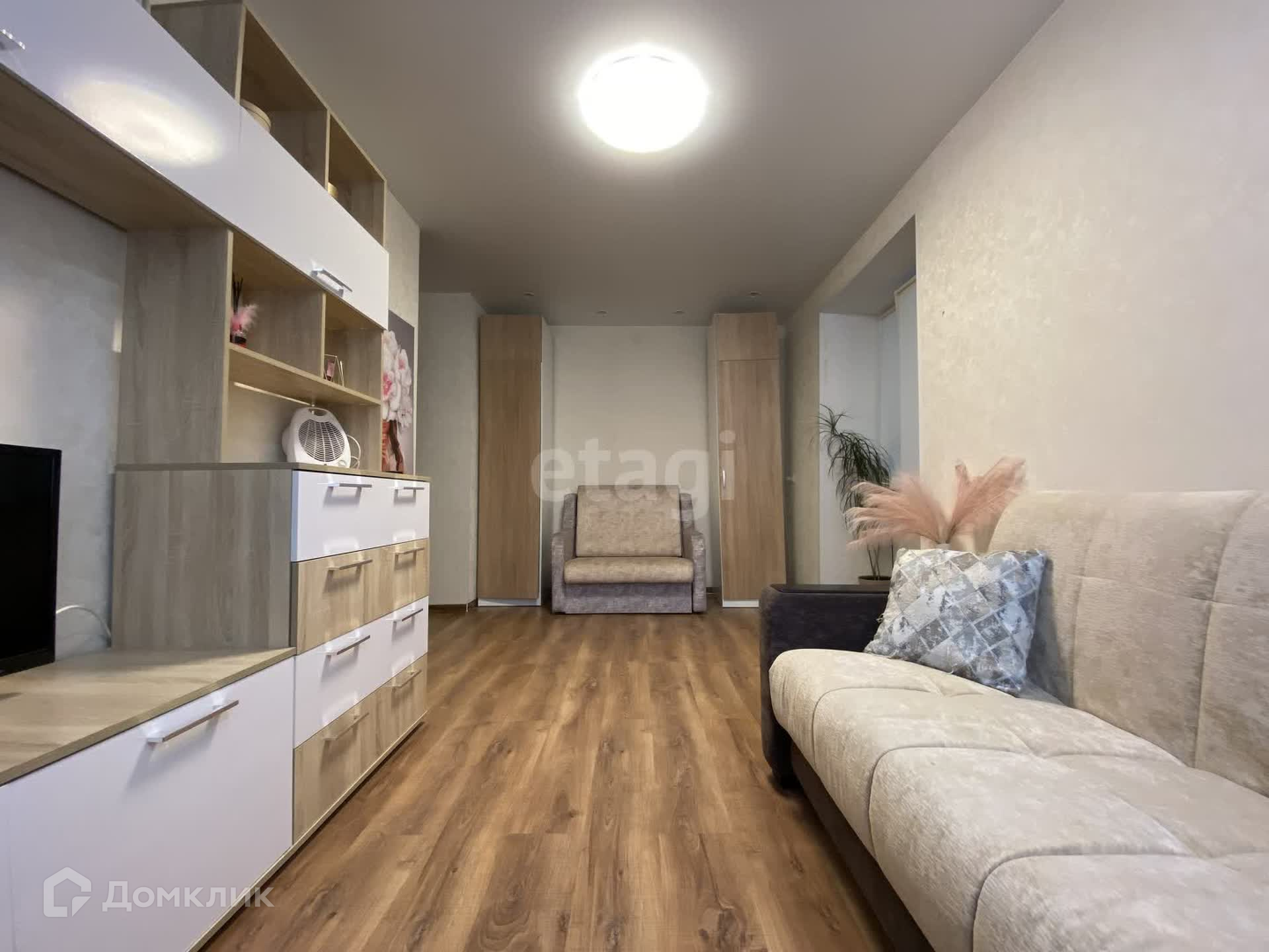 Здесь отлично расположился диван и телевизор, что позволит вам собраться всей семьёй за просмотром фильма! А также есть дополнительное спальное место в виде кресла и два шкафа.