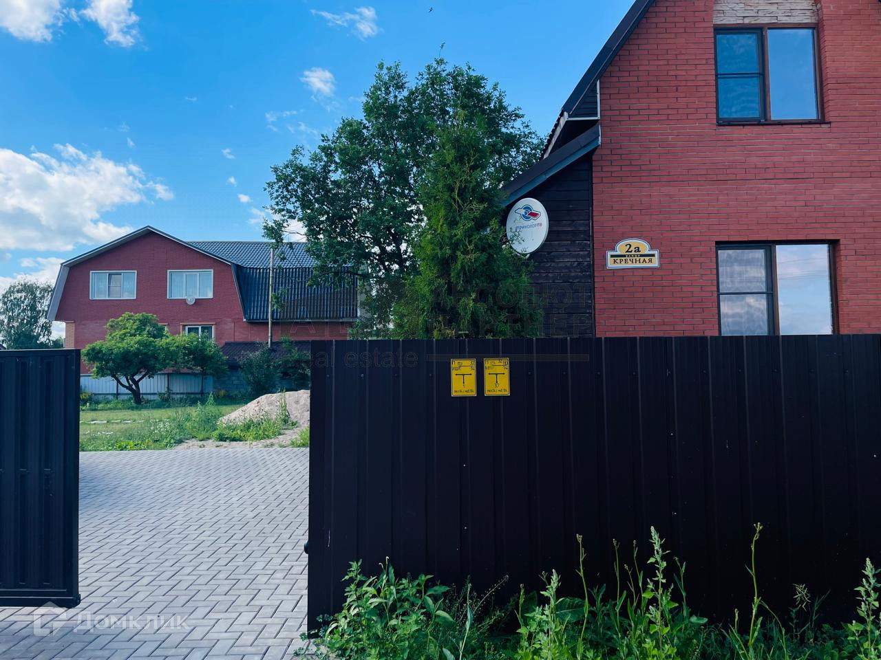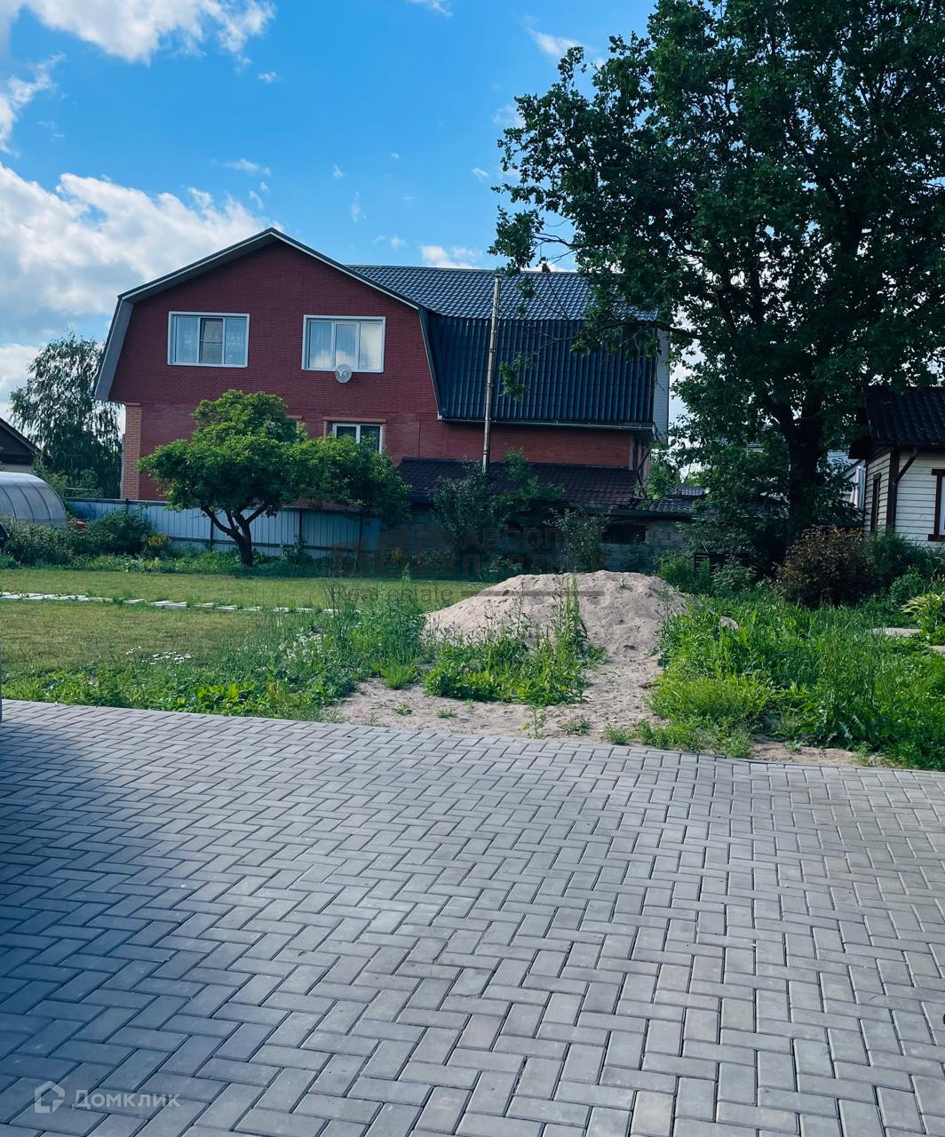 На участок сделан въезд из тротуарной плитки. Установлены откатные ворота с электроприводом. Забор по периметру. Сам участок выровнен, основная часть газон. Установлены 2 теплицы, которые убираются без проблем.